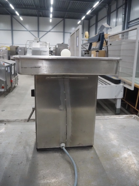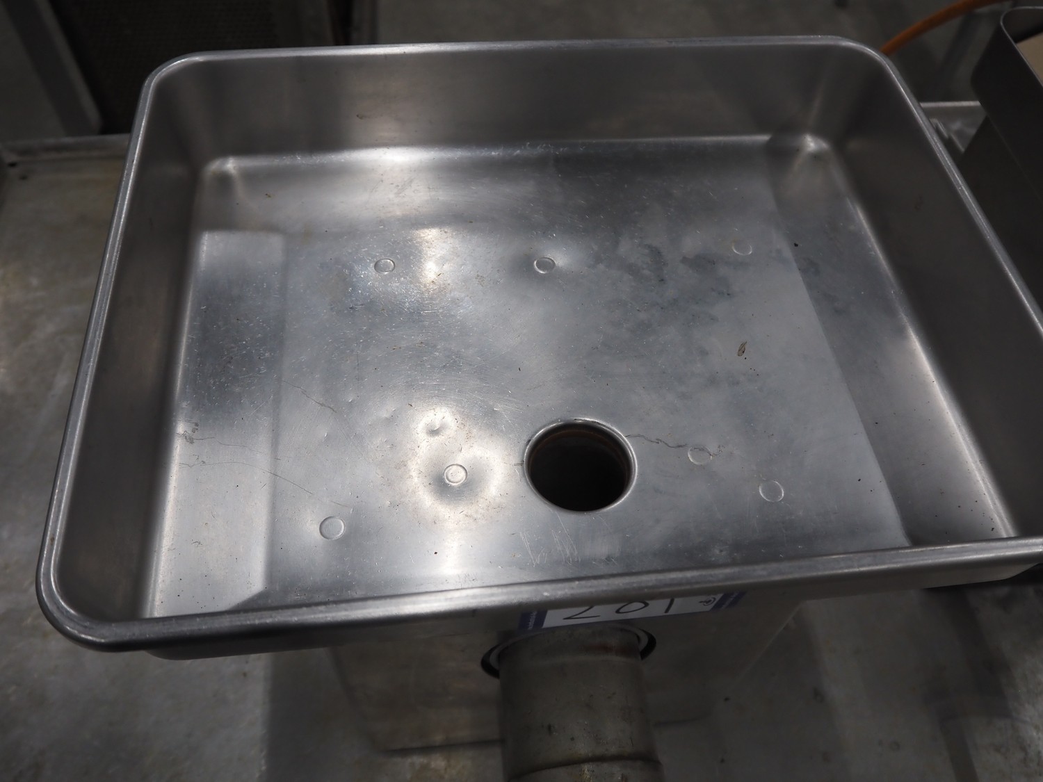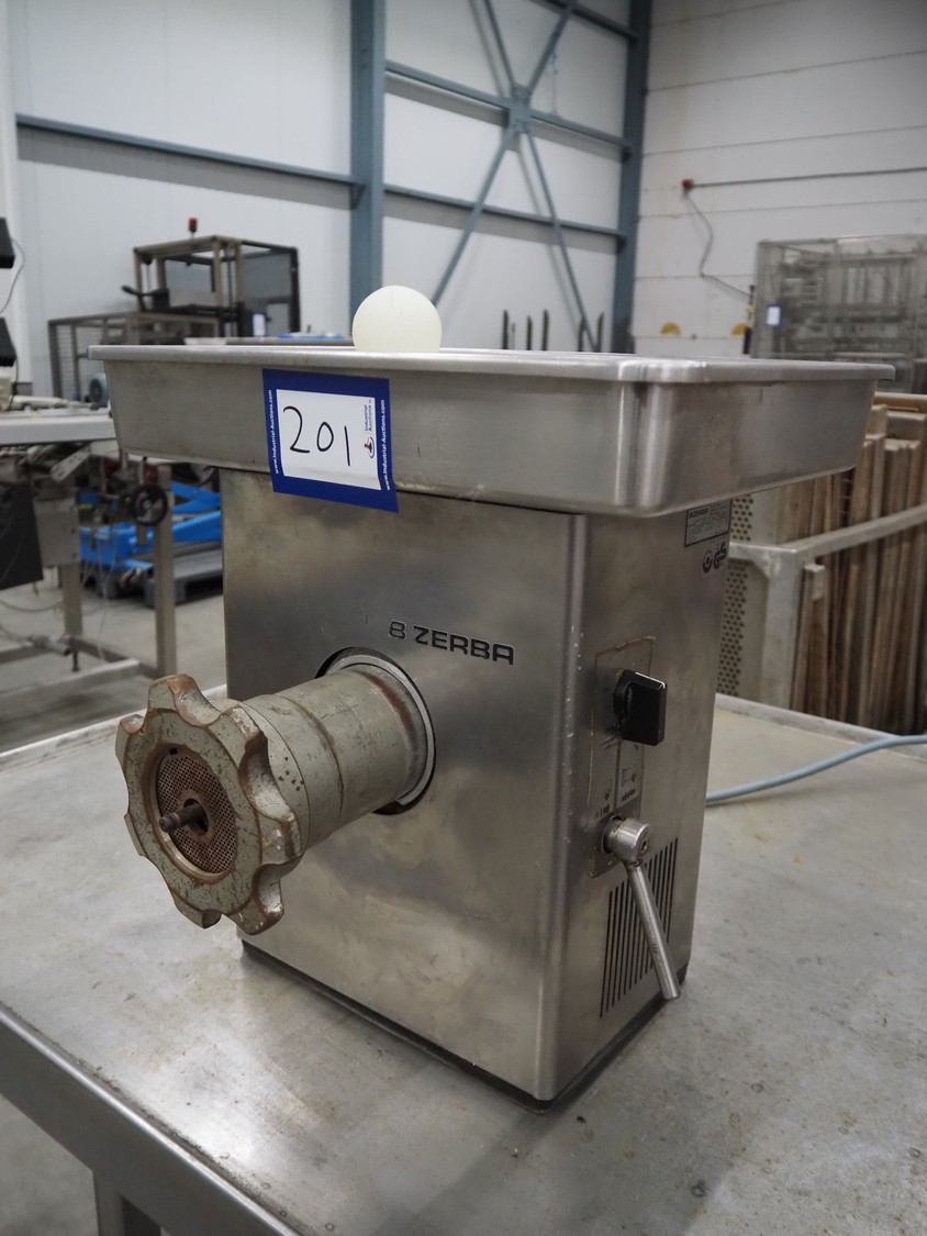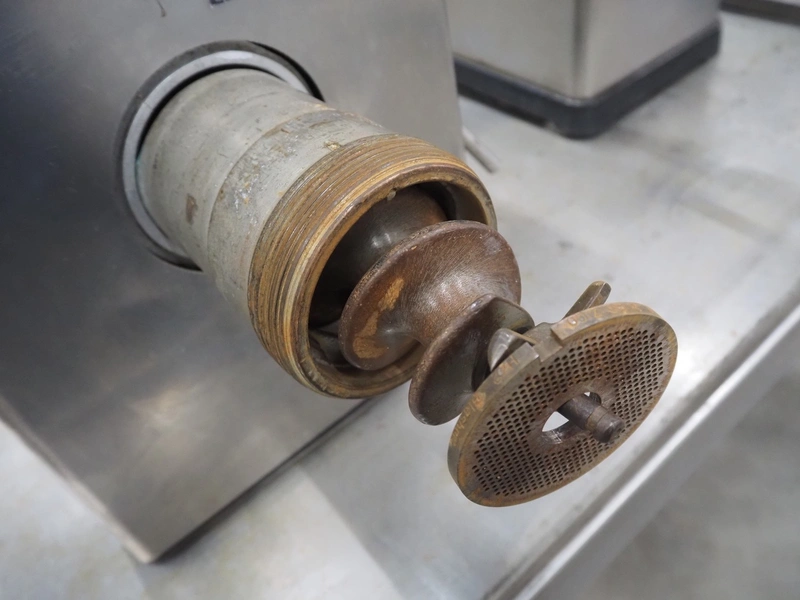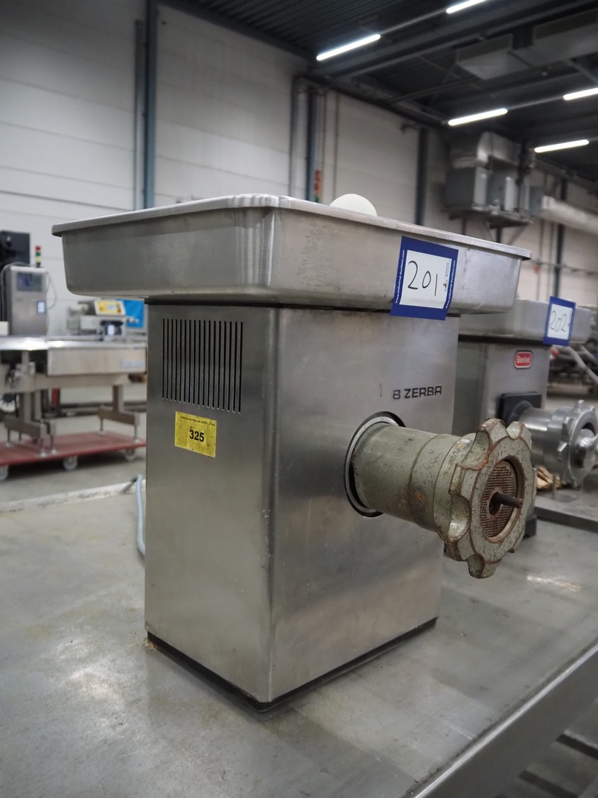 Bizerba grinder, type: FW 82 T/22, machine number: 494732, 220/380 V, 3 Ph, 50 Hz, 6.9/4.0 A, 2.35 kW, plate diameter: 82 mm, total dimensions: 640 mm x 450 mm x 840 mm.