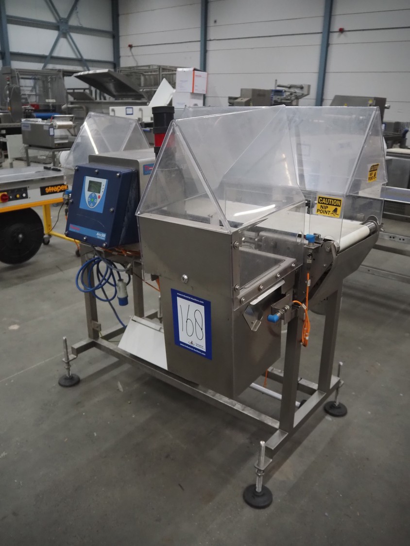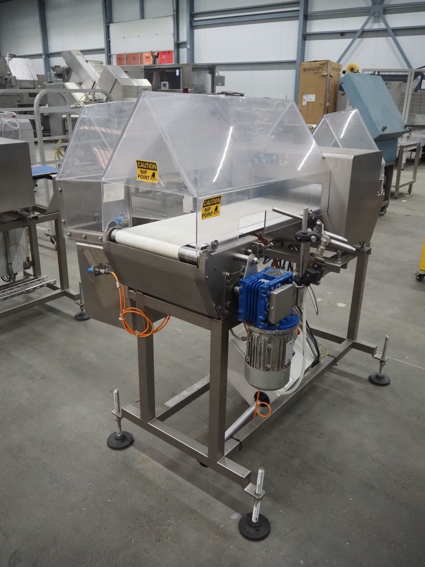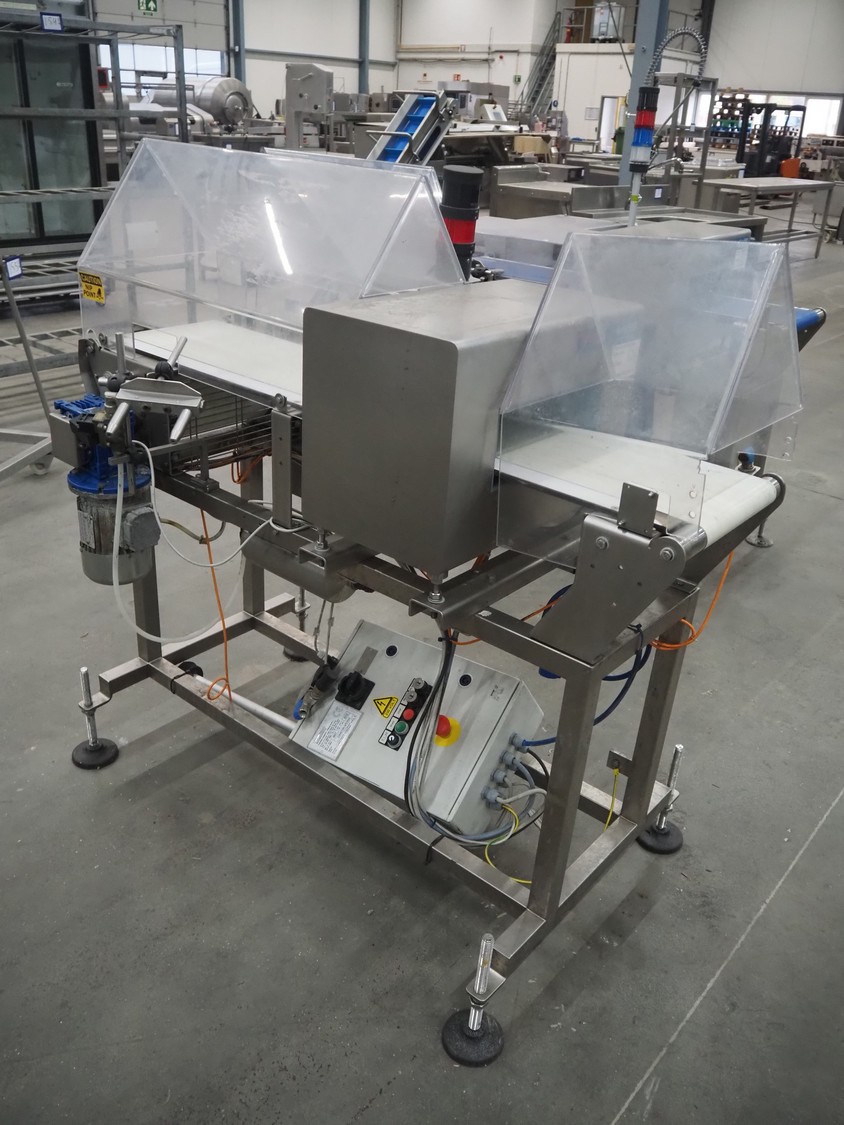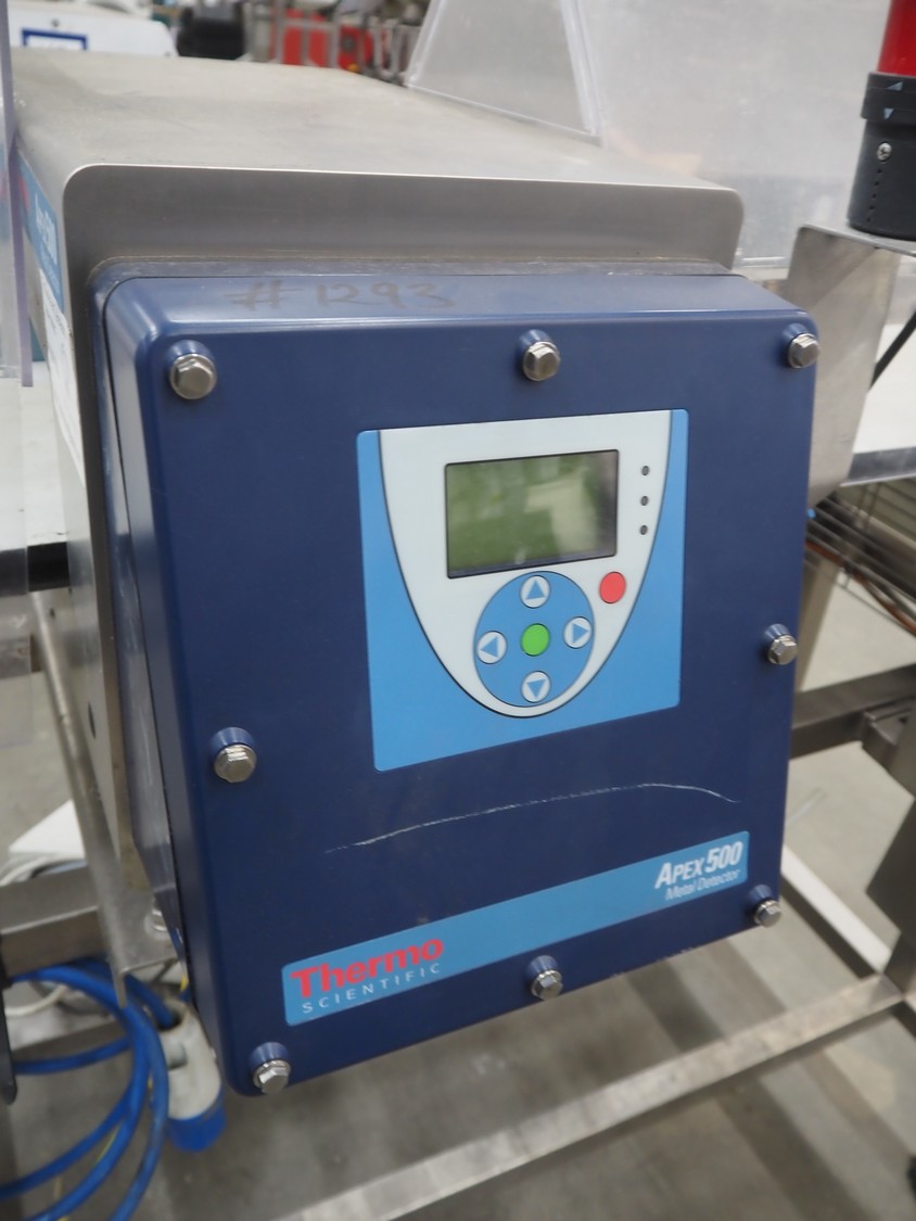 Thermo Fischer metal detector with rejector, model: Apex500, serial number: 9627, year of construction: 2012, 230 V, 50 Hz, plastic belt, belt width: 250 mm, clearance: 300 mm x 100 mm, total dimensions: 1400 mm x 1100 mm x 1350 mm.