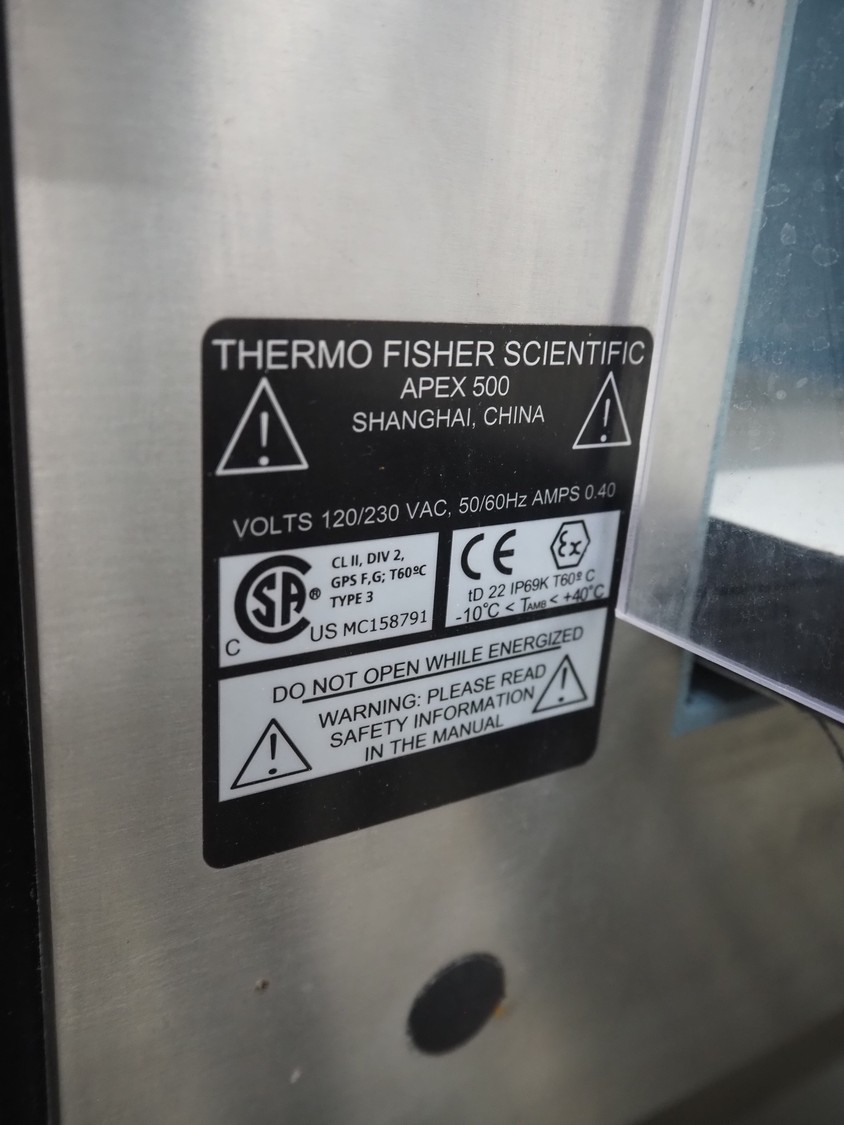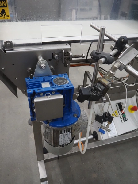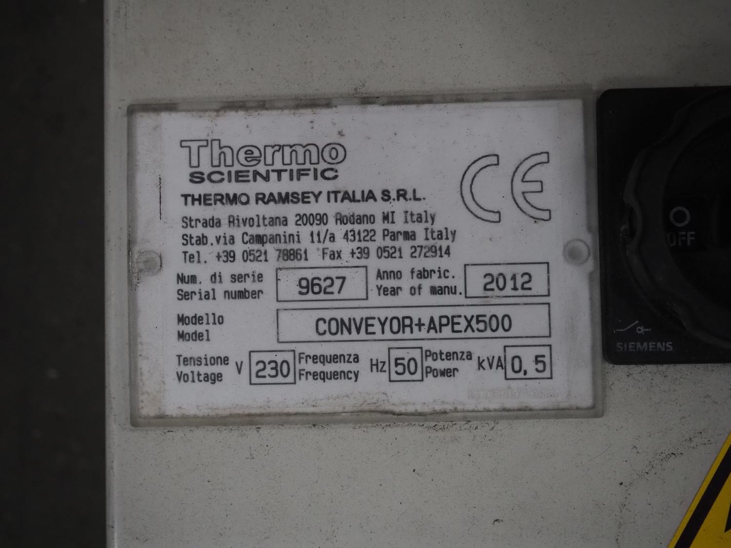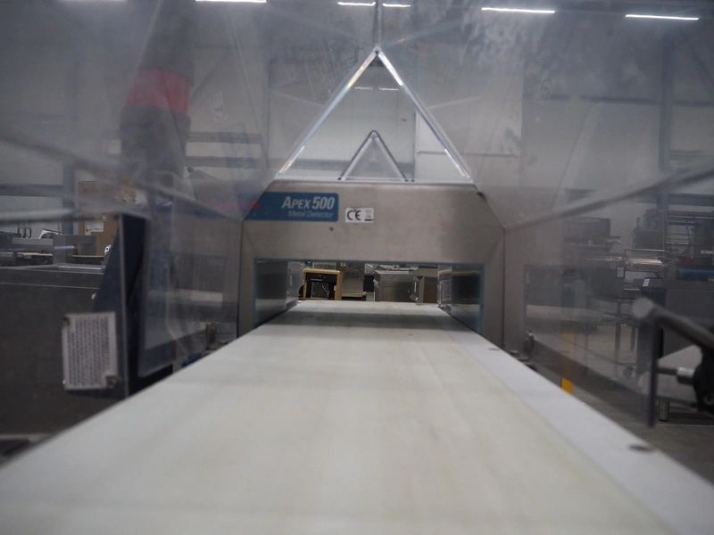 Thermo Fischer metal detector with rejector, model: Apex500, serial number: 9627, year of construction: 2012, 230 V, 50 Hz, plastic belt, belt width: 250 mm, clearance: 300 mm x 100 mm, total dimensions: 1400 mm x 1100 mm x 1350 mm.