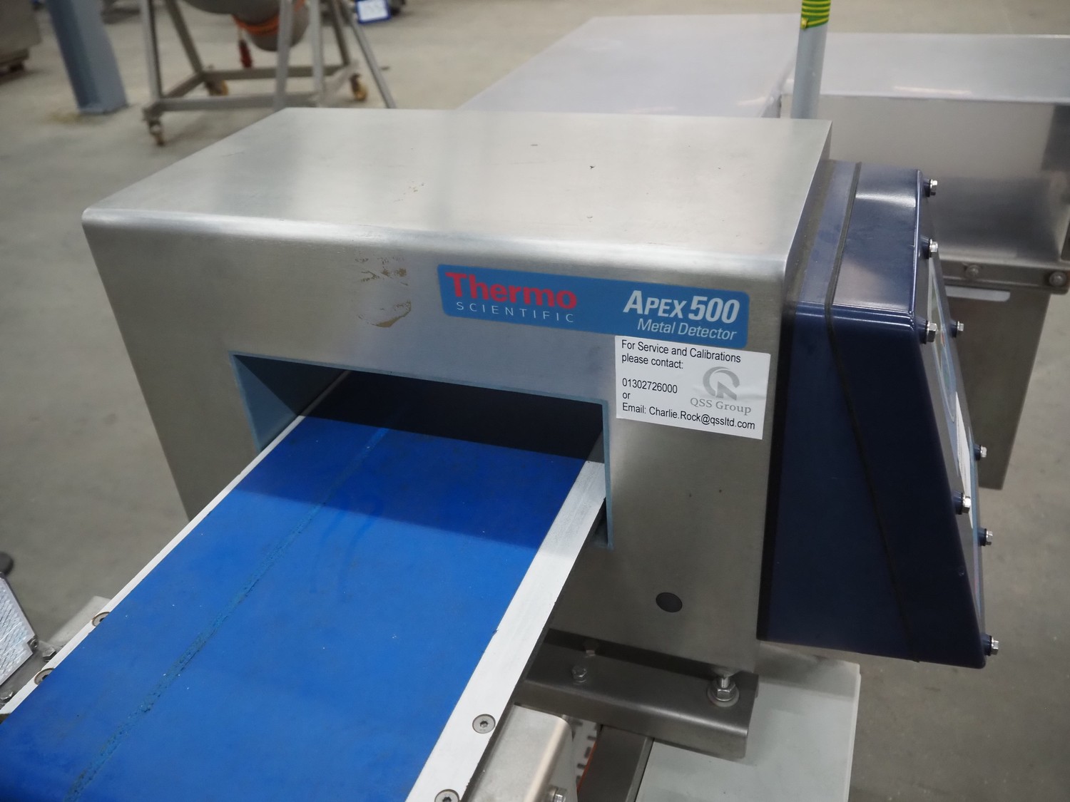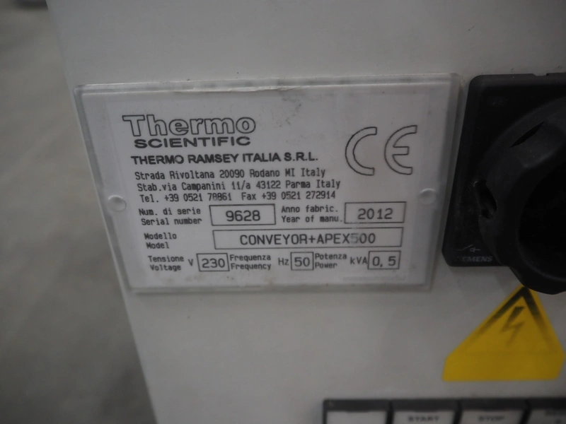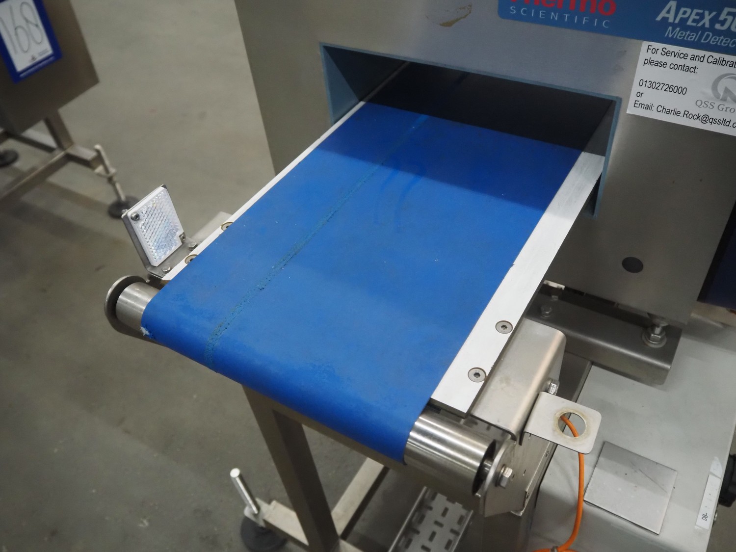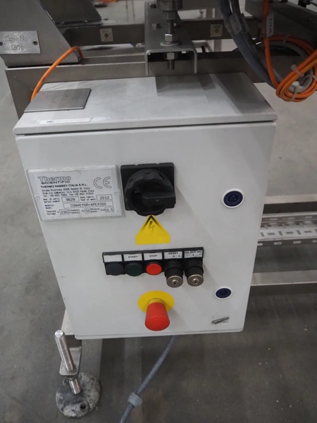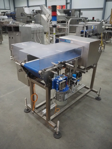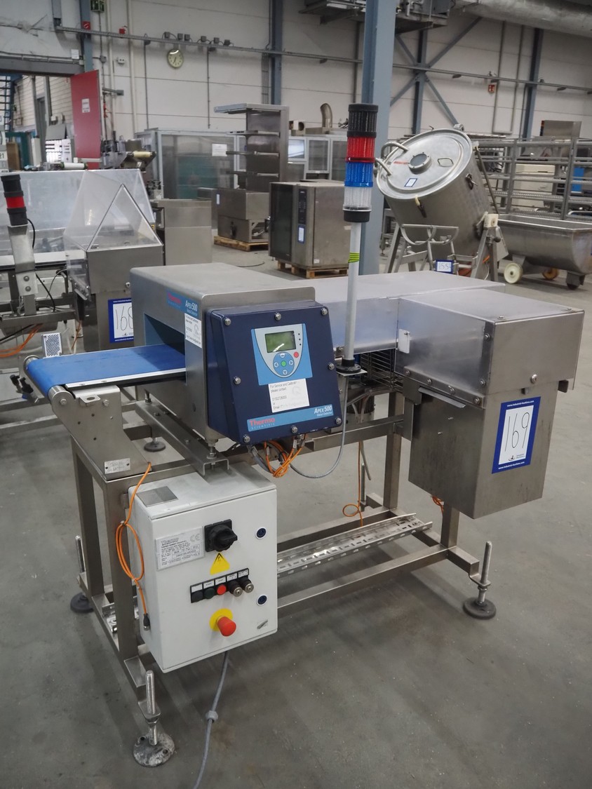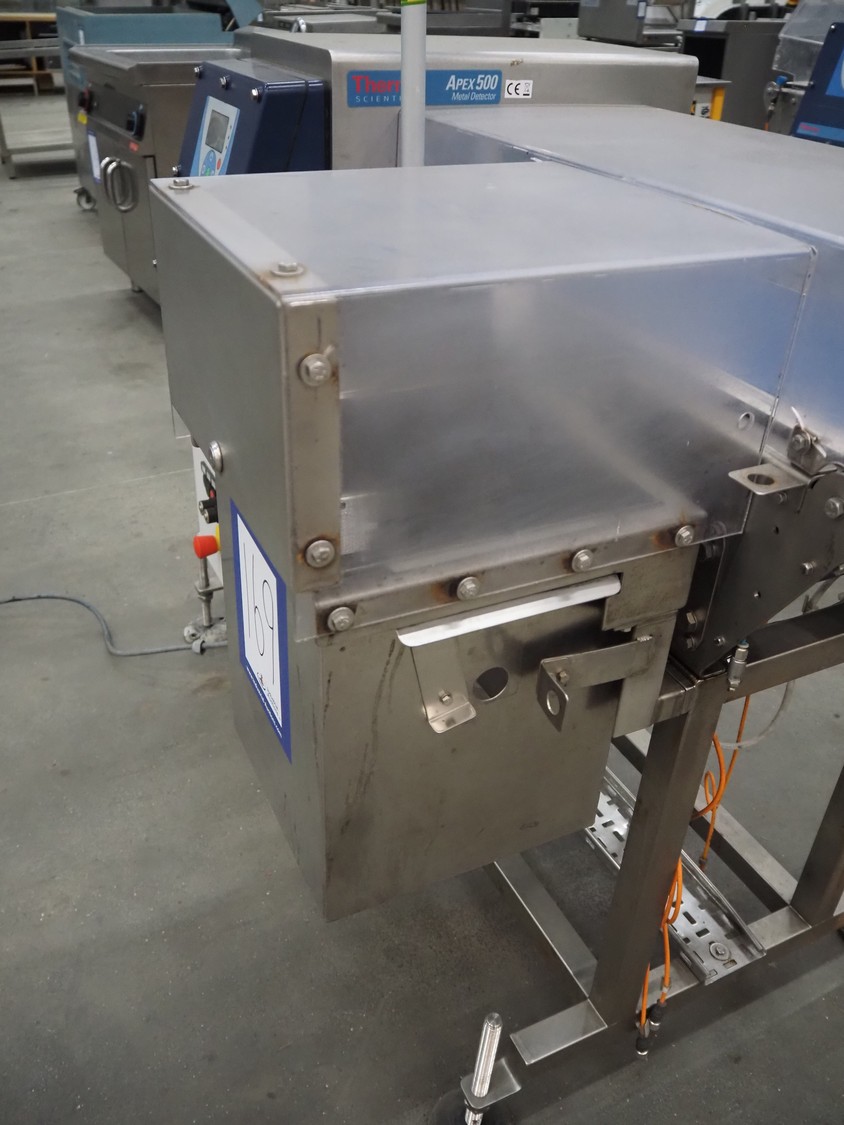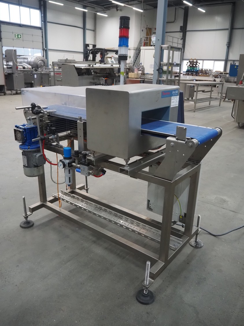 Thermo Fisher metal detector with rejecter, model: Apex500, serial number: 9628, 120/230 V, 50/60 Hz, 0.4 A, plastic belt, belt width: 250 mm, clearance: 350 mm x 150 mm, total dimensions: 1400 mm x 960 mm x 1460 mm.