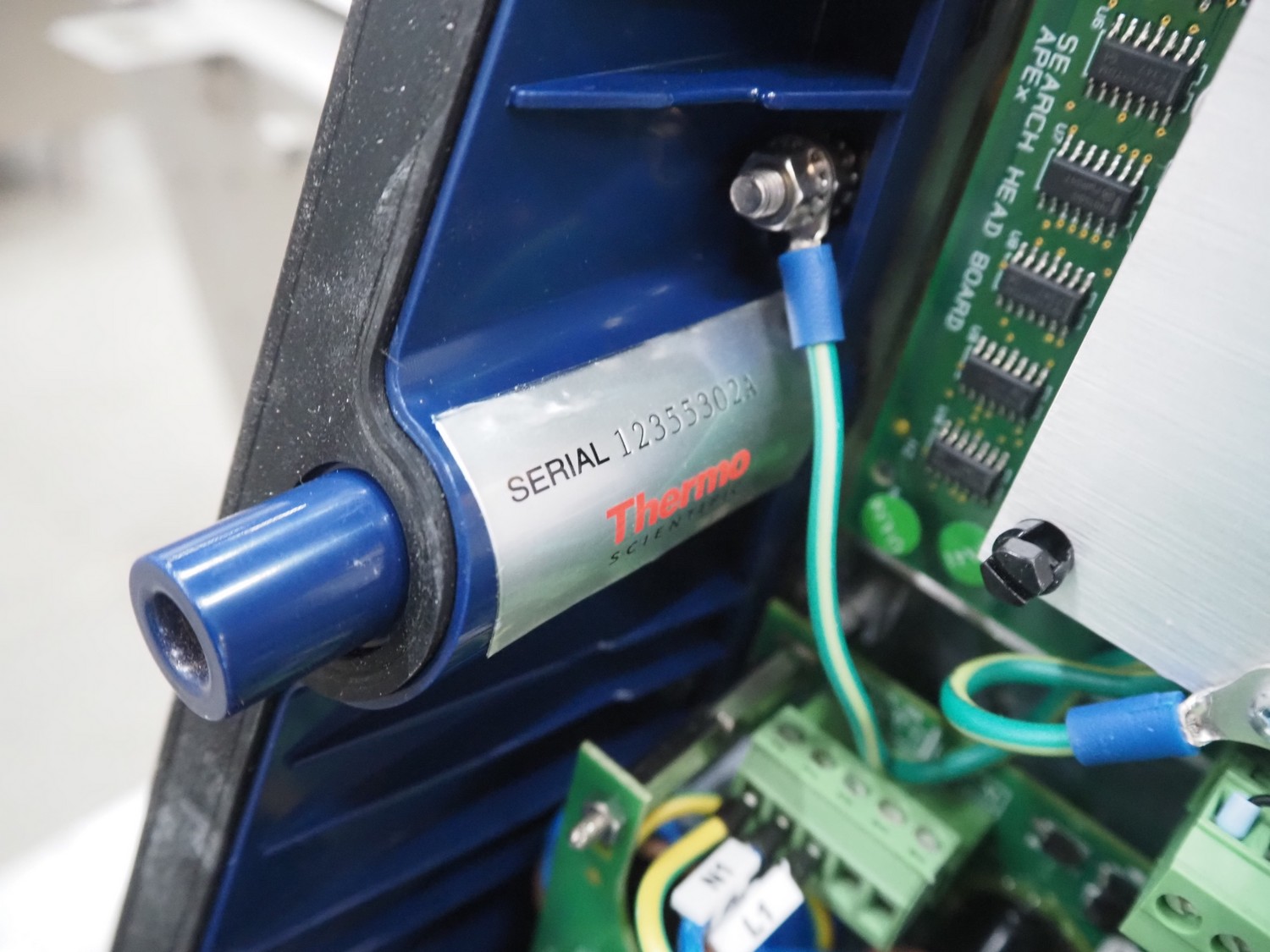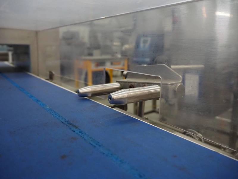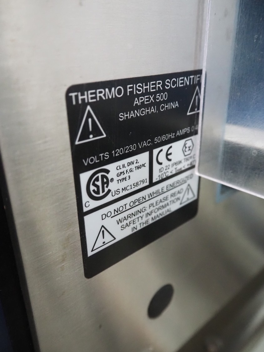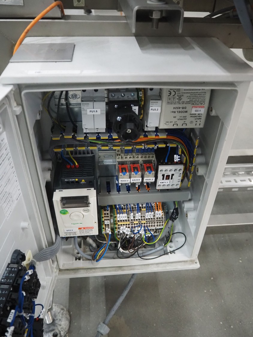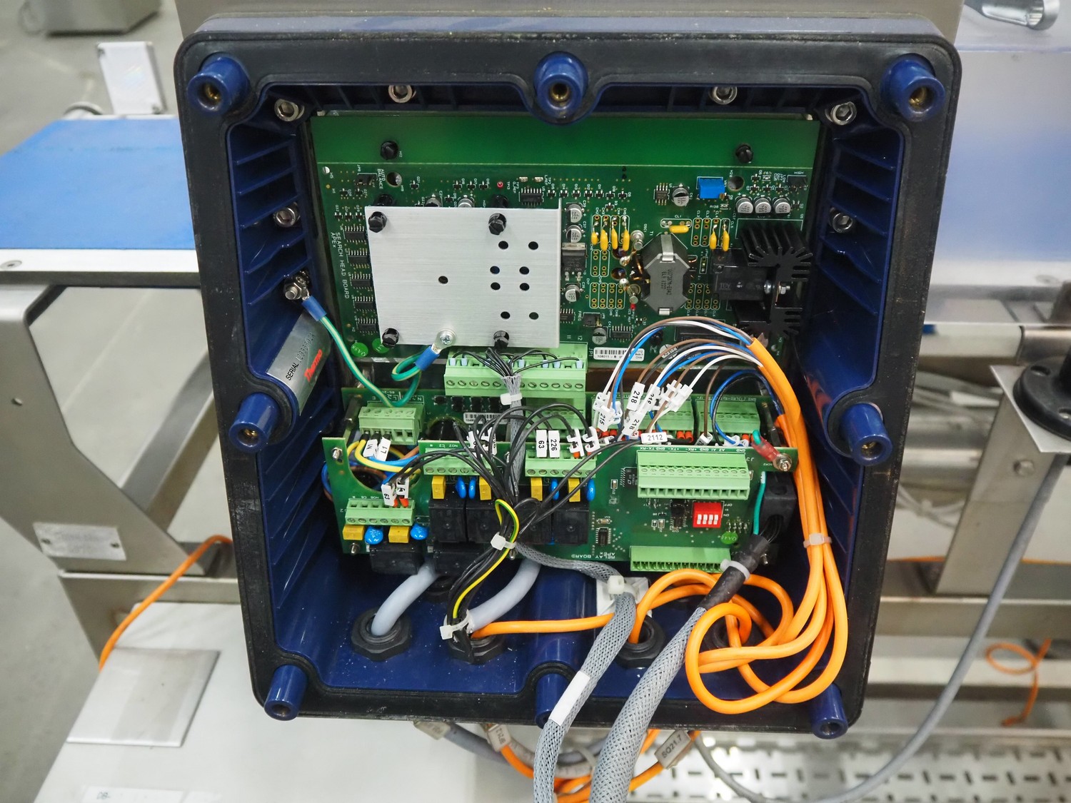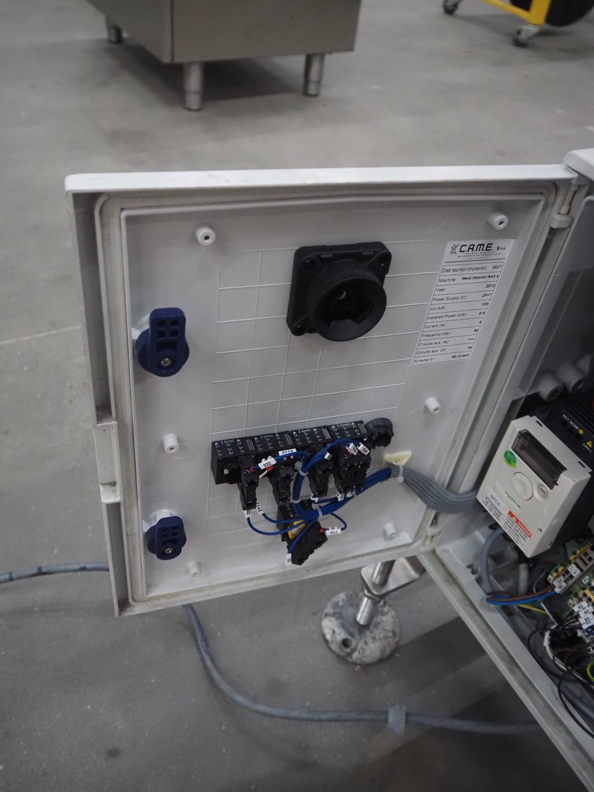 Thermo Fisher metal detector with rejecter, model: Apex500, serial number: 9628, 120/230 V, 50/60 Hz, 0.4 A, plastic belt, belt width: 250 mm, clearance: 350 mm x 150 mm, total dimensions: 1400 mm x 960 mm x 1460 mm.
