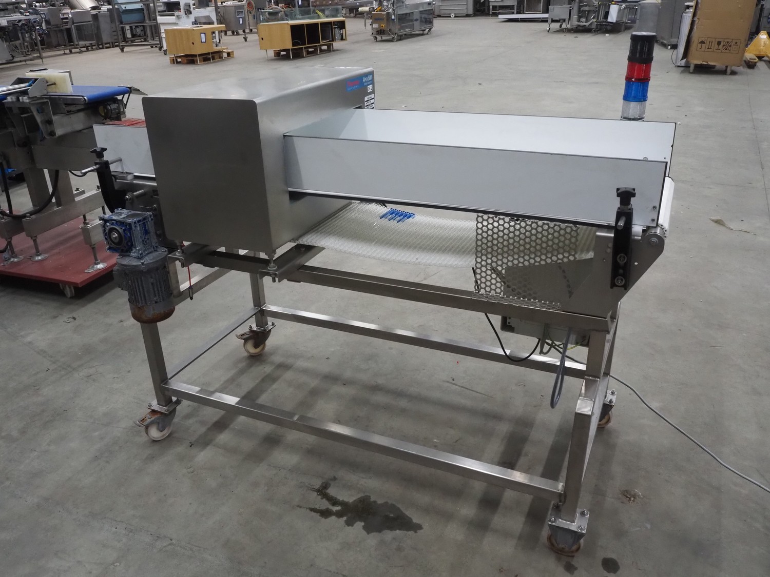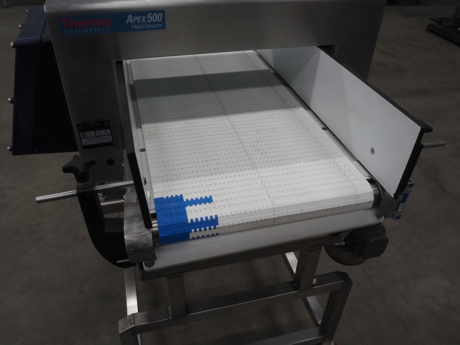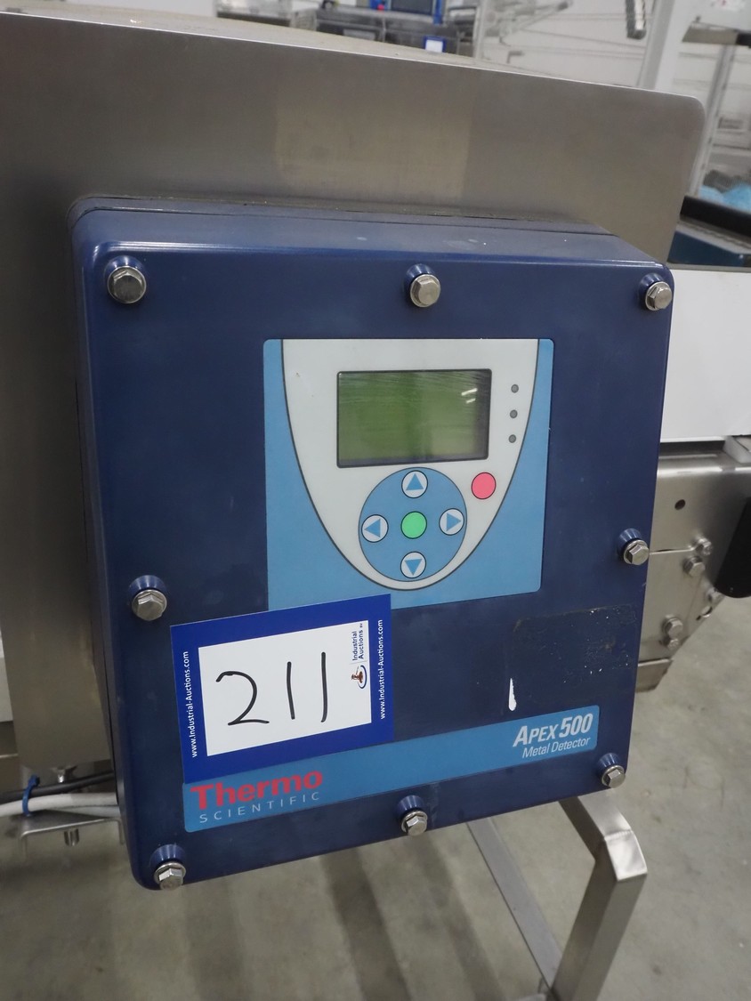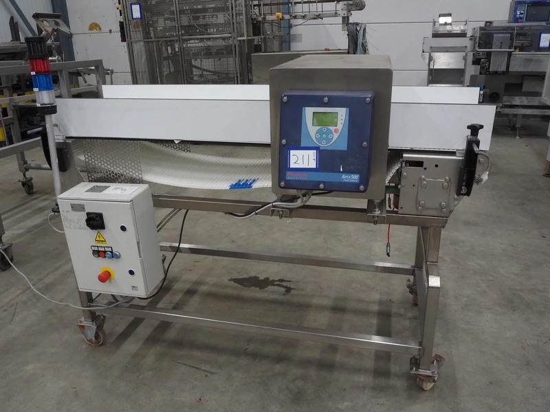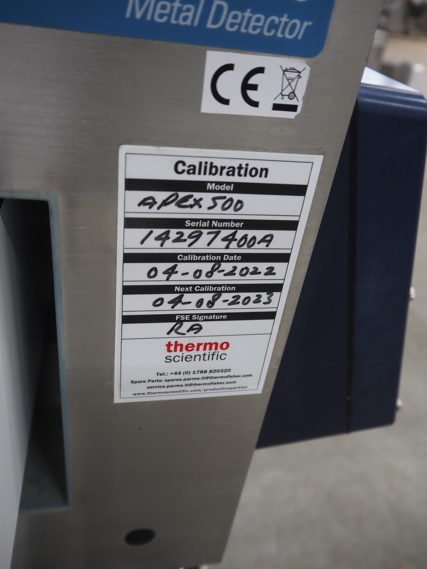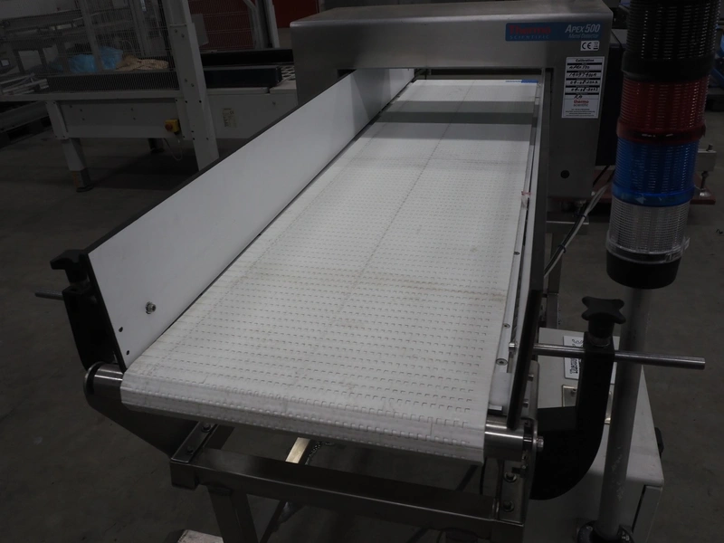 Thermo Fisher Scientific mobile metal detector, type: Apex 500, 120/230 V, 50/60 Hz, 0.4 A, plastic belt, belt width: 400 mm, clearance: 500 mm x 200 mm, total dimensions: 1750 mm x 900 mm x 1230 mm.