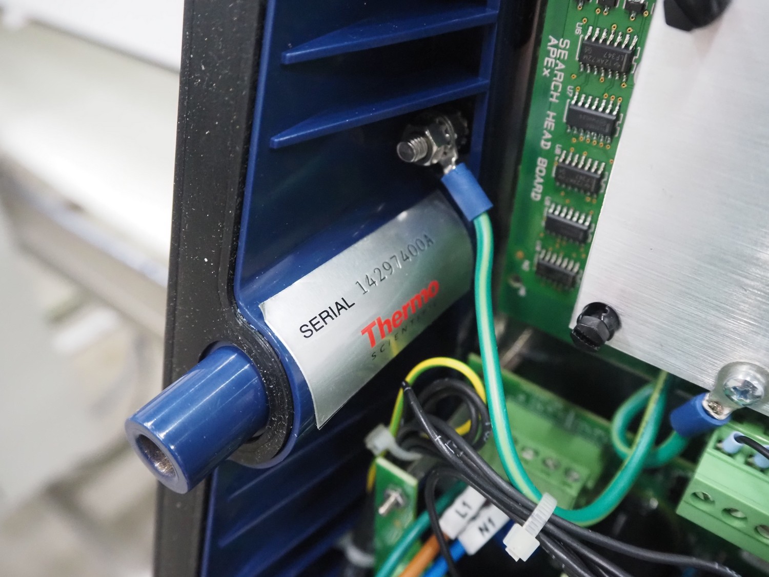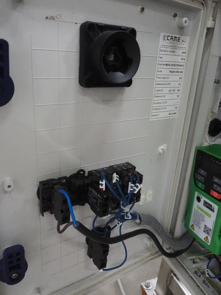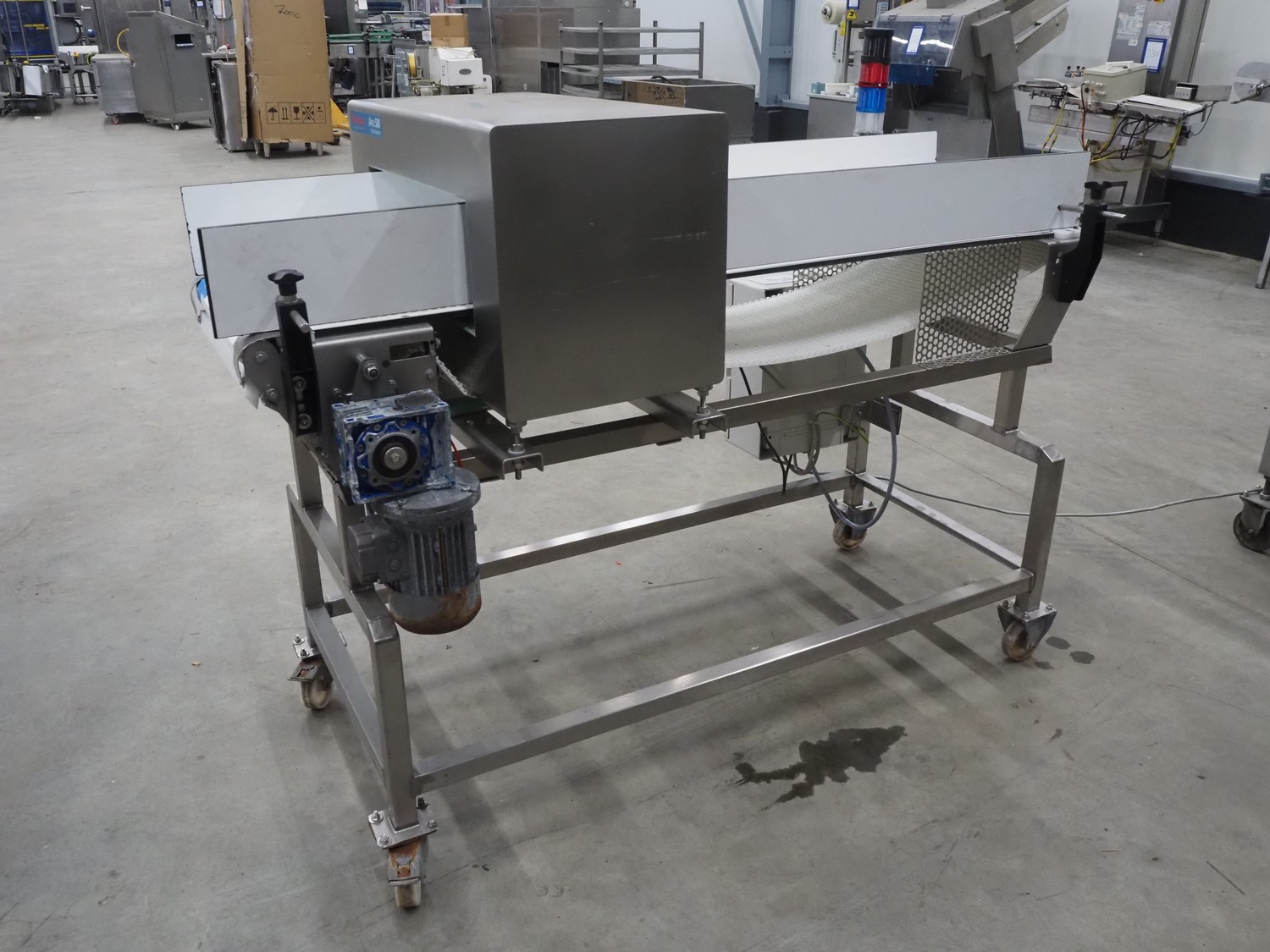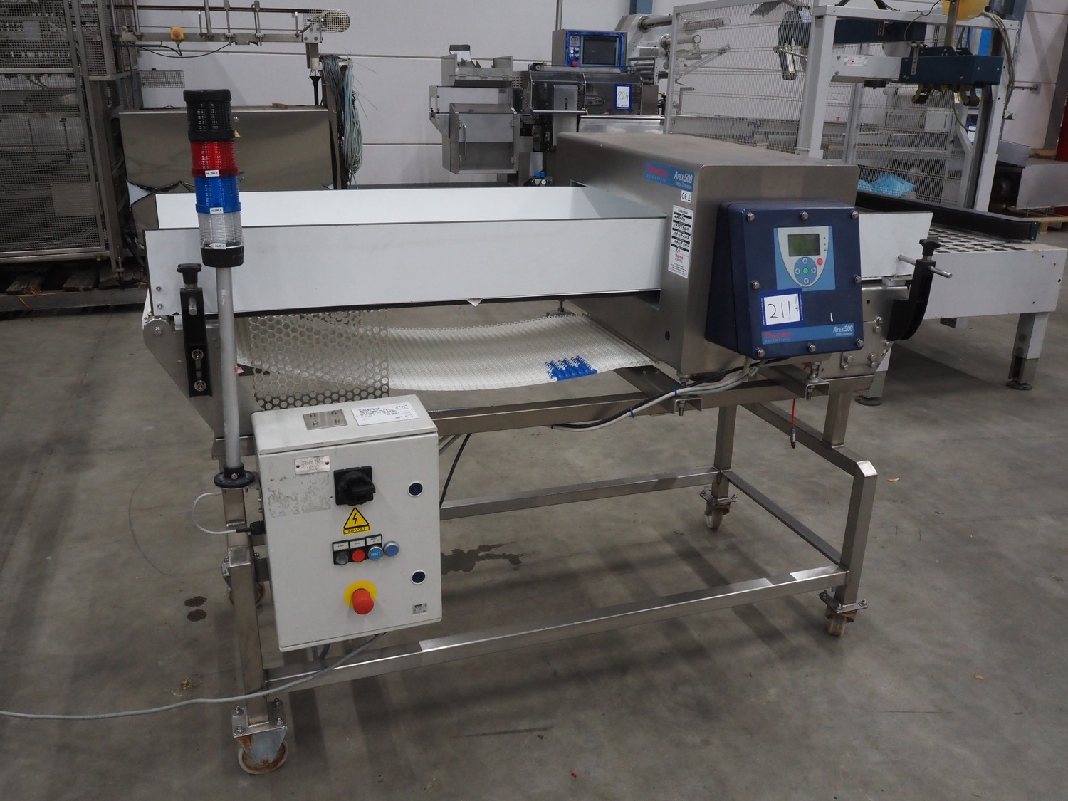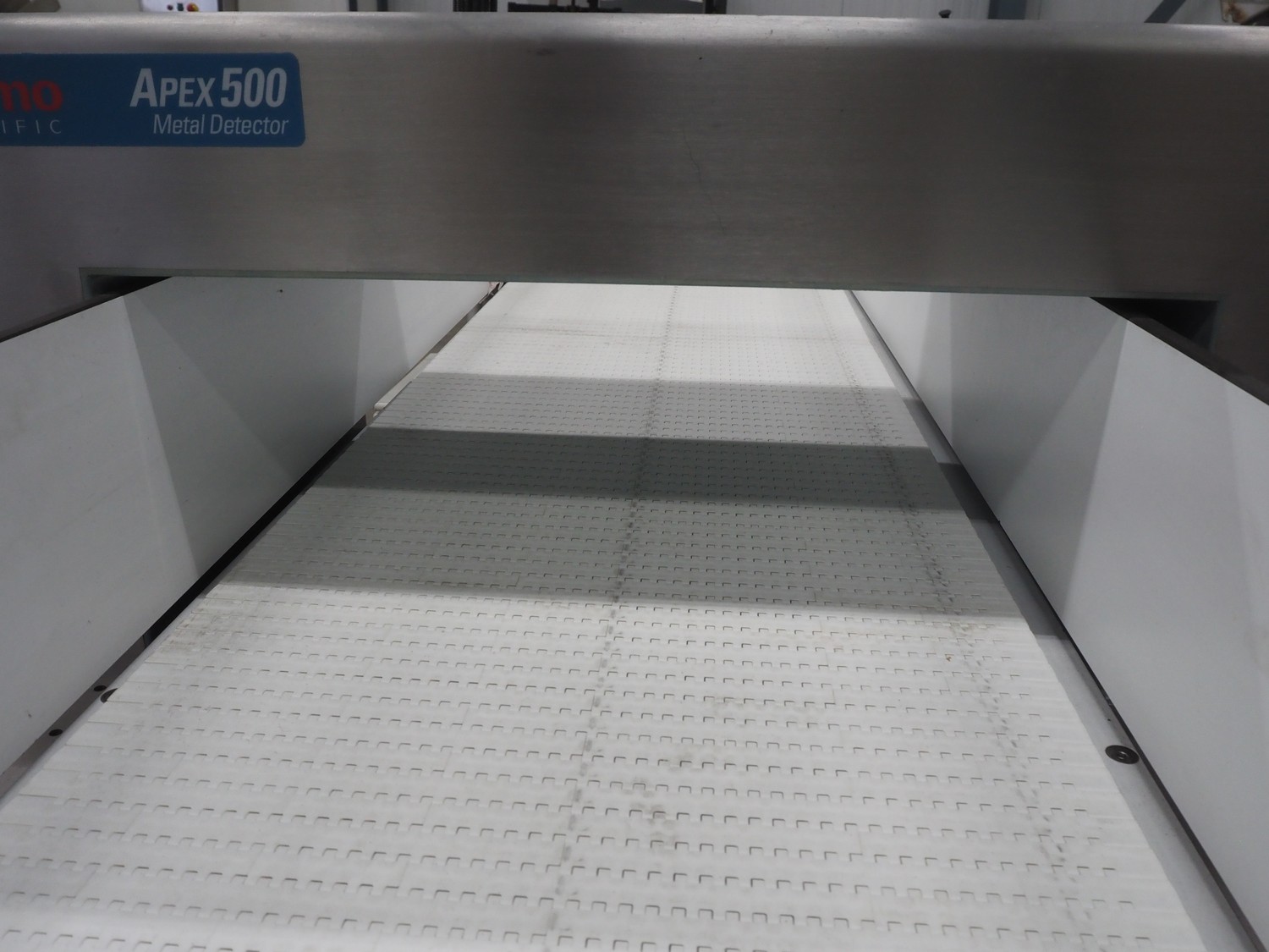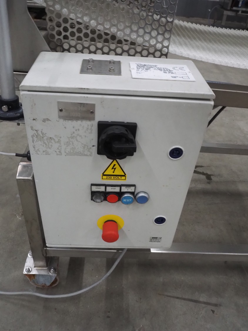 Thermo Fisher Scientific mobile metal detector, type: Apex 500, 120/230 V, 50/60 Hz, 0.4 A, plastic belt, belt width: 400 mm, clearance: 500 mm x 200 mm, total dimensions: 1750 mm x 900 mm x 1230 mm.
