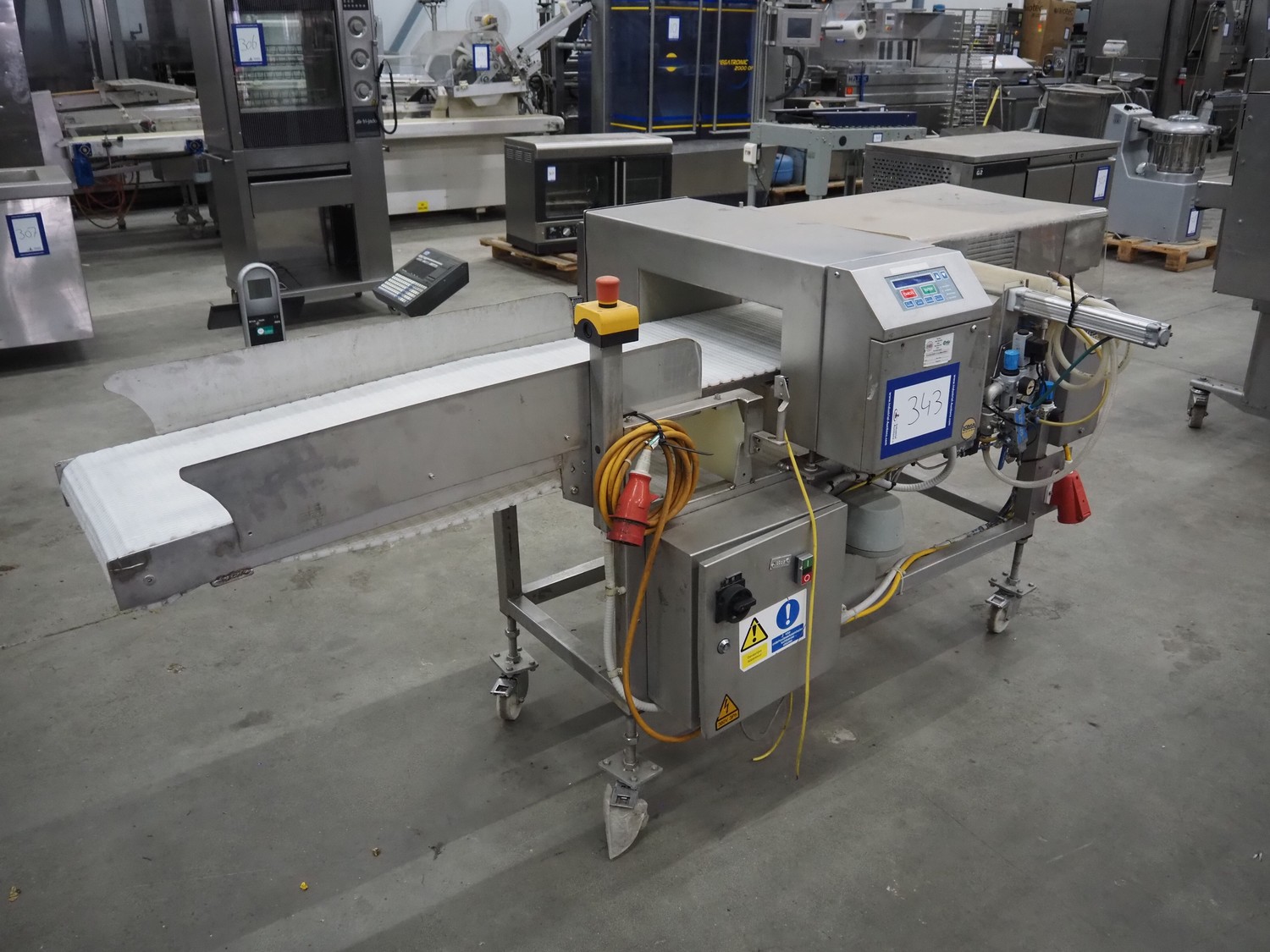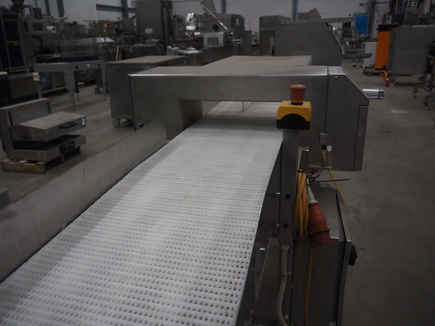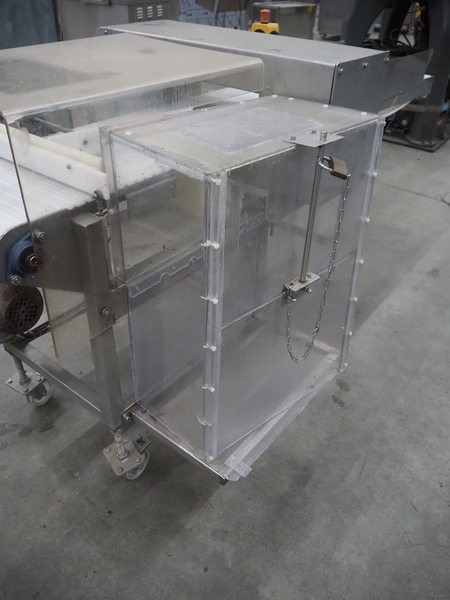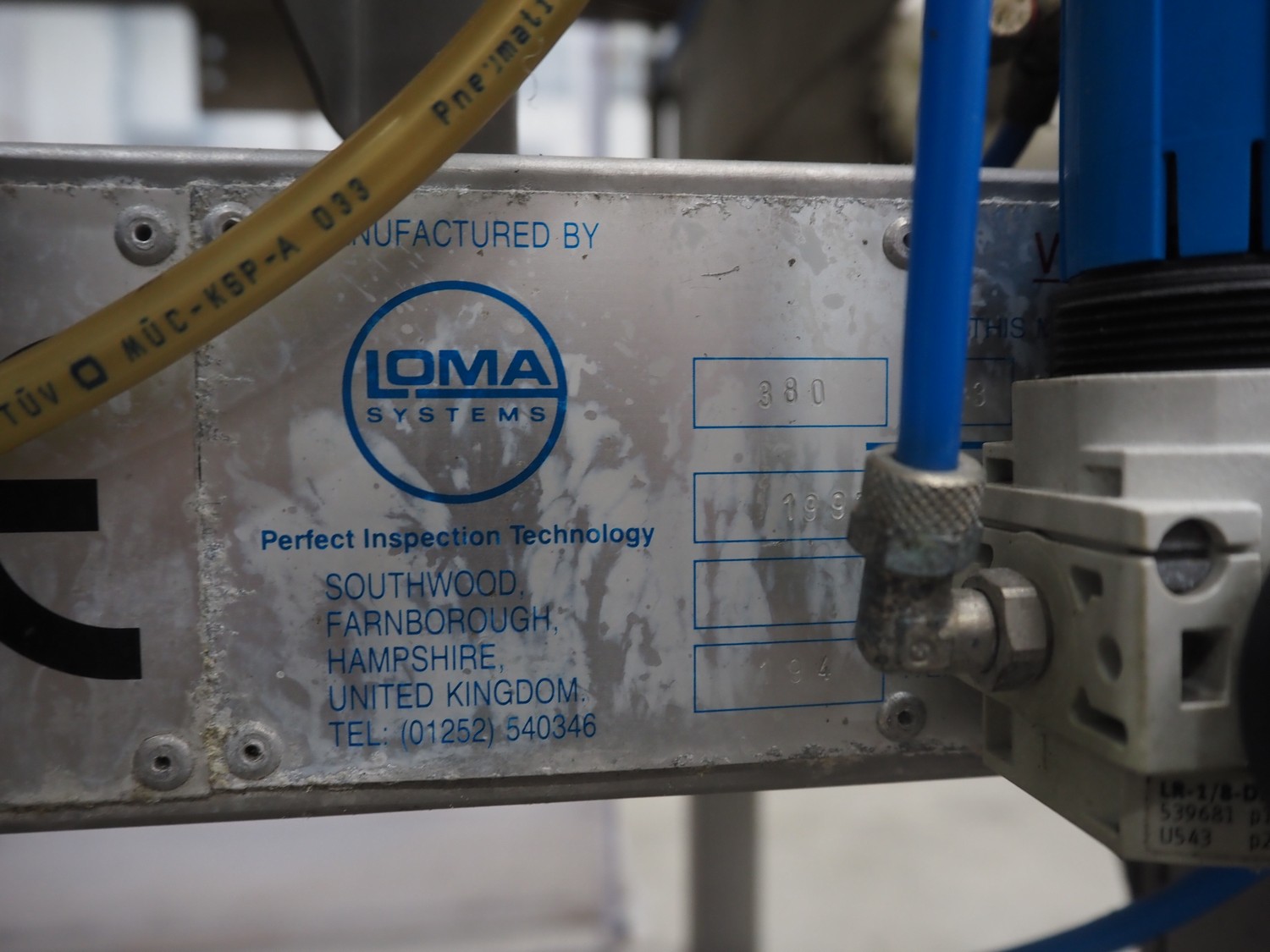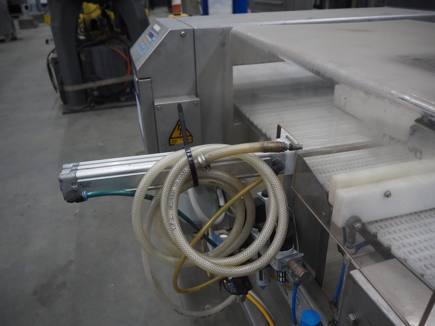 Loma Systems mobile metal detector with rejector, year of construction: 1997, plastic mesh belt, belt width: 400 mm, clearance: 450 mm x 120 mm, total dimensions: 2200 mm x 1200 mm x 1100 mm.