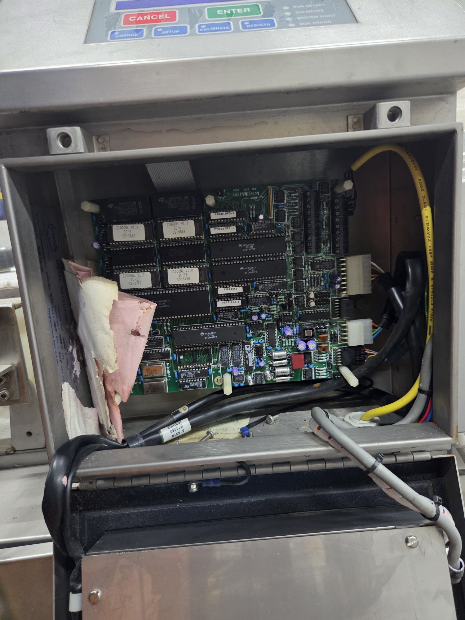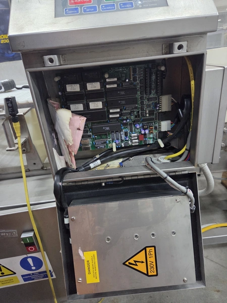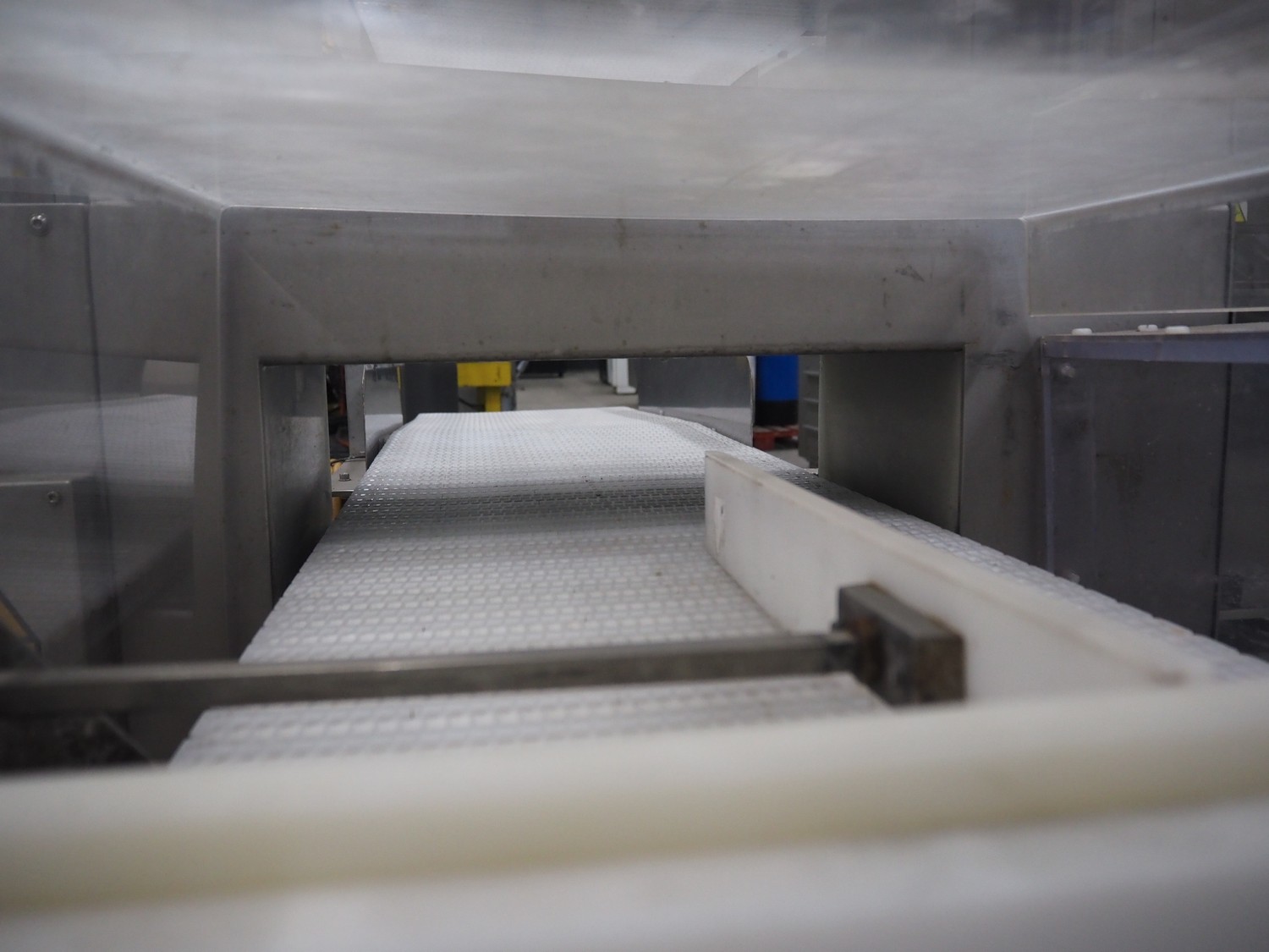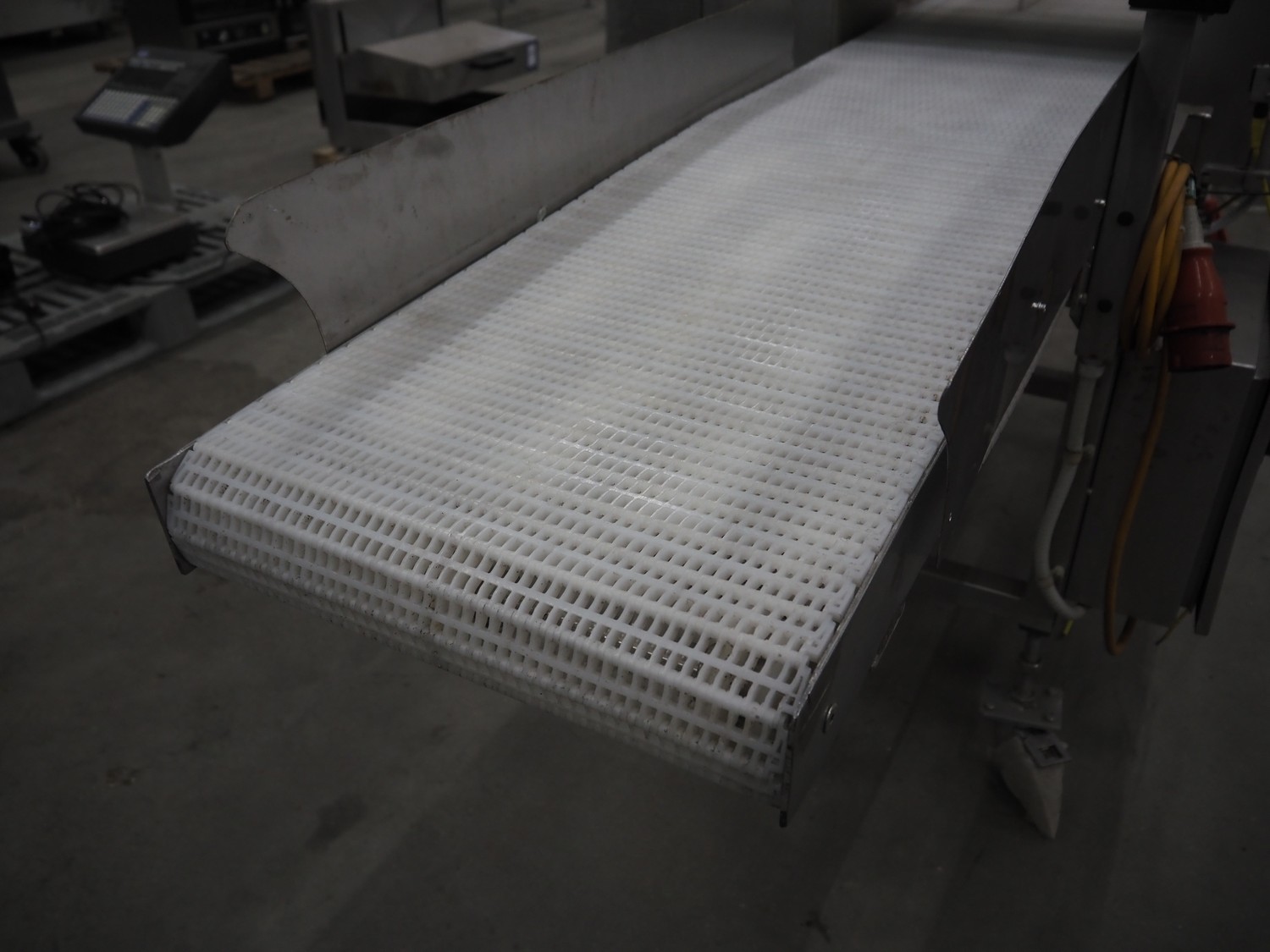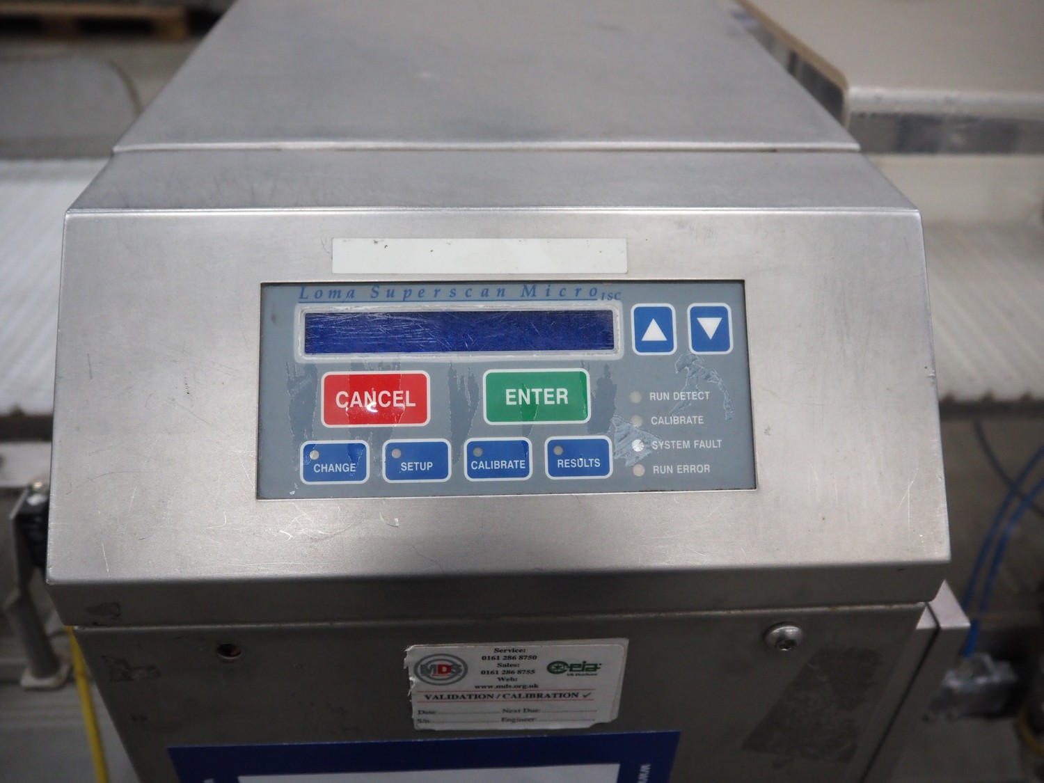 Loma Systems mobile metal detector with rejector, year of construction: 1997, plastic mesh belt, belt width: 400 mm, clearance: 450 mm x 120 mm, total dimensions: 2200 mm x 1200 mm x 1100 mm.