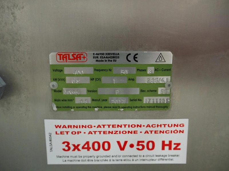 Talsa mobile mixer, model: MIX95, serial number: 1711191, year of construction: 2017, 400 V, 3 Ph, 50 Hz, 1 A, 0.8 kW, volume: 95 liter, dimensions: 1280 mm x 840 mm x 1150 mm.
