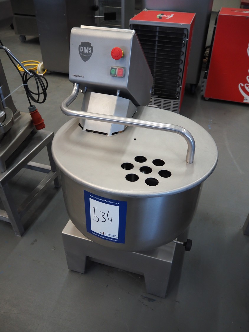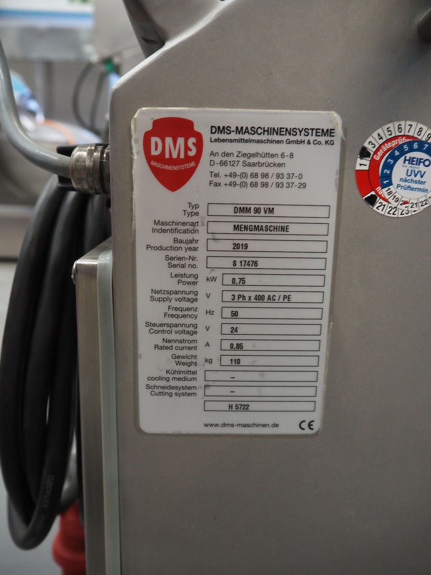 DMS mixer, type: DMM 90 VM, serial number: S 17476, year of construction: 2019, 400 V, 3 Ph, 50 Hz, 0.85 A, 0,75 kW, weight: 110 kg, volume: 90 liter, dimensions: 600 mm x 900 mm x 1120 mm.