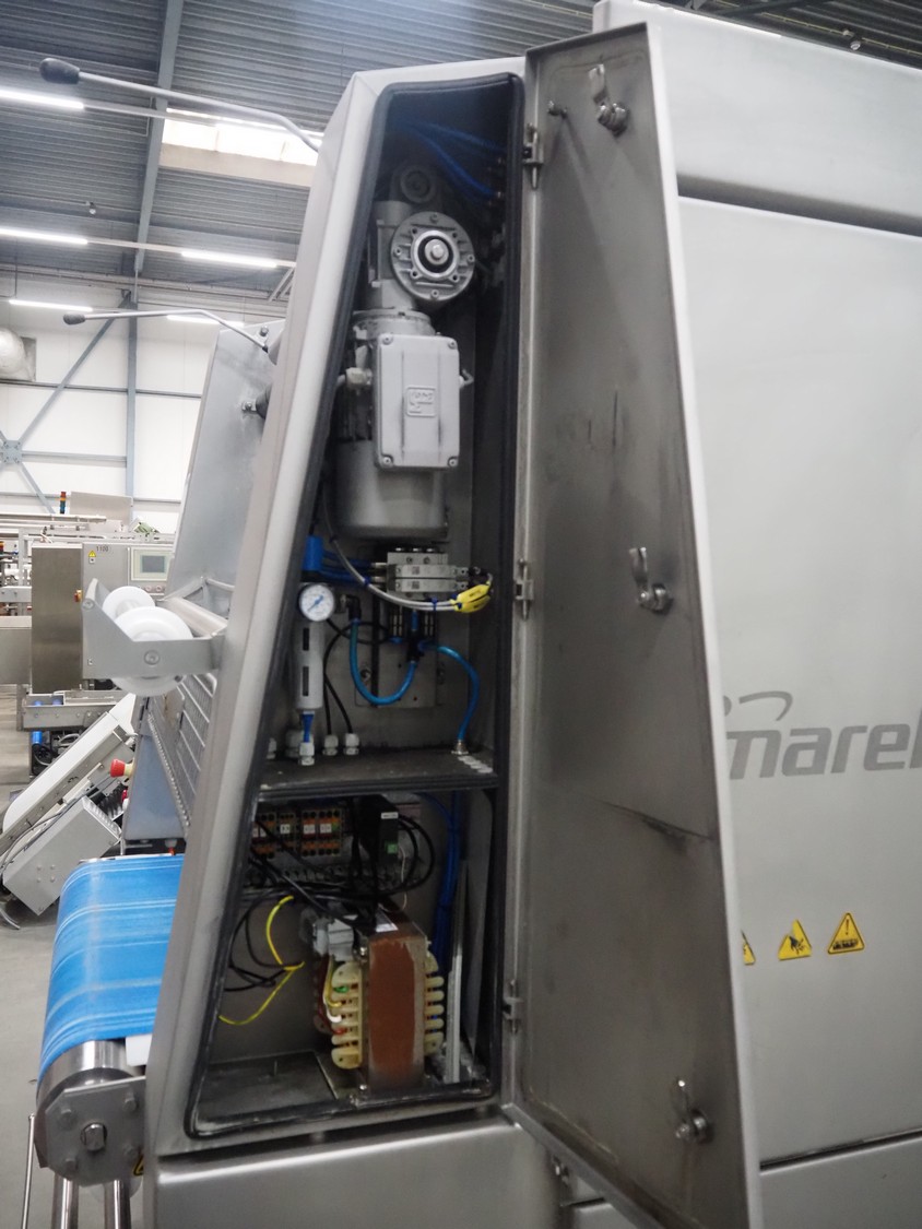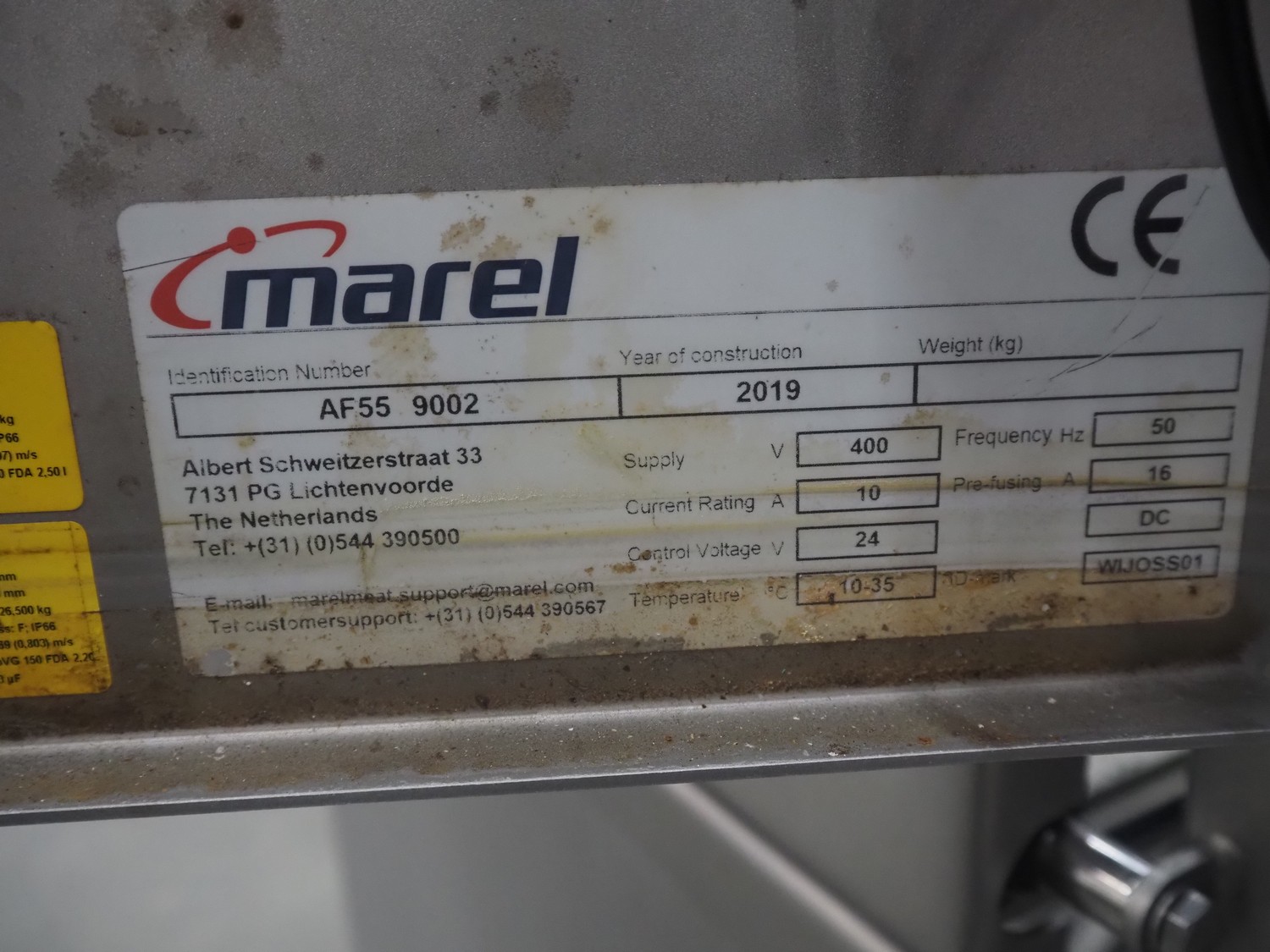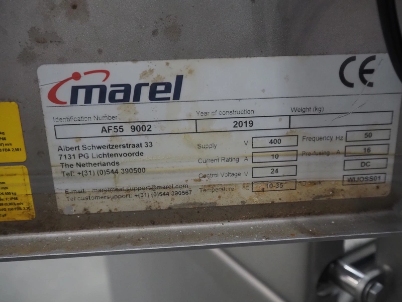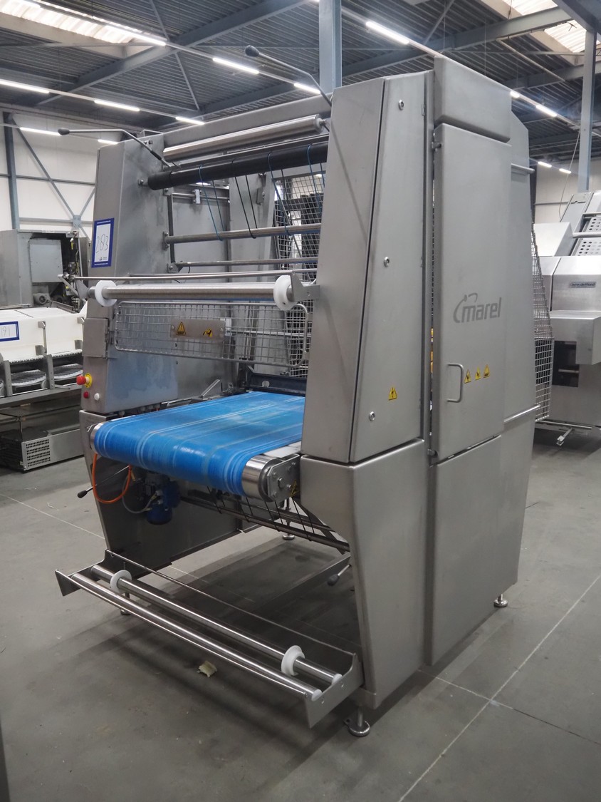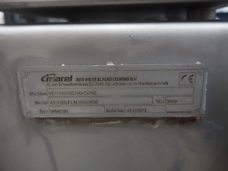 Marel film wrapper, model: ARANEA FILM WRAPPER, type: WM6201, serial number: AF558971, year of construction: 2019, plastic belt, belt width: 800 mm, seal length: 1200 mm, total dimensions: 1850 mm x 1450 mm x 2150 mm. Including 2 crates with parts.