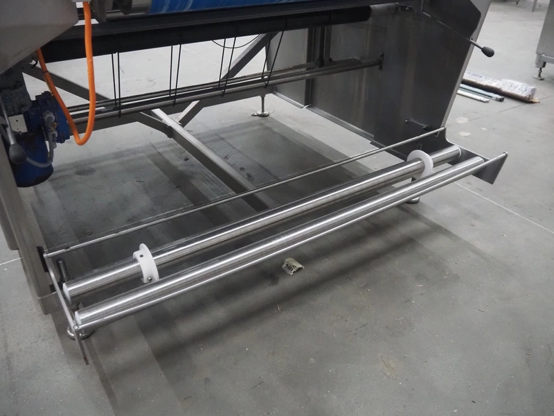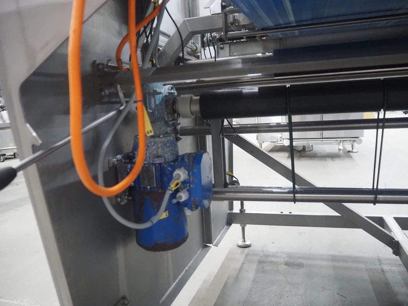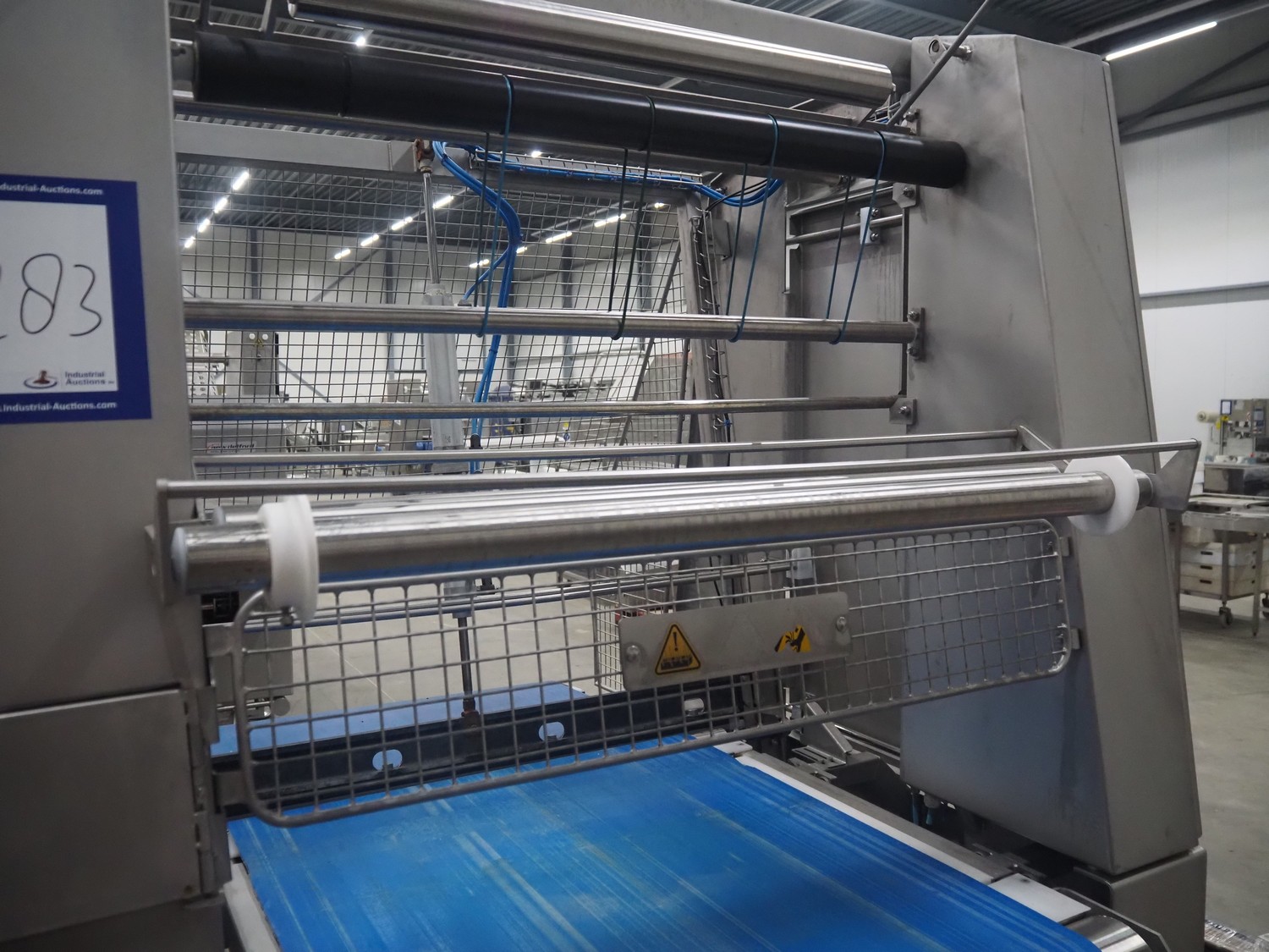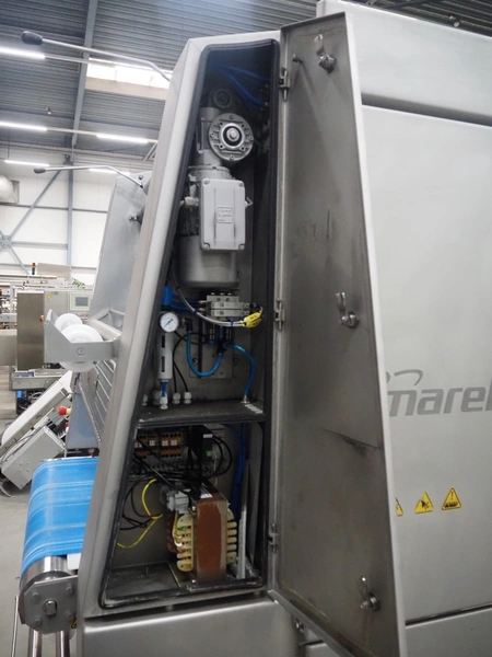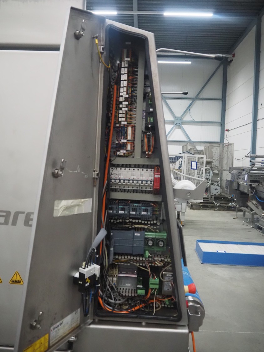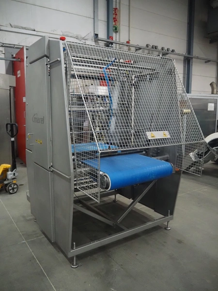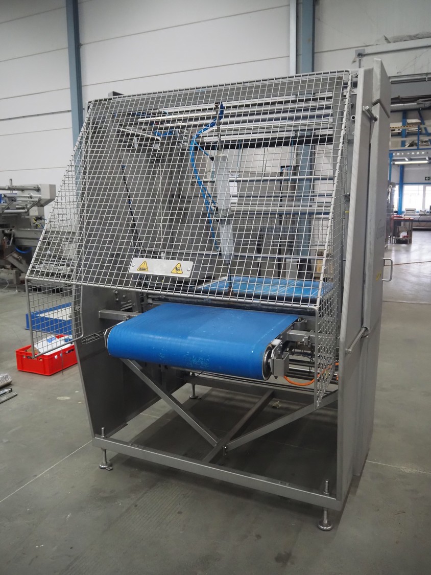 Marel film wrapper, model: ARANEA FILM WRAPPER, type: WM6201, serial number: AF558971, year of construction: 2019, plastic belt, belt width: 800 mm, seal length: 1200 mm, total dimensions: 1850 mm x 1450 mm x 2150 mm. Including 2 crates with parts.