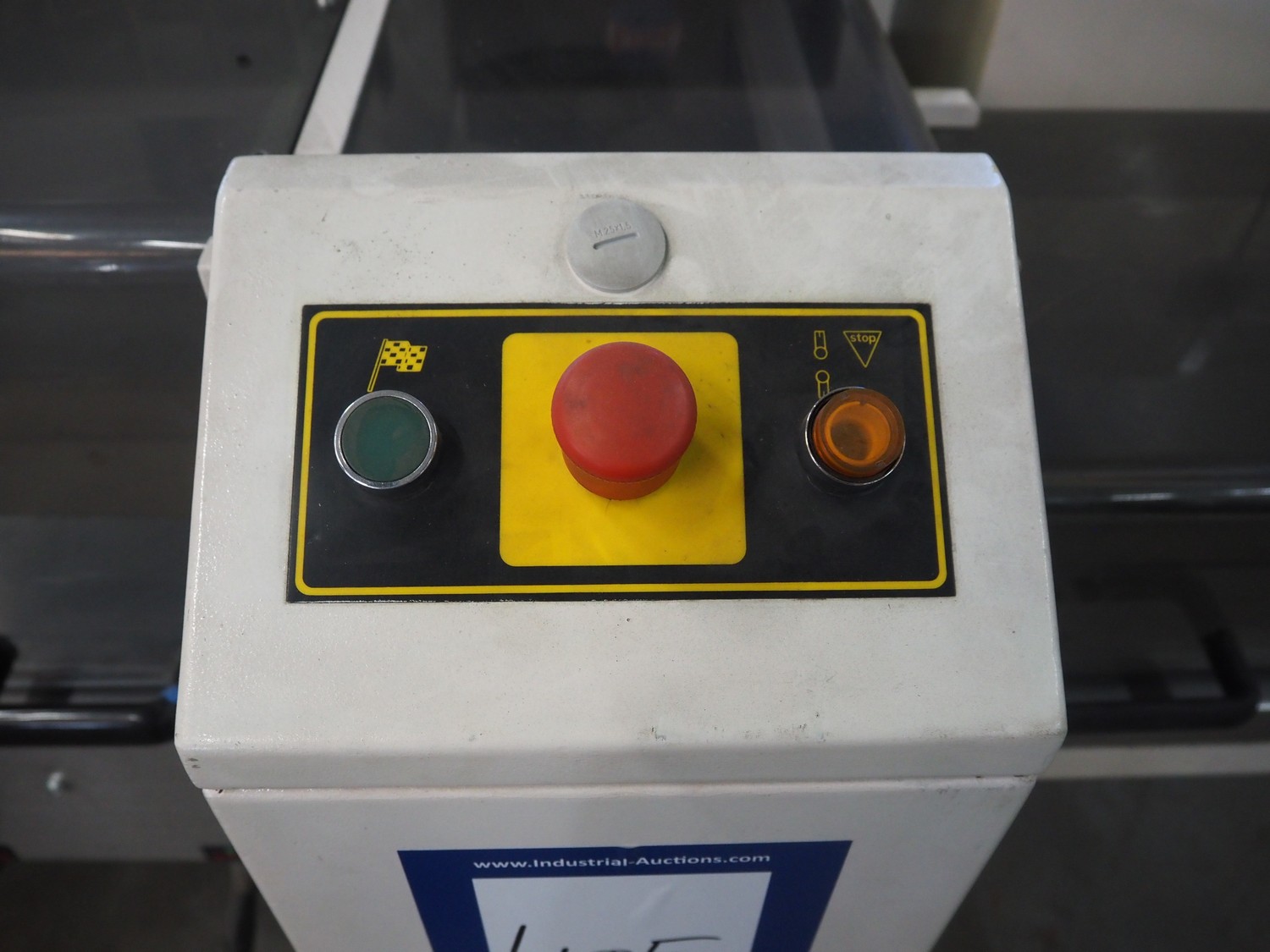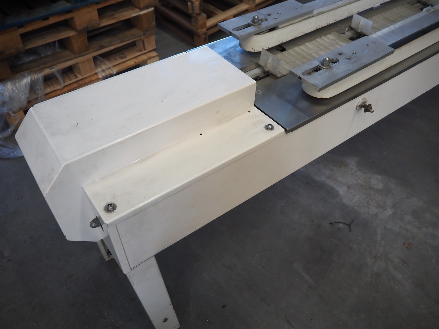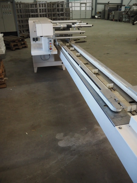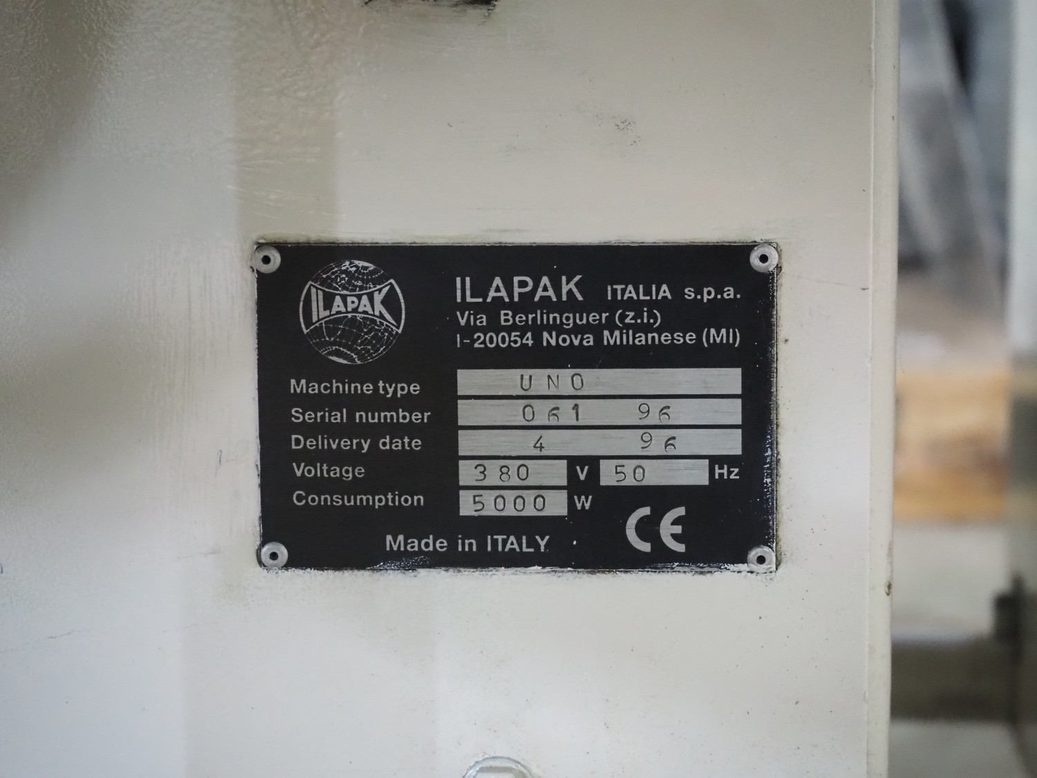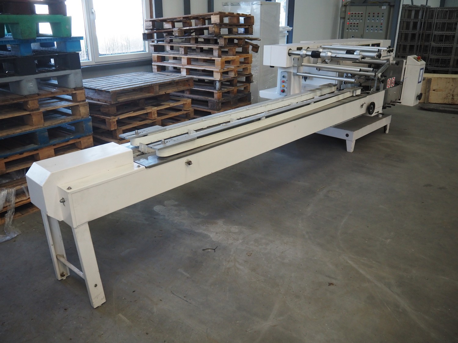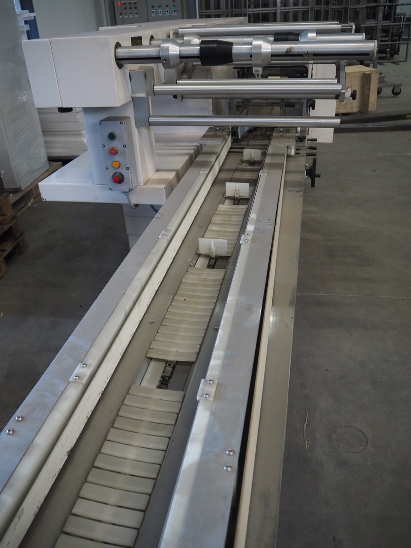 Ilapak Italia S.p.a. flowpacker, type: UNO, serial number: 061 96, year of construction: 4/1996, 380 V, 50 Hz, 5000 W, plastic infeed belt with dividers, belt width: 100 mm, divider height: 55 mm, distance between dividers: 430 mm, seal width: 250 mm, plastic outfeed belt, belt width: 240 mmm, total dimensions: 5900 mm x 1300 mm x 1310 mm.