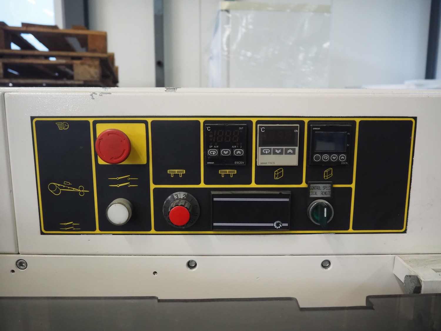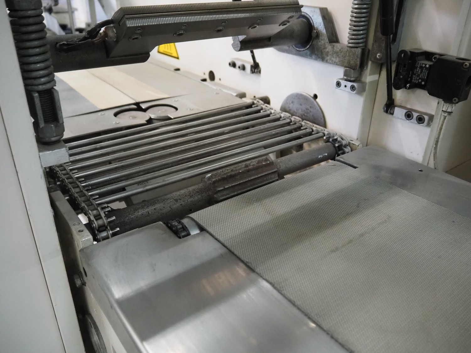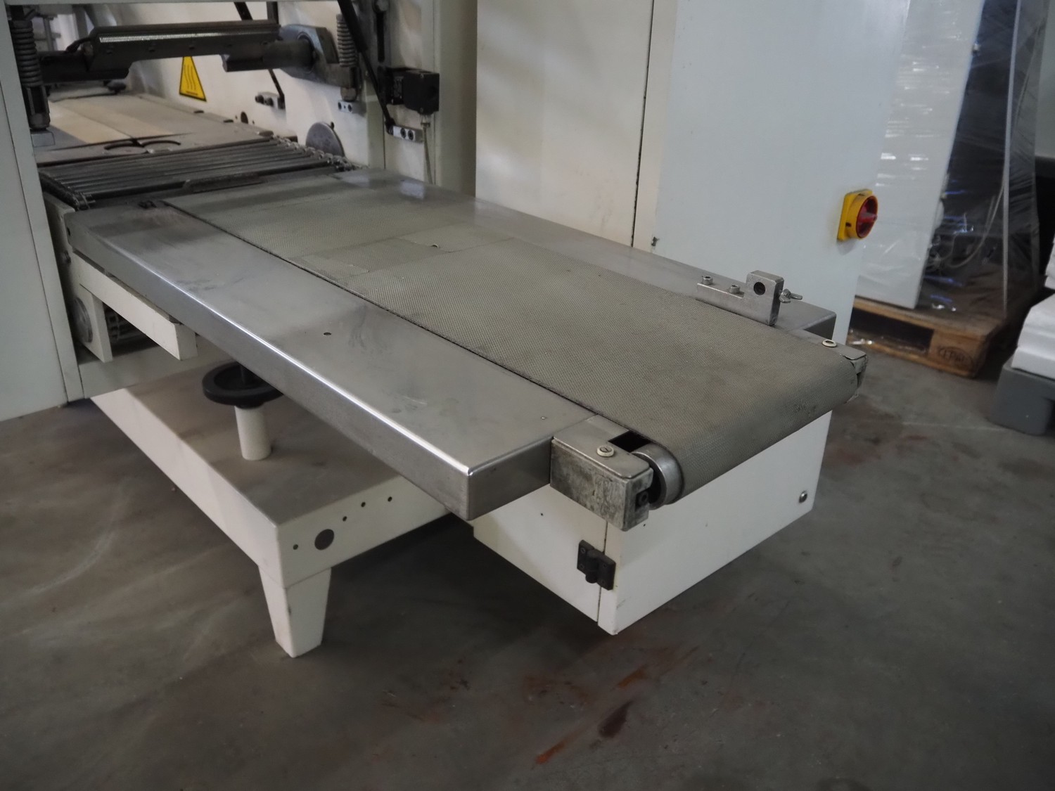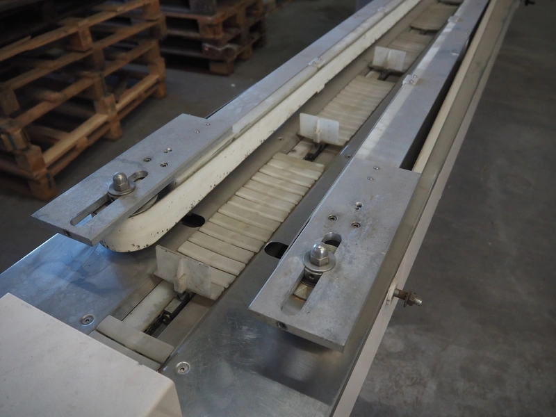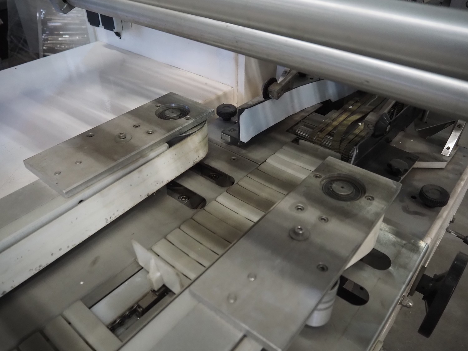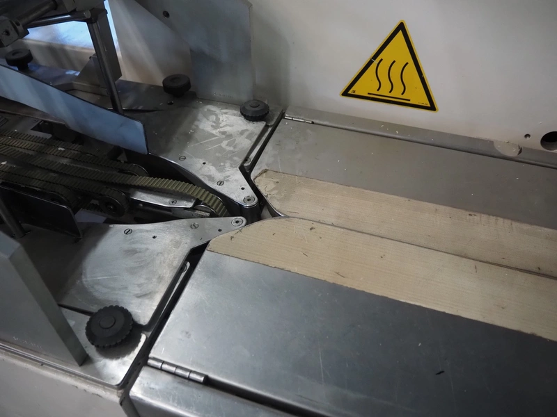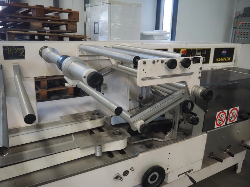 Ilapak Italia S.p.a. flowpacker, type: UNO, serial number: 061 96, year of construction: 4/1996, 380 V, 50 Hz, 5000 W, plastic infeed belt with dividers, belt width: 100 mm, divider height: 55 mm, distance between dividers: 430 mm, seal width: 250 mm, plastic outfeed belt, belt width: 240 mmm, total dimensions: 5900 mm x 1300 mm x 1310 mm.