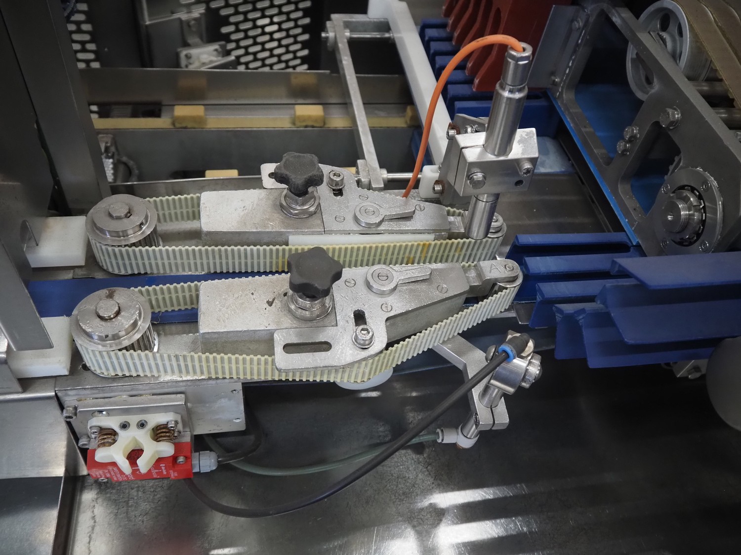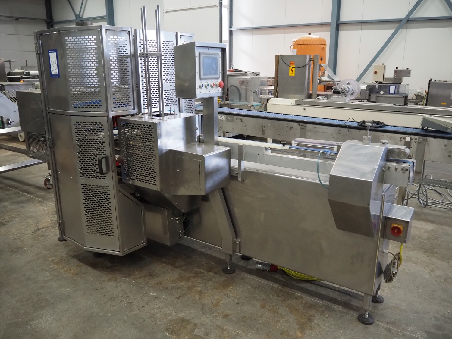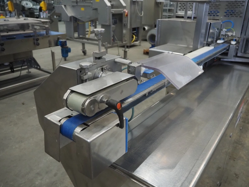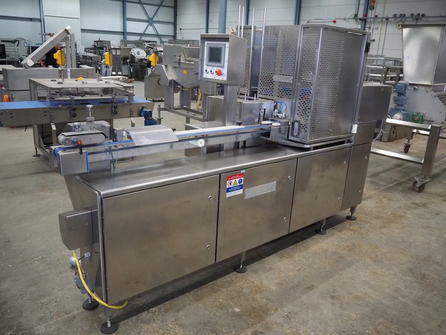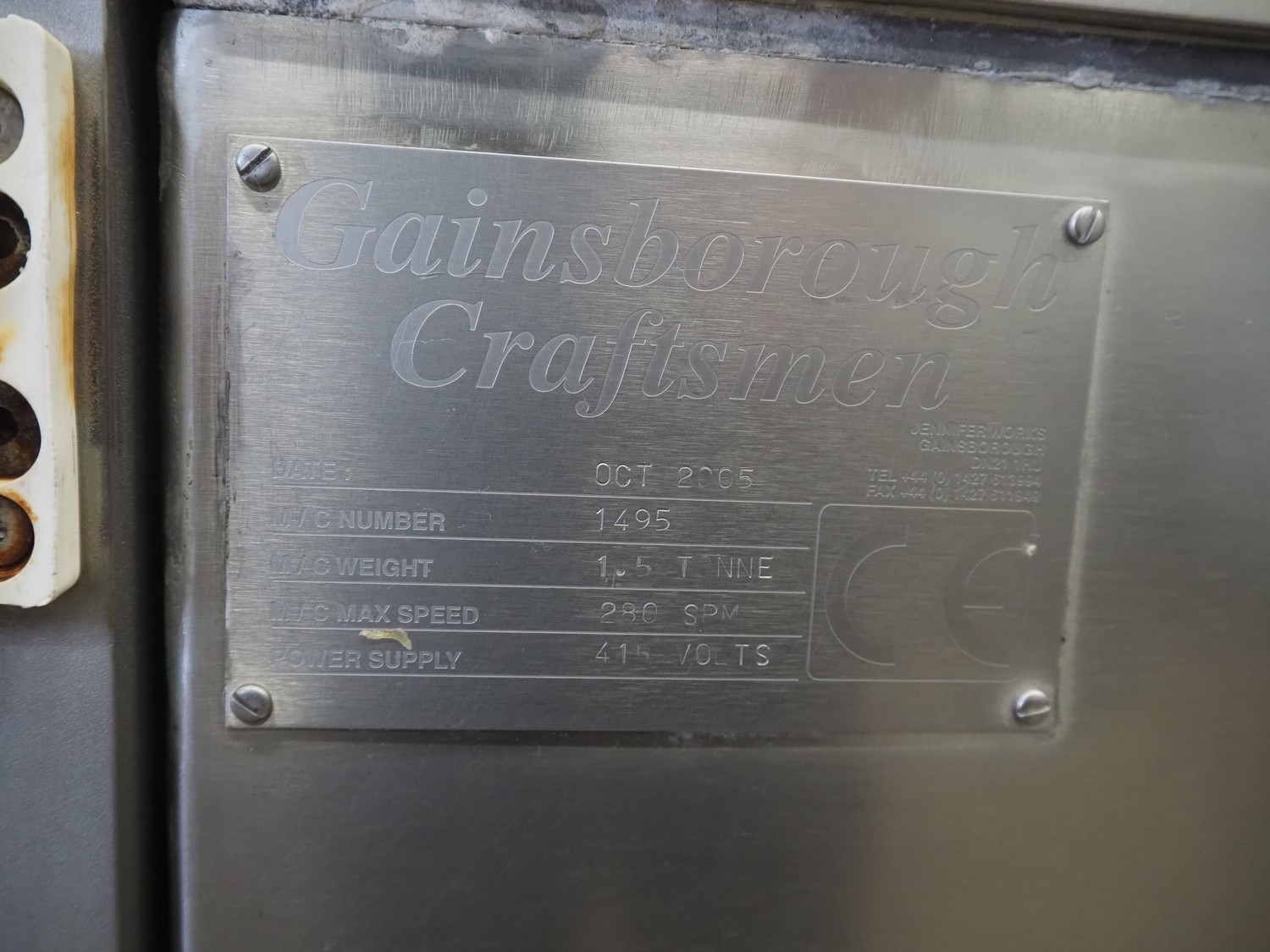 Gainsborough Craftsmen packaging machine for sausages with tray denester, machine number: 1495, year of construction: oct 2005, 415 V, weight: 1500 kg, plastic belt, belt width: 50 mm, tray dimensions: 140 mm x 190 mm, total dimensions: 3350 mm x 1050 mm x 1950 mm. Incomplete.