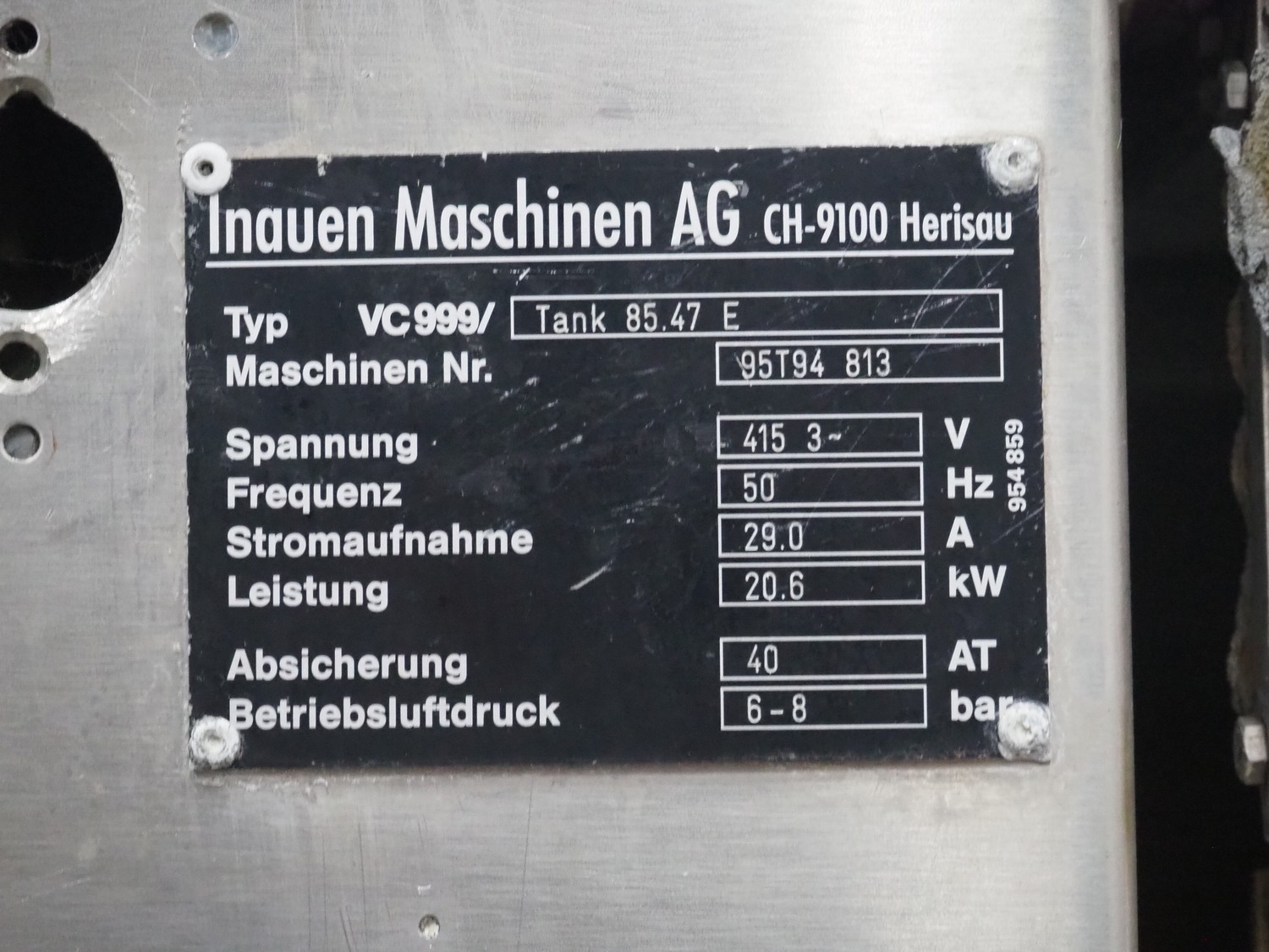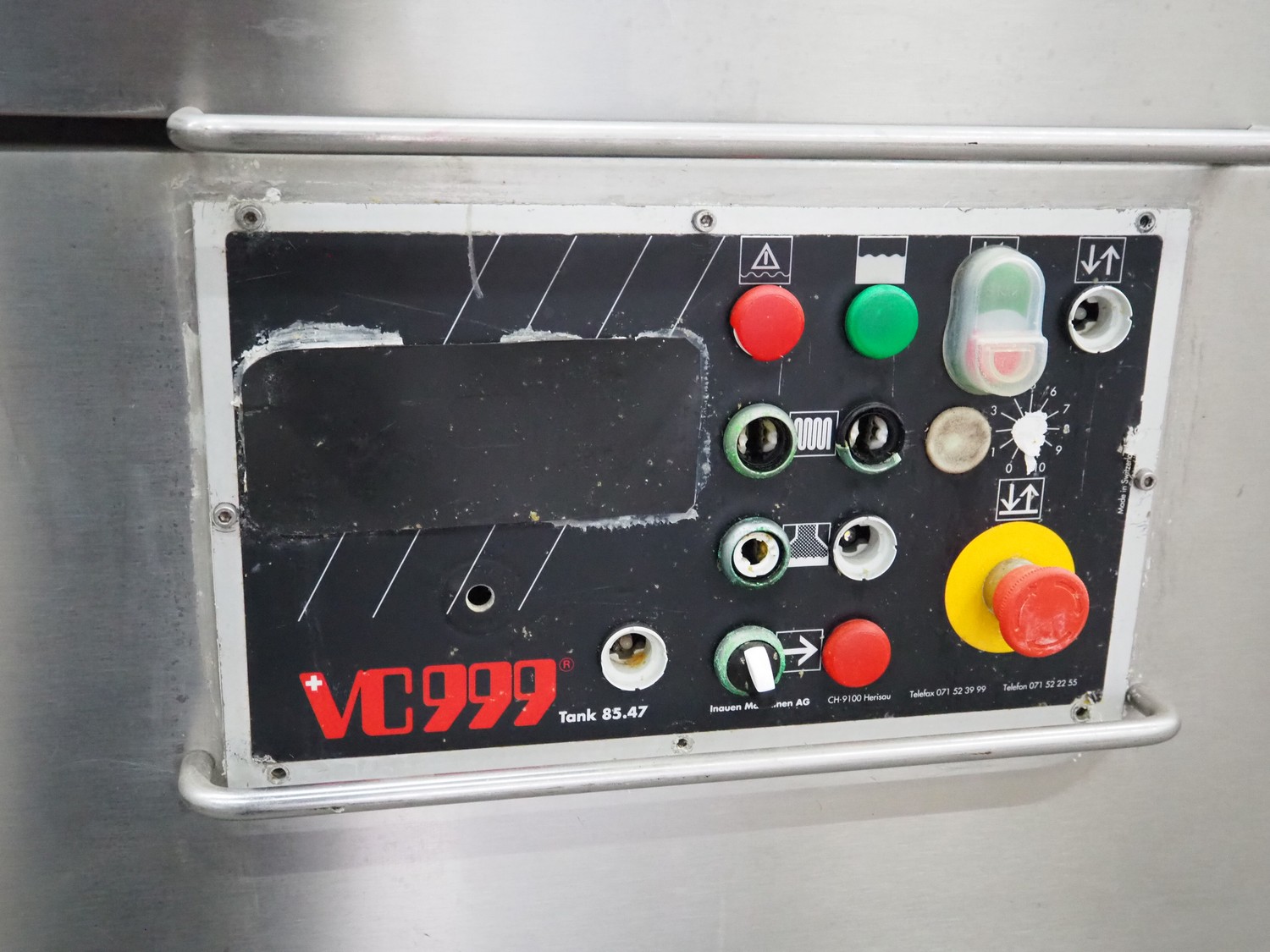 Inauen Maschinen AG dip tank, type: VC999/Tank 85.47 E, machine number: 95T94 813, 415 V, 3 Ph, 50 Hz, 29 A, 20.6 kW, s/s rollers, roller width: 470 mm, clearance: 550 mm x 320 mm, total dimensions: 1300 mm x 1000 mm x 1830 mm.