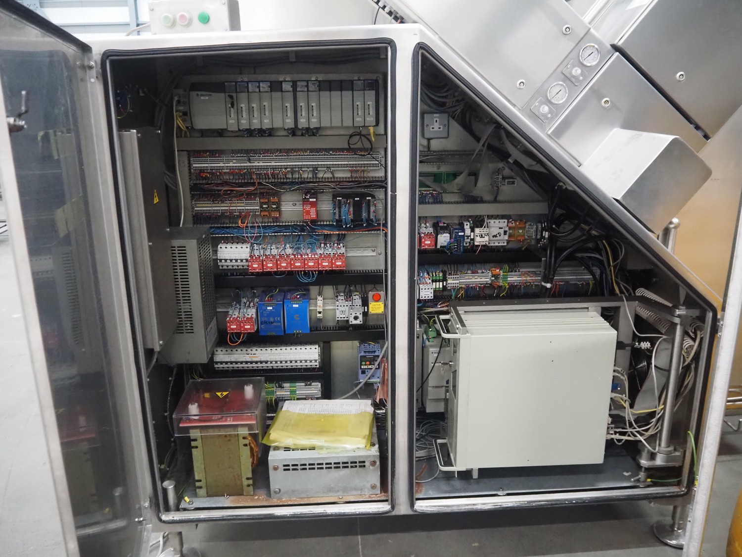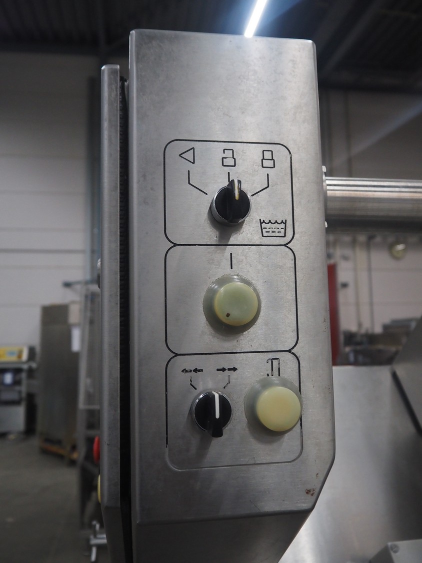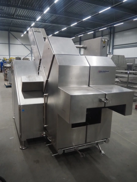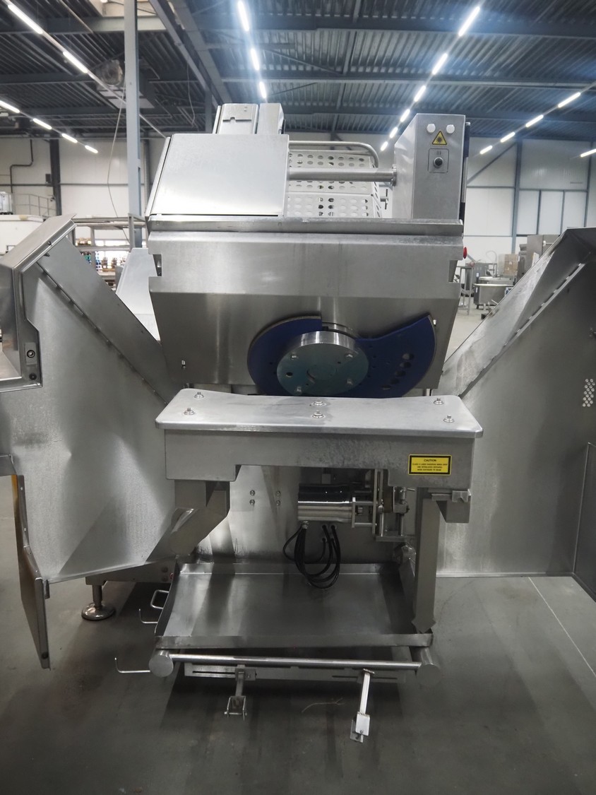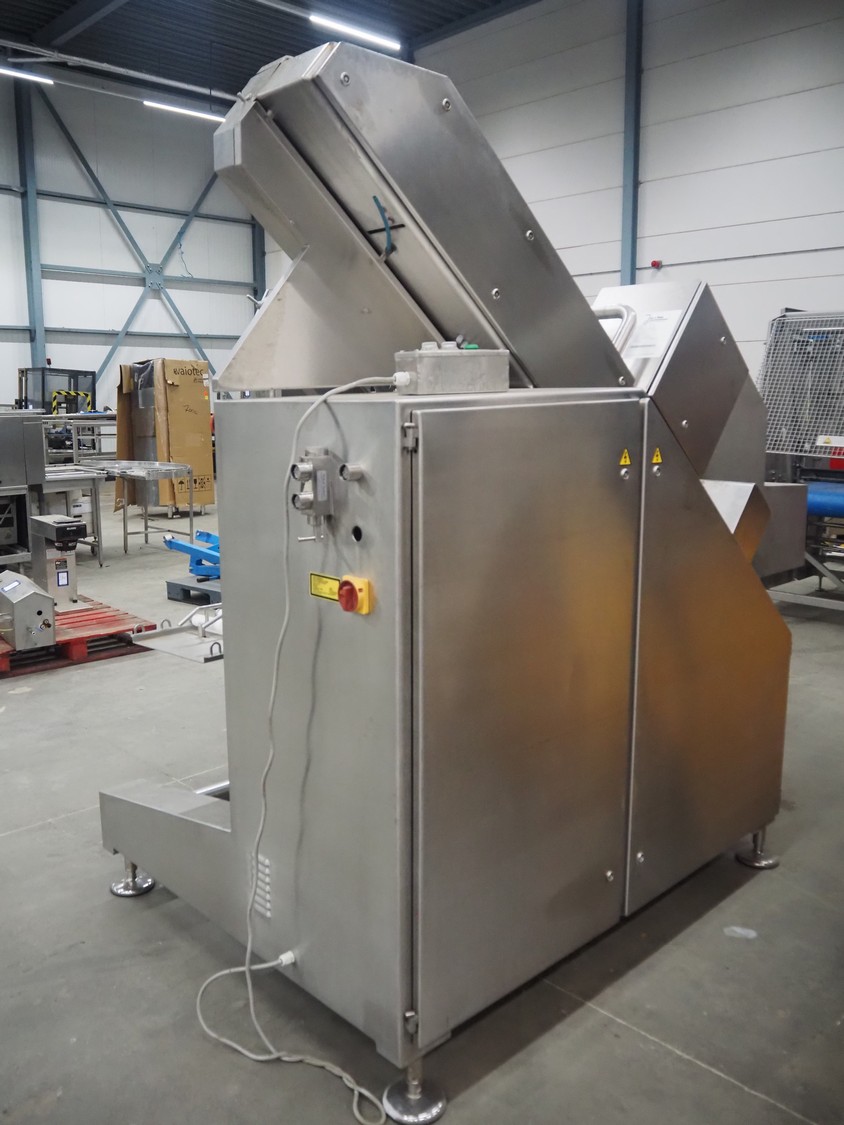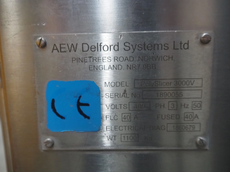 AEW Delford slicer, model: PolySlicer 3000V, serial number: 1890055, 400 V, 3 Ph, 50 Hz, 40 A, weight: 1100 kg, dimensions: 2800 mm x 1400 mm x 2350 mm. Without outfeed belt.