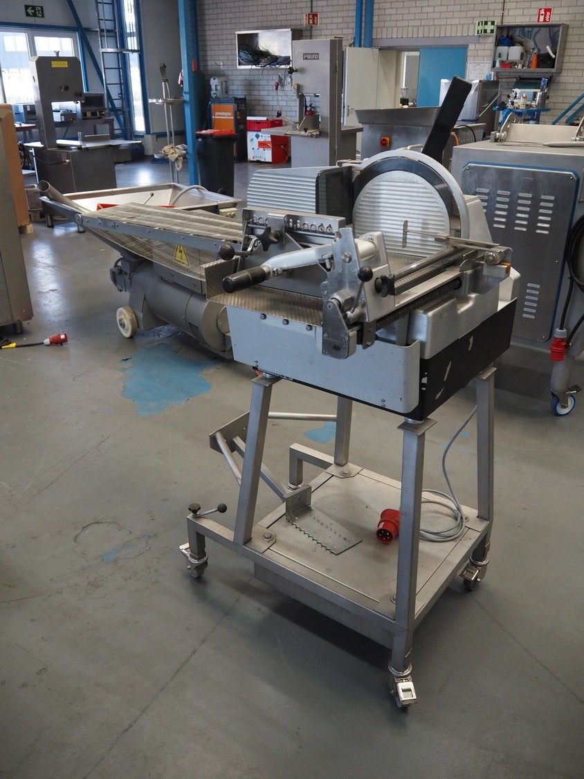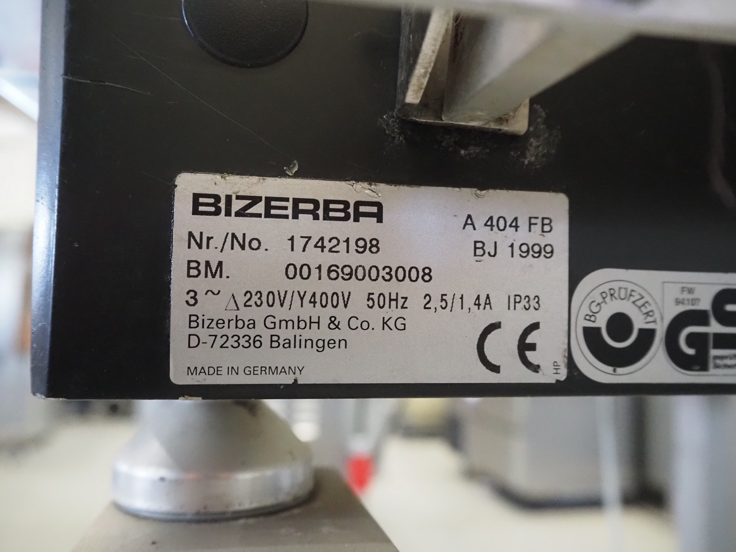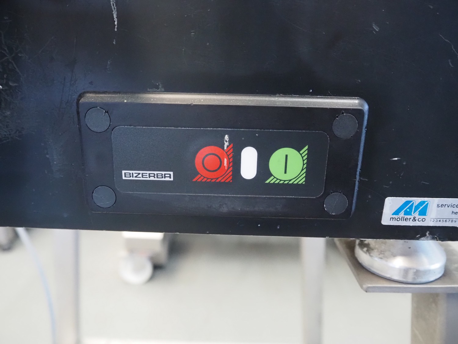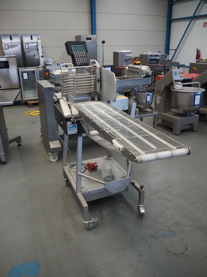 Bizerba mobile automatic slicer, model: A 404 FB, number: 1742198, year of construction: 1999, 230/400 V, 3 Ph, 50 Hz, 2.5/1.4 A, s/s mesh outfeed belt, belt width: 250 mm, total dimensions: 1700 mm x 1000 mm x 1600 mm.