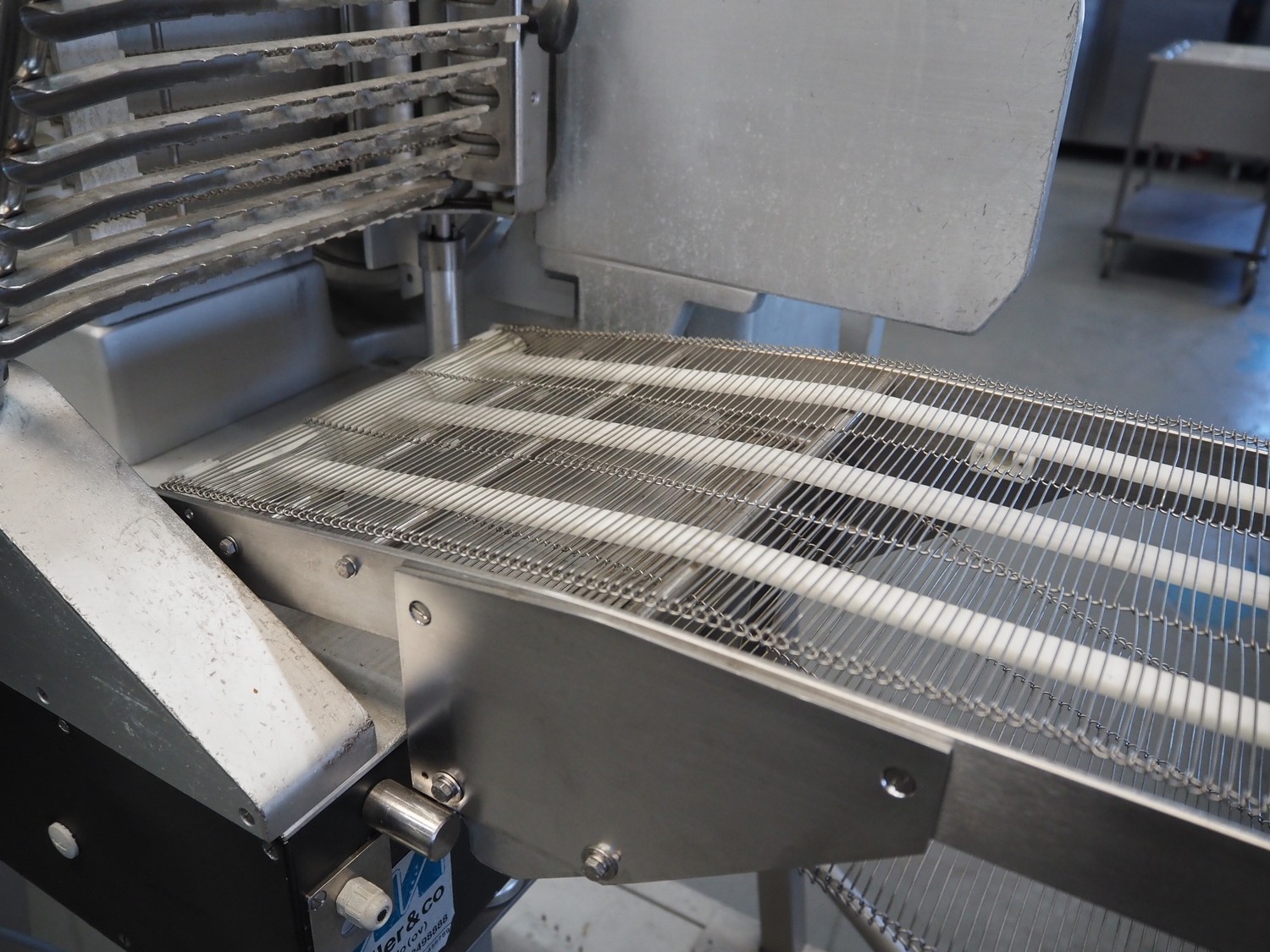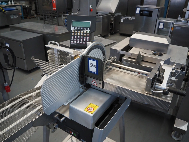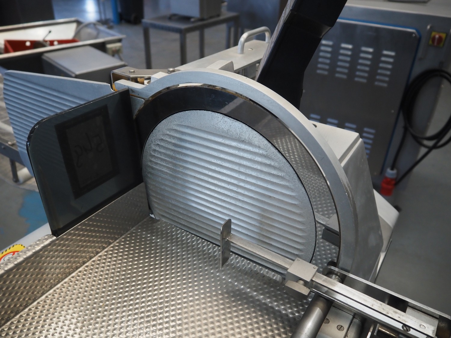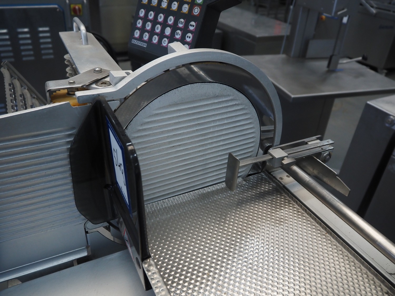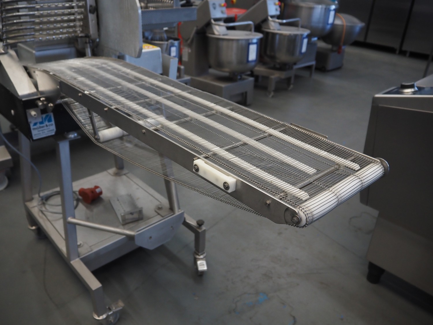 Bizerba mobile automatic slicer, model: A 404 FB, number: 1742198, year of construction: 1999, 230/400 V, 3 Ph, 50 Hz, 2.5/1.4 A, s/s mesh outfeed belt, belt width: 250 mm, total dimensions: 1700 mm x 1000 mm x 1600 mm.