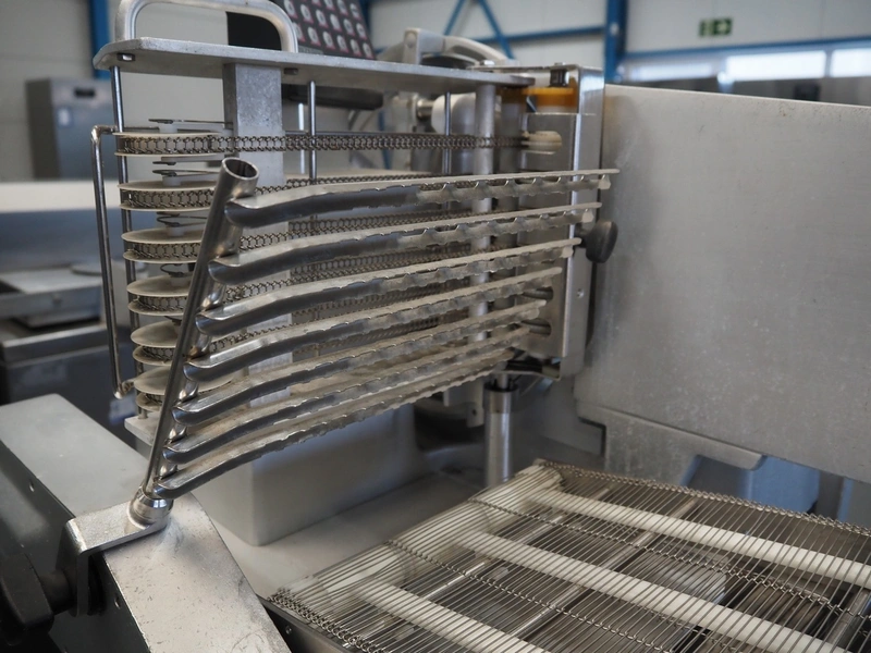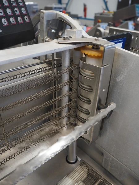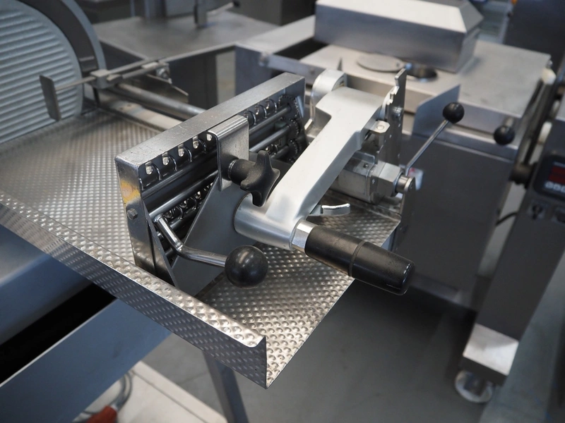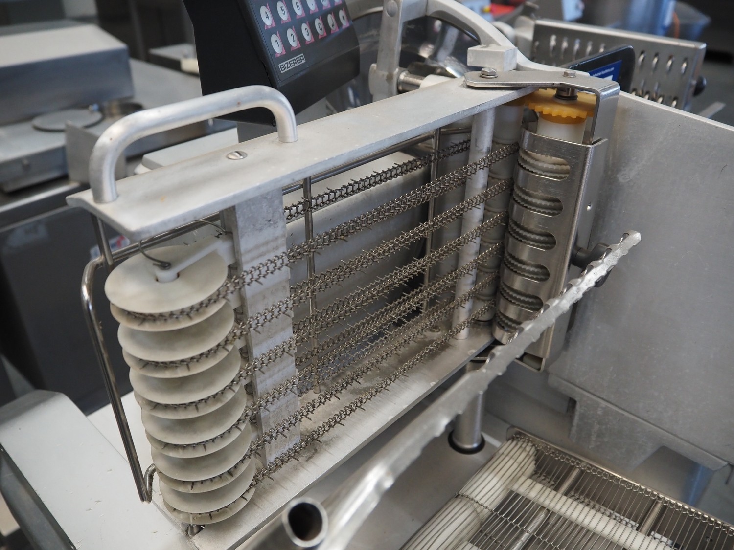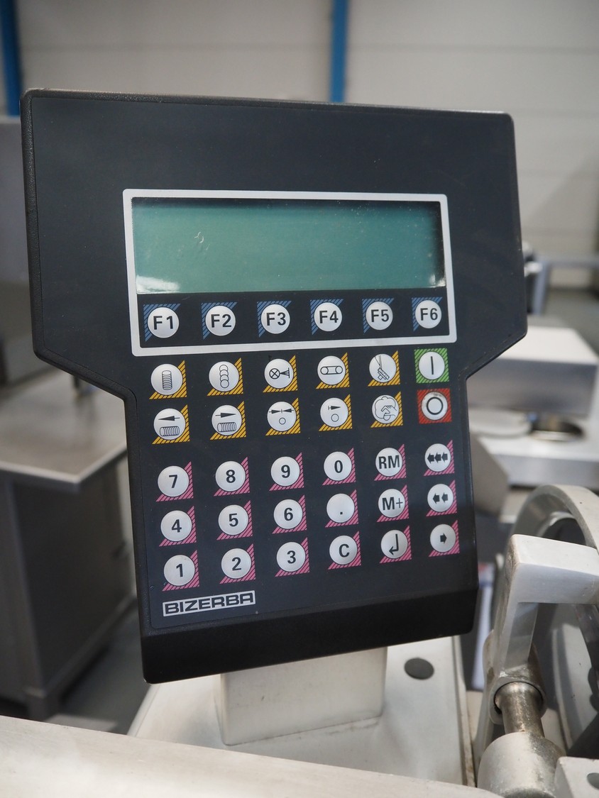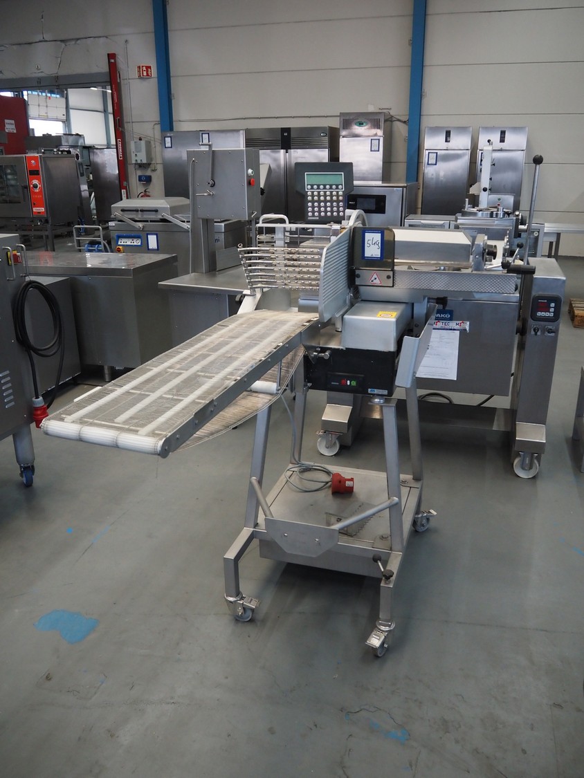 Bizerba mobile automatic slicer, model: A 404 FB, number: 1742198, year of construction: 1999, 230/400 V, 3 Ph, 50 Hz, 2.5/1.4 A, s/s mesh outfeed belt, belt width: 250 mm, total dimensions: 1700 mm x 1000 mm x 1600 mm.