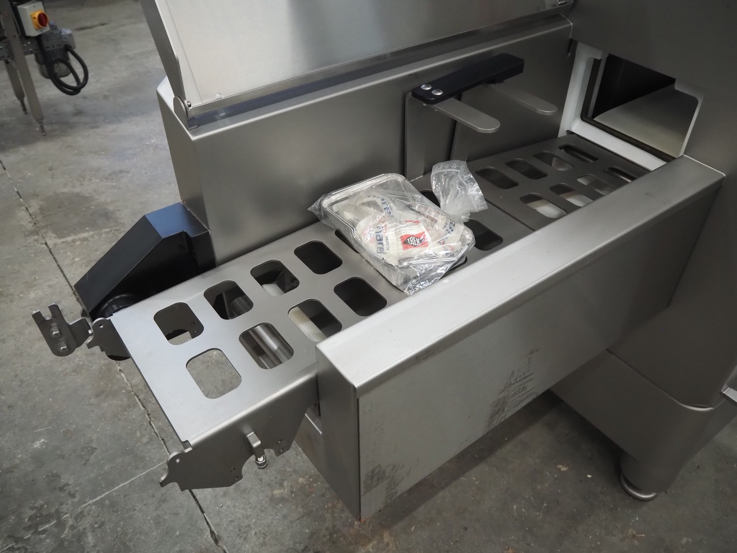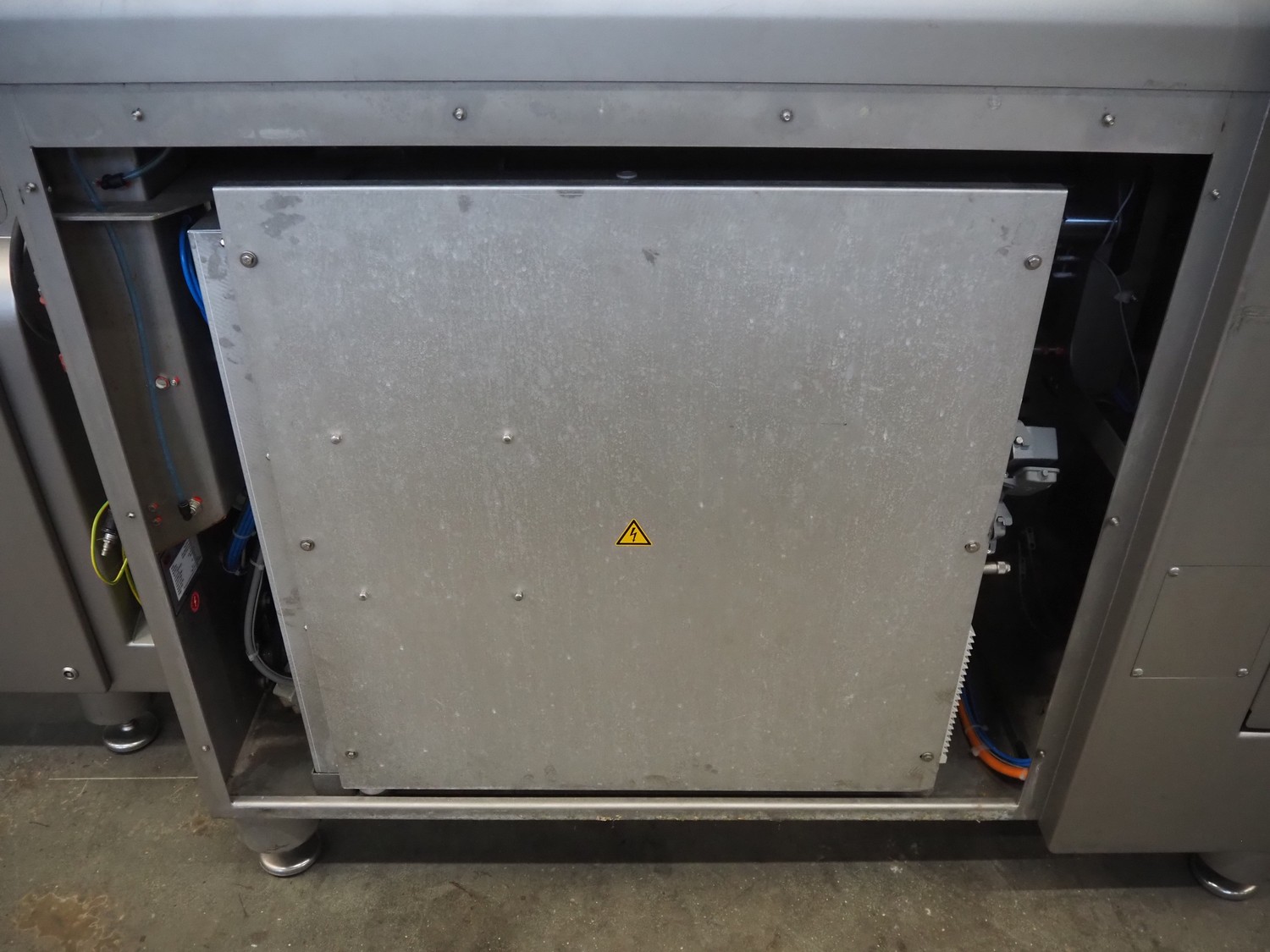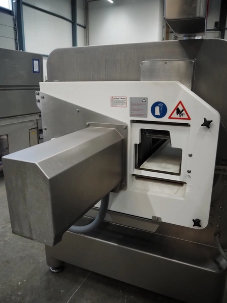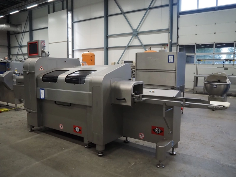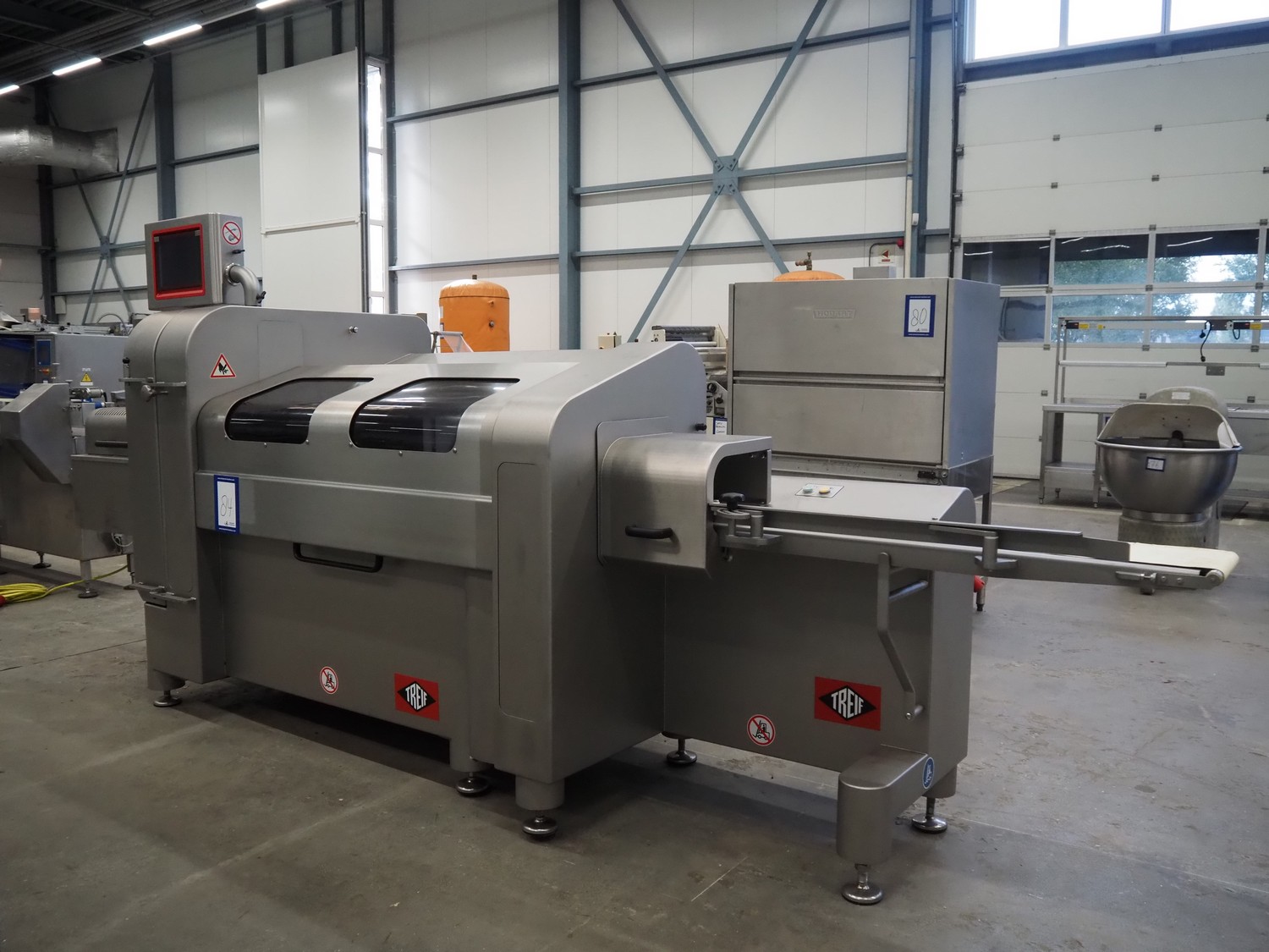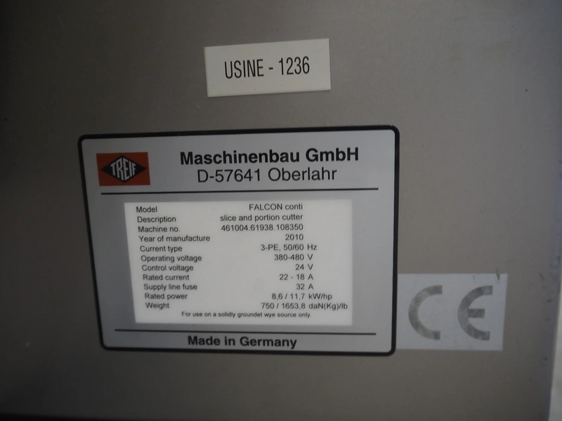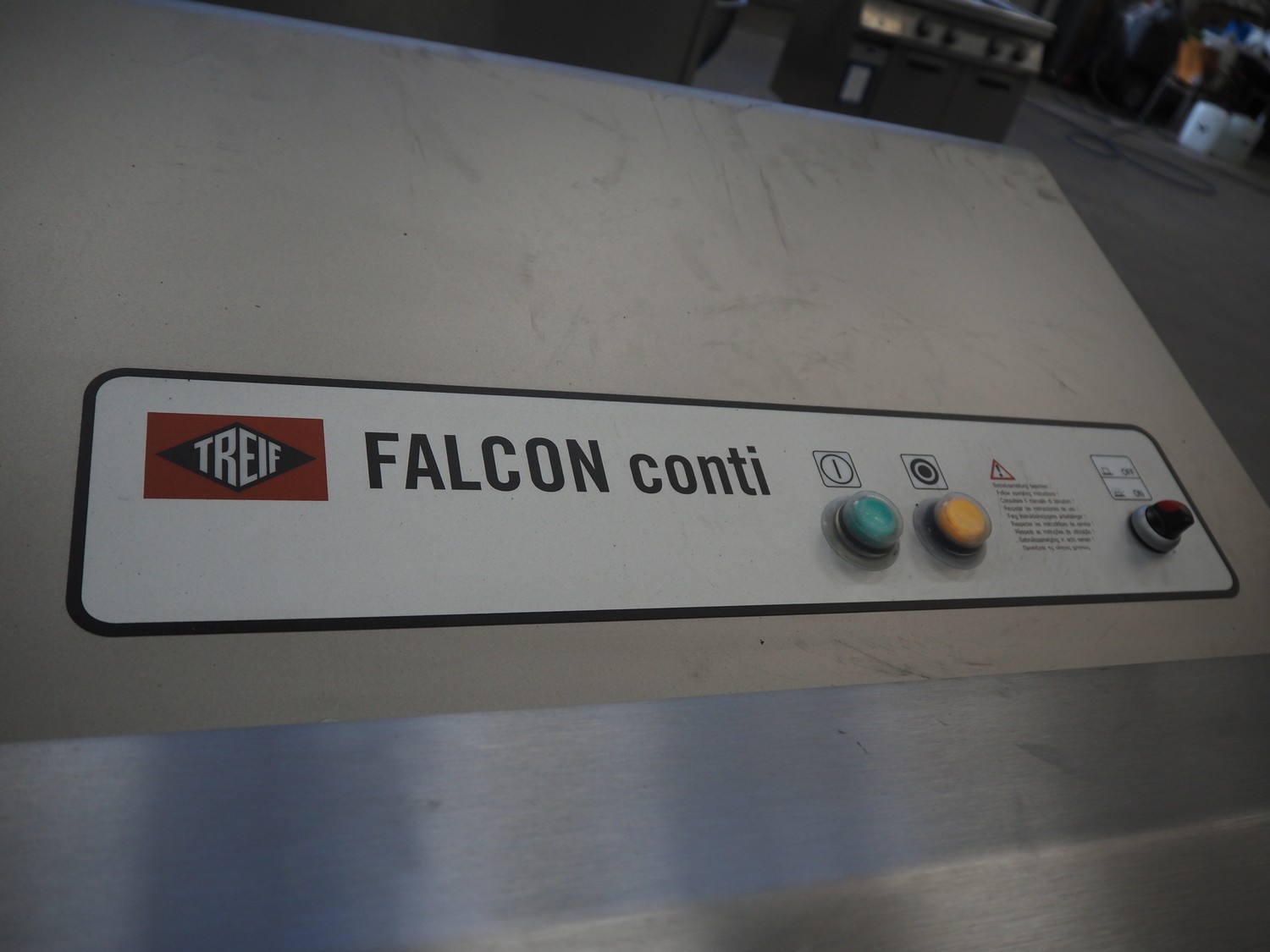 Treif slicer, model: FALCON conti, machine number: 461004.61938.108350, year of construction: 2010, 380-480 V, 3 Ph, 50/60 Hz, 32 A, 8.6/11.7 kW, weight: 750 kg, plastic belt, belt width: 260 mm x 180 mm, total dimensions: 4600 mm x 1250 mm x 1830 mm. Without knife.