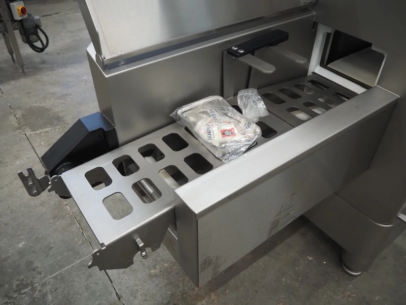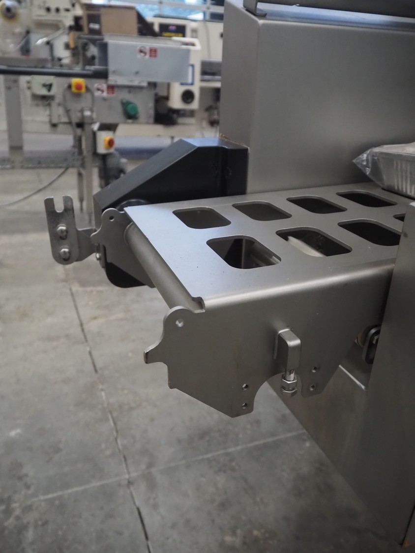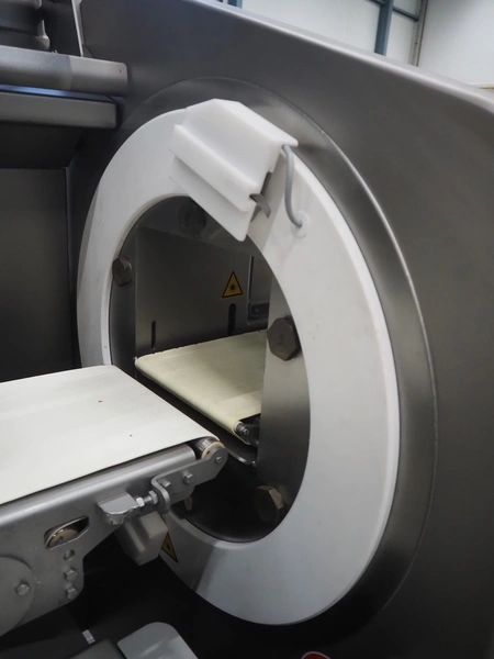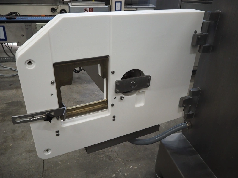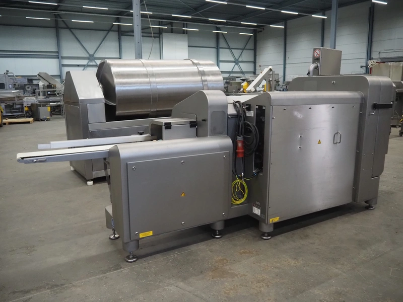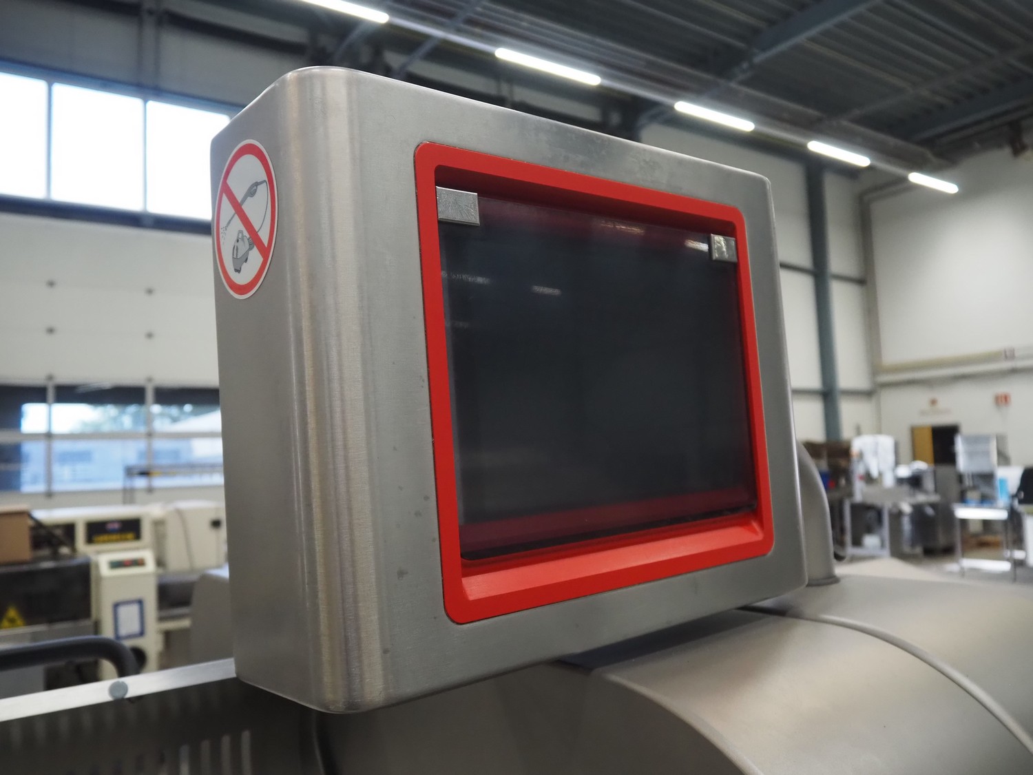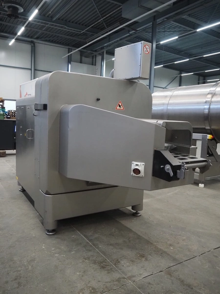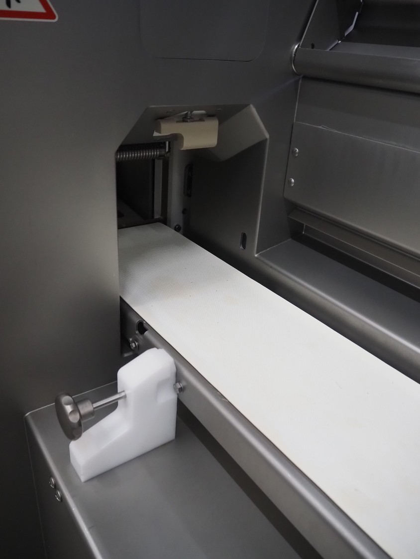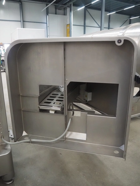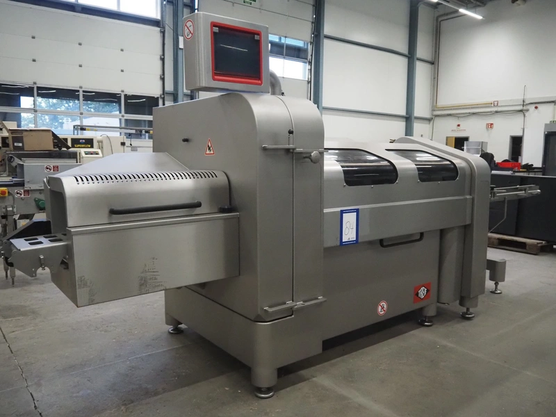 Treif slicer, model: FALCON conti, machine number: 461004.61938.108350, year of construction: 2010, 380-480 V, 3 Ph, 50/60 Hz, 32 A, 8.6/11.7 kW, weight: 750 kg, plastic belt, belt width: 260 mm x 180 mm, total dimensions: 4600 mm x 1250 mm x 1830 mm. Without knife.
