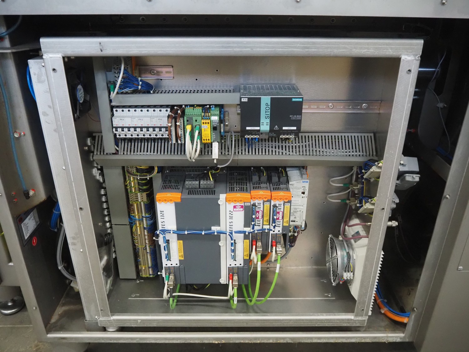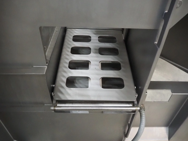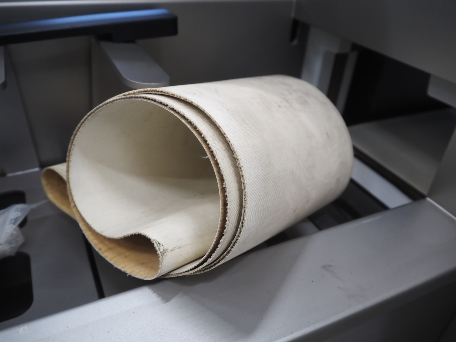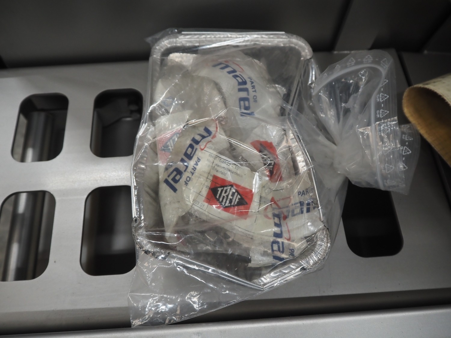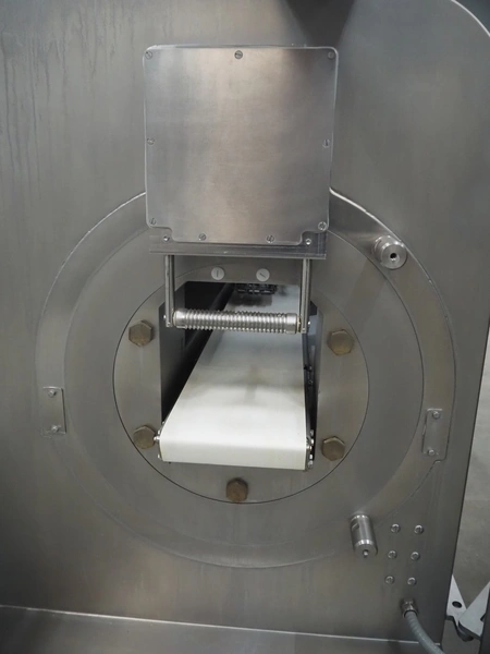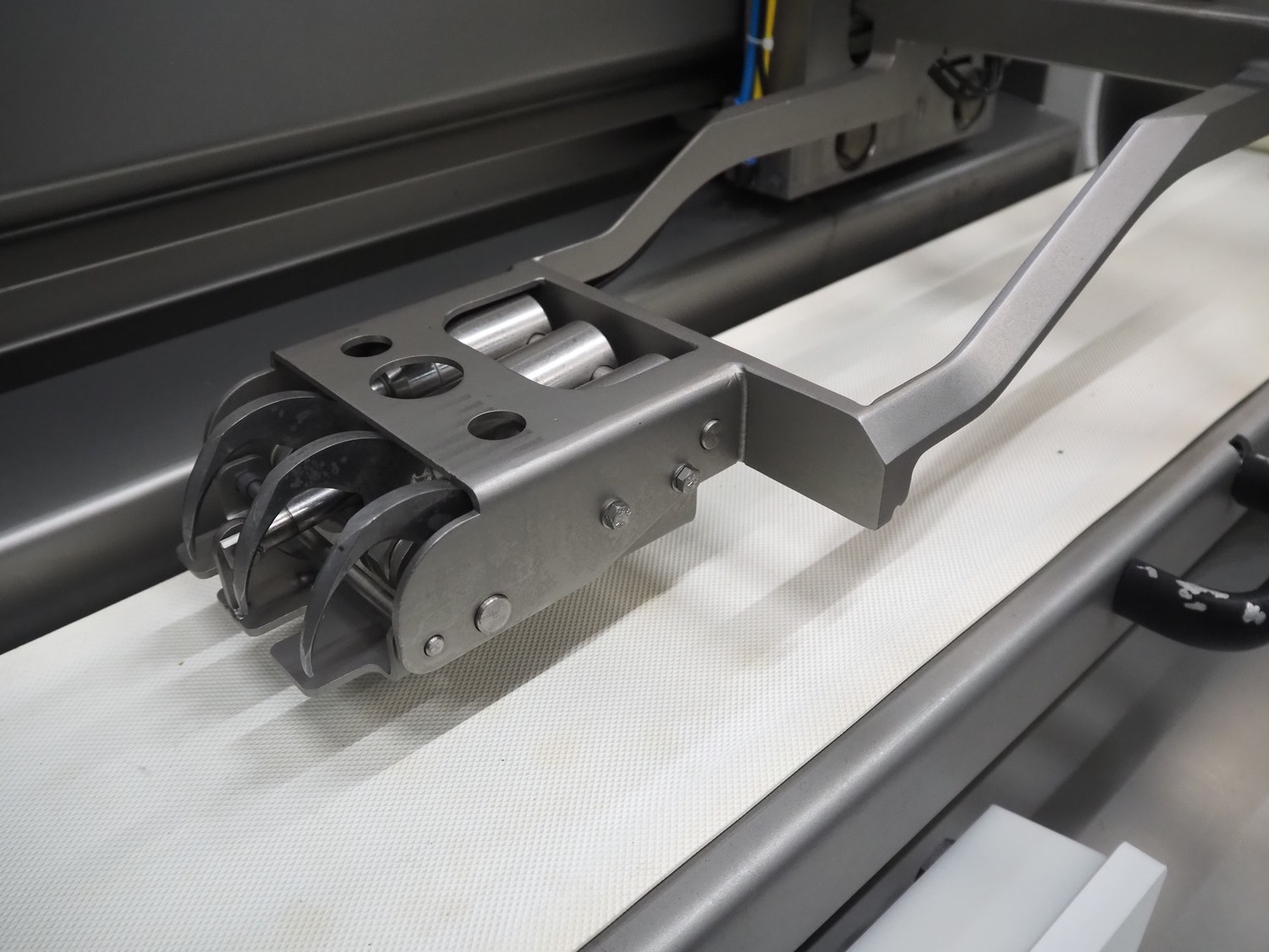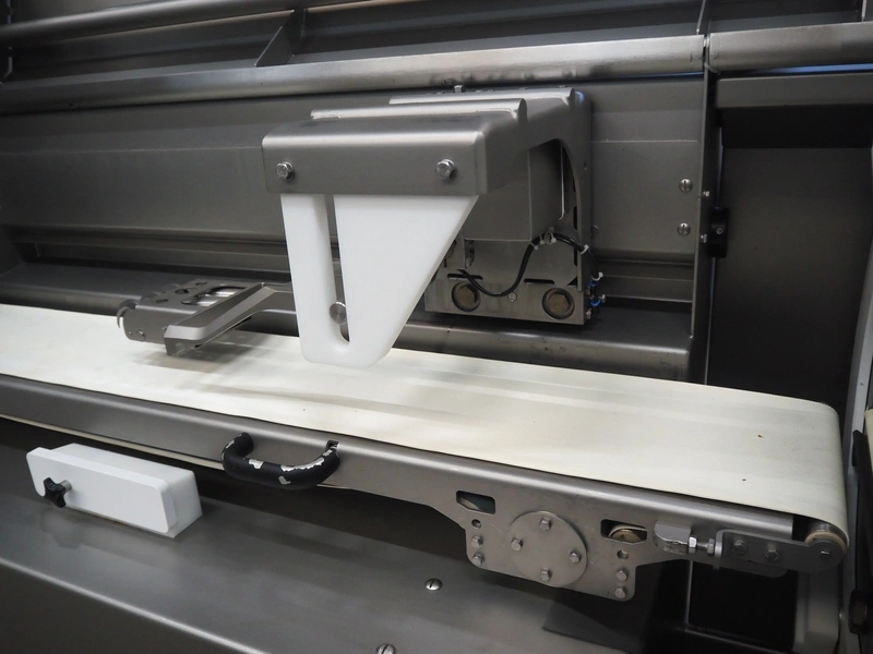 Treif slicer, model: FALCON conti, machine number: 461004.61938.108350, year of construction: 2010, 380-480 V, 3 Ph, 50/60 Hz, 32 A, 8.6/11.7 kW, weight: 750 kg, plastic belt, belt width: 260 mm x 180 mm, total dimensions: 4600 mm x 1250 mm x 1830 mm. Without knife.