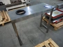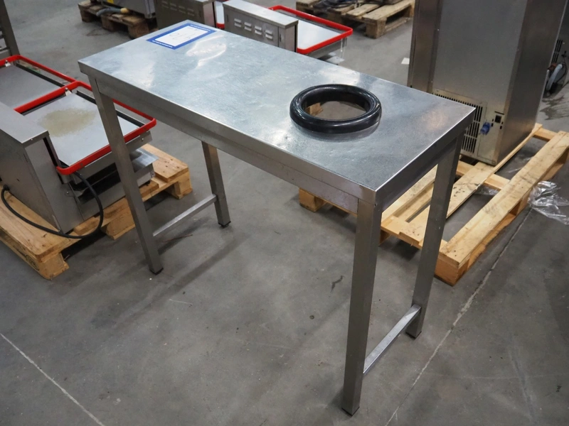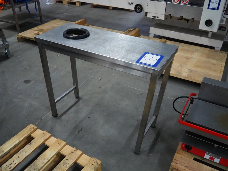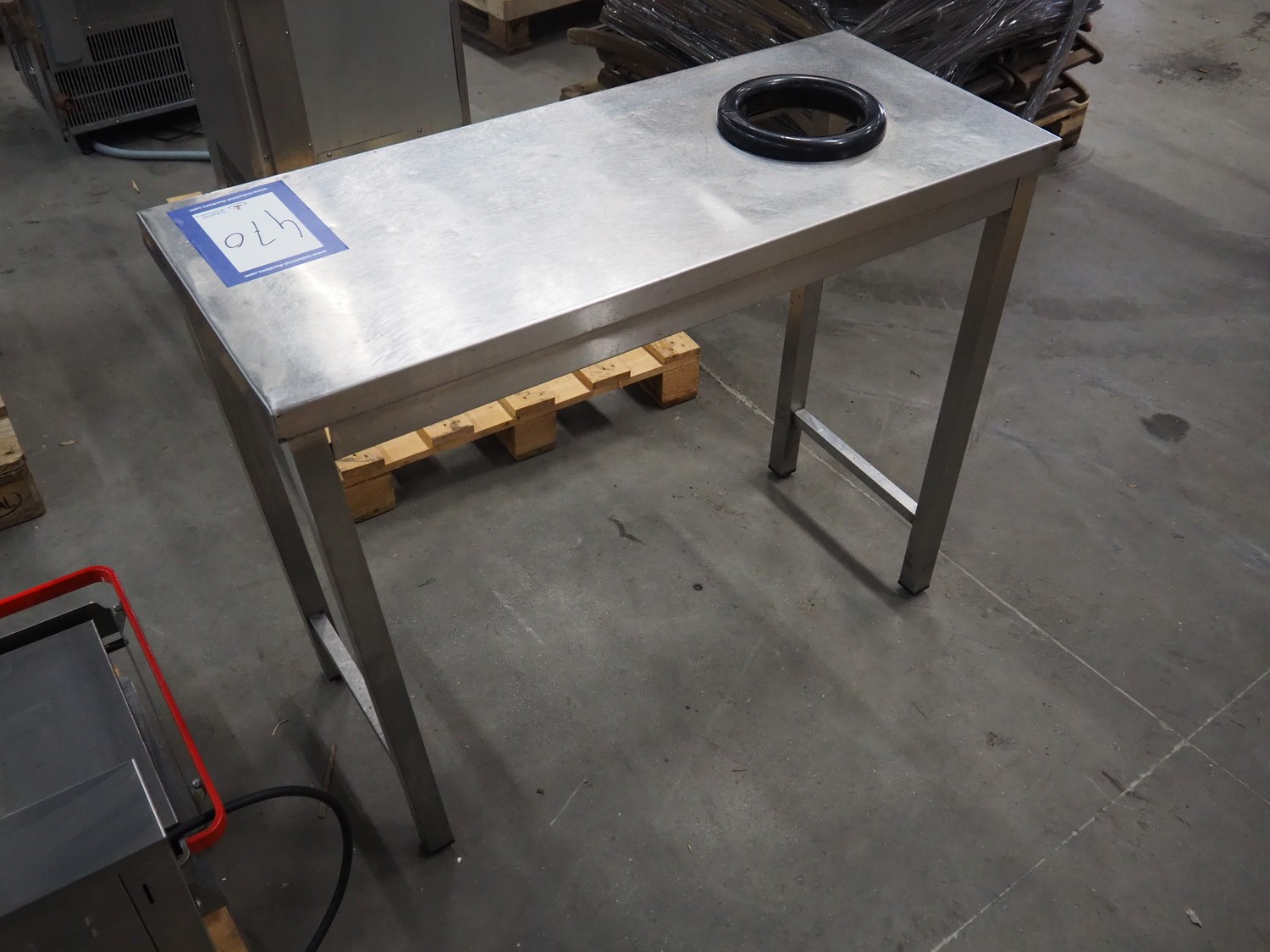 S/s table with opening, top dimensions: 1100 mm x 450 mm, opening: Ø 160 mm, total dimensions: 1100 mm x 450 mm x 920 mm.