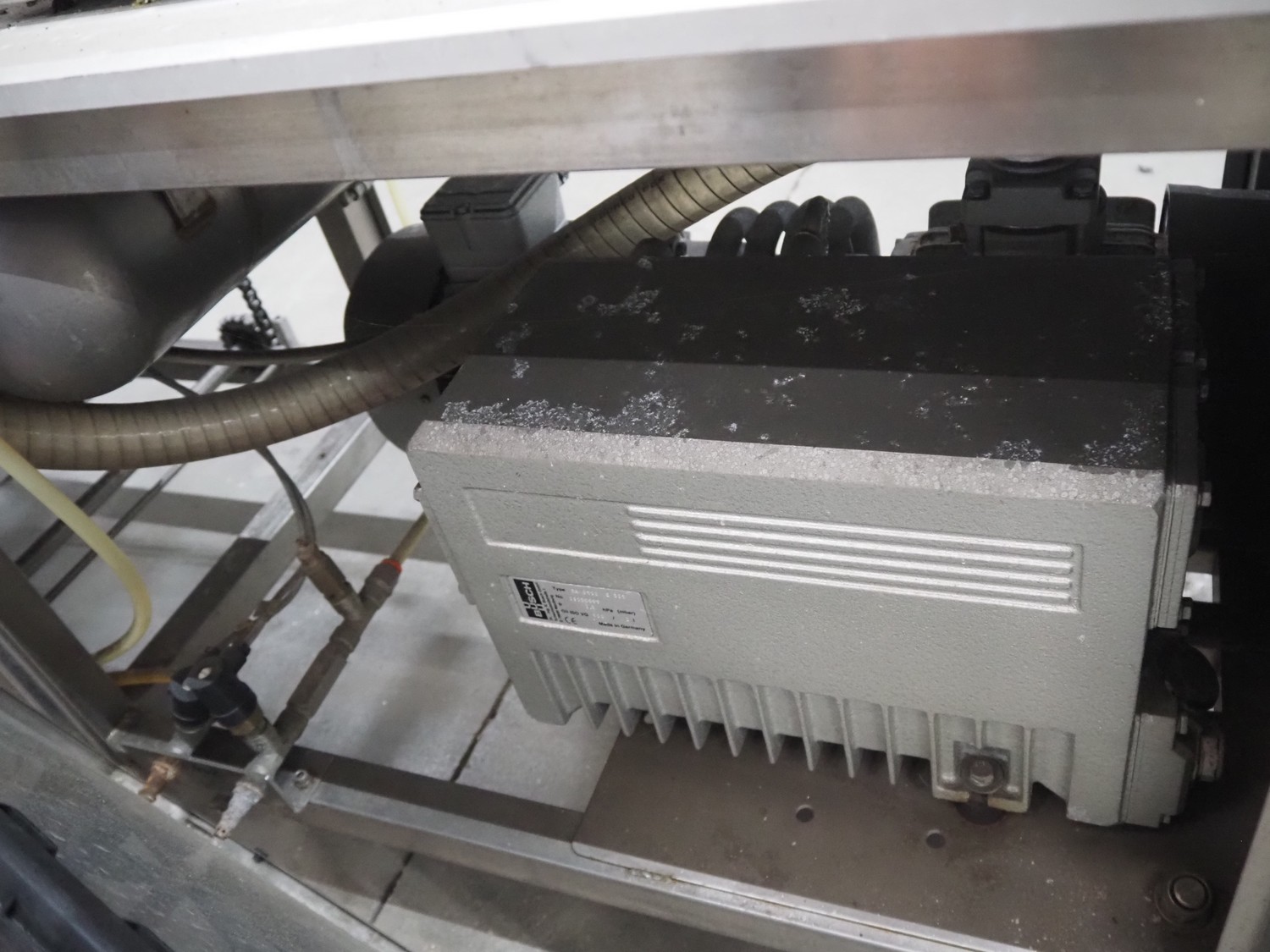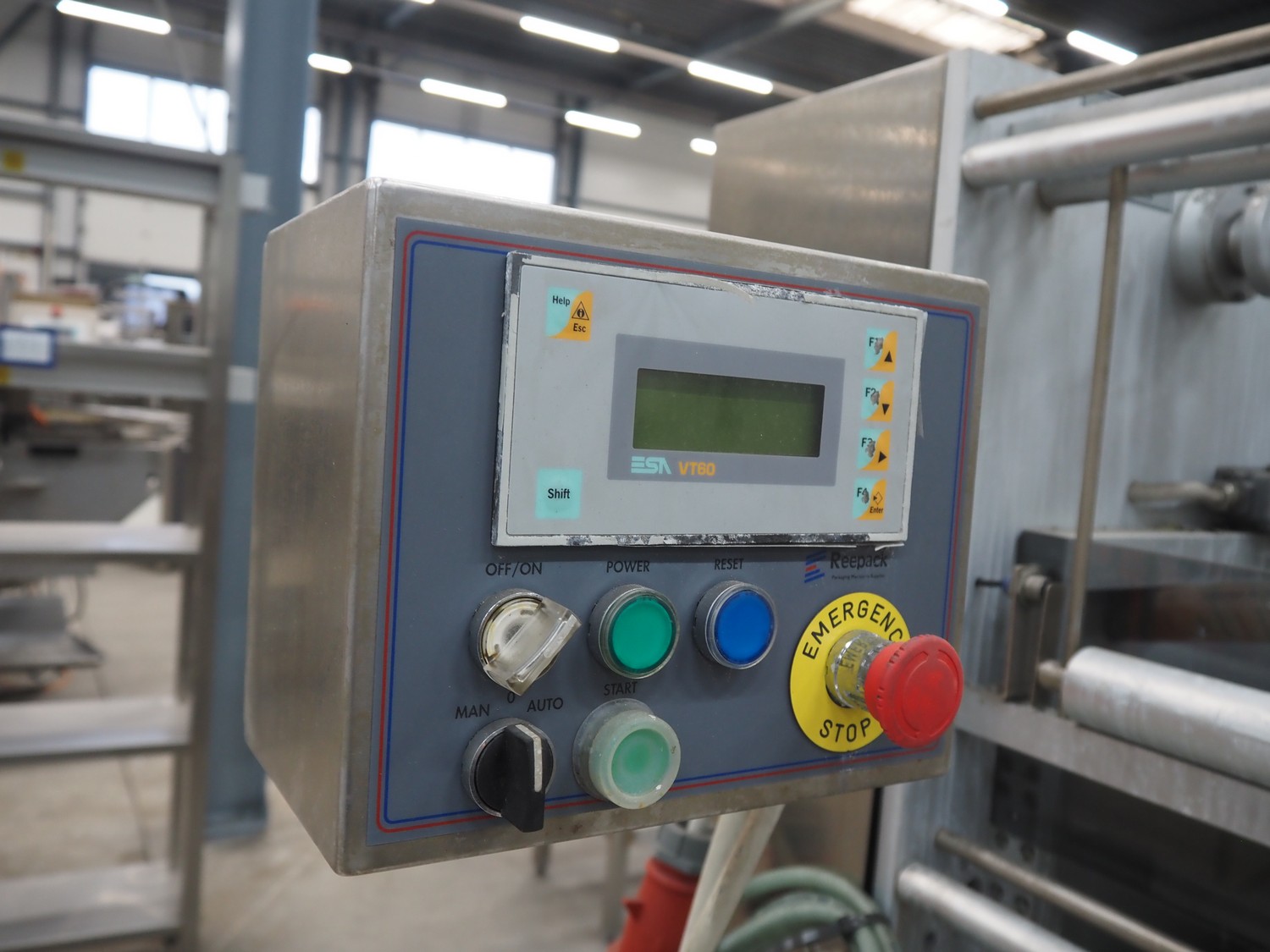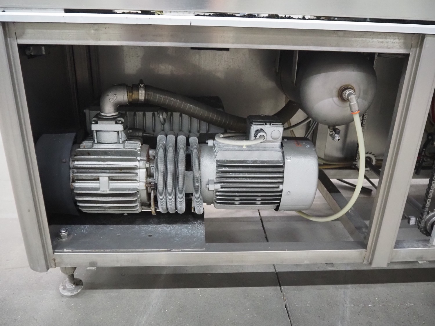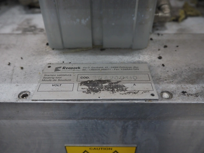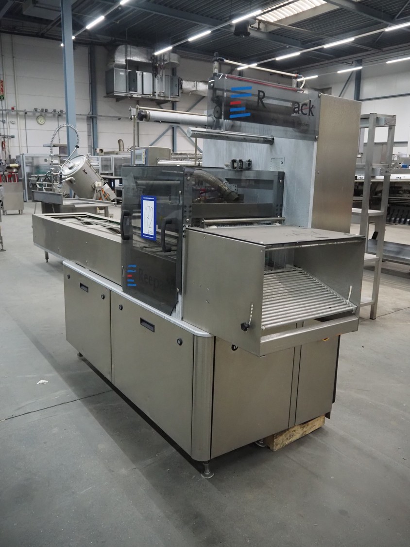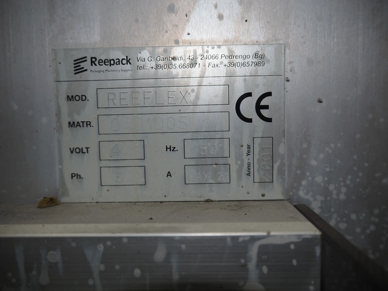 Reepack traysealer, model: REEFLEX, serial number: 0401005, year of construction: 2001, 400 V, 3 Ph, 50 Hz, max 21 A, dye: (2x) 200 mm x 135 mm, Busch vacuum pump, type: RA 0100 E 501, capacity: 100 m³ per hour, total dimensions: 2950 mm x 900 mm x 1750 mm. 1 leg broken.