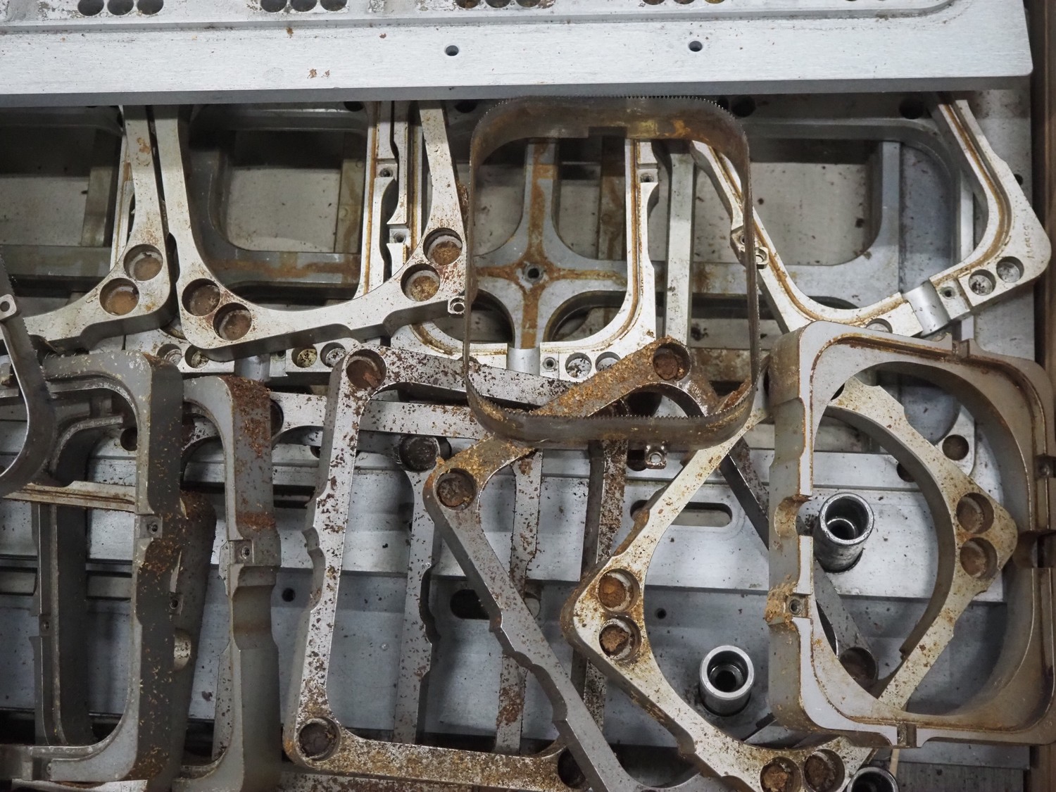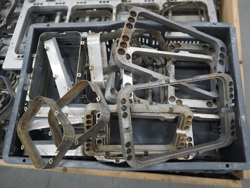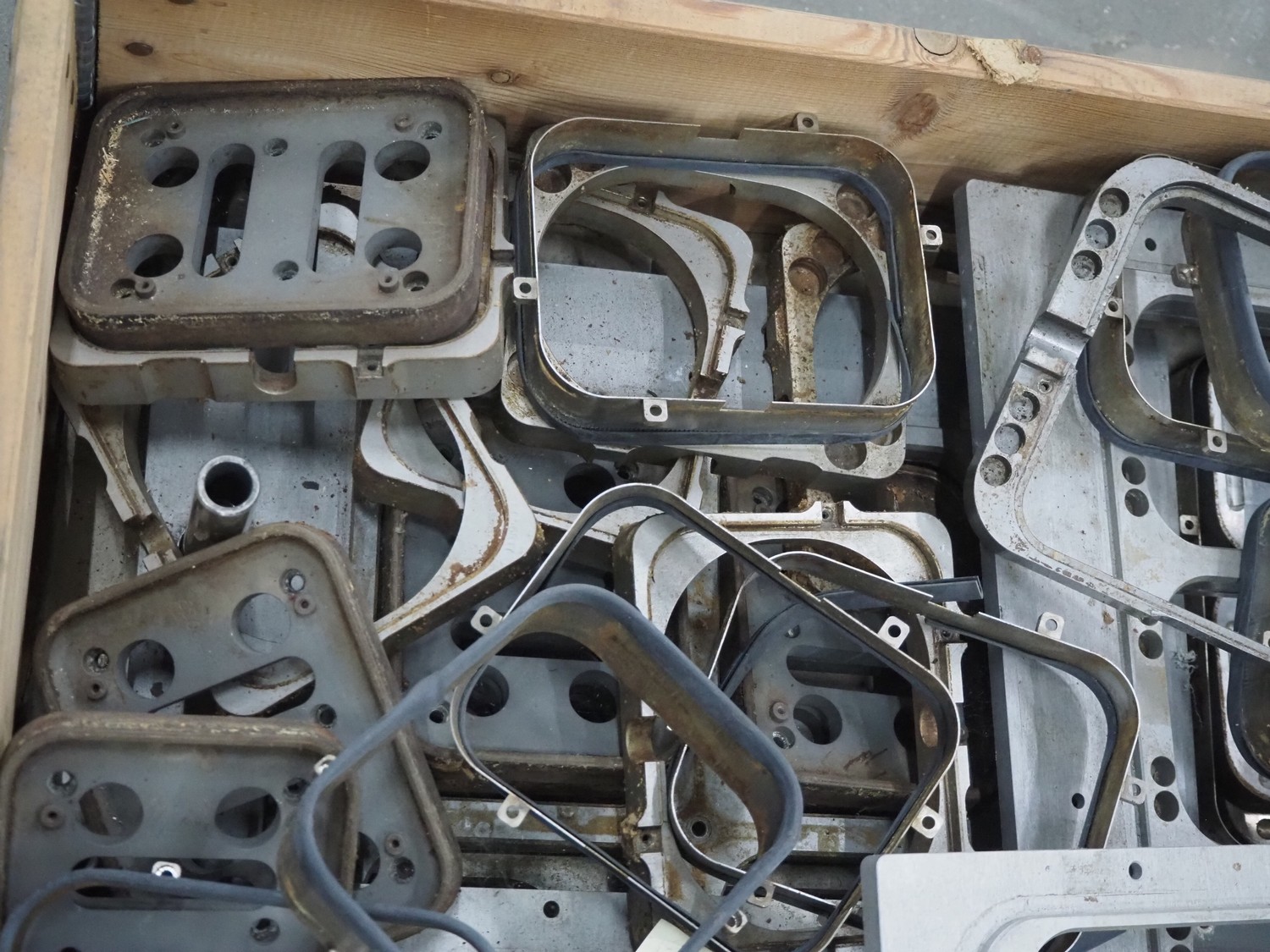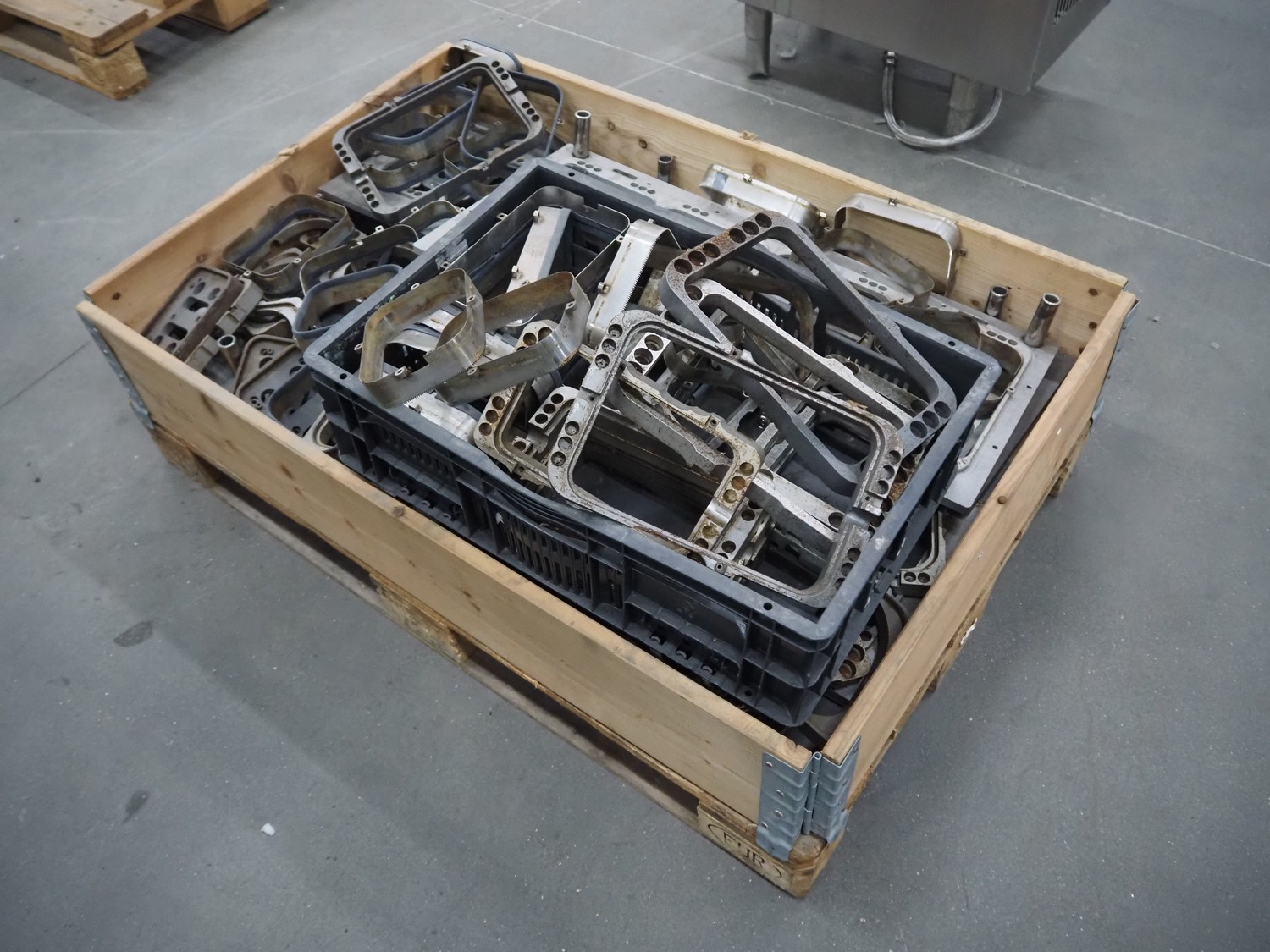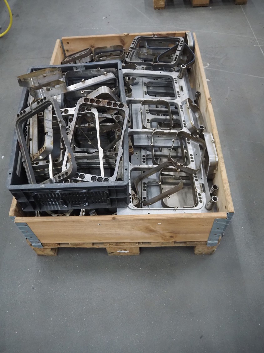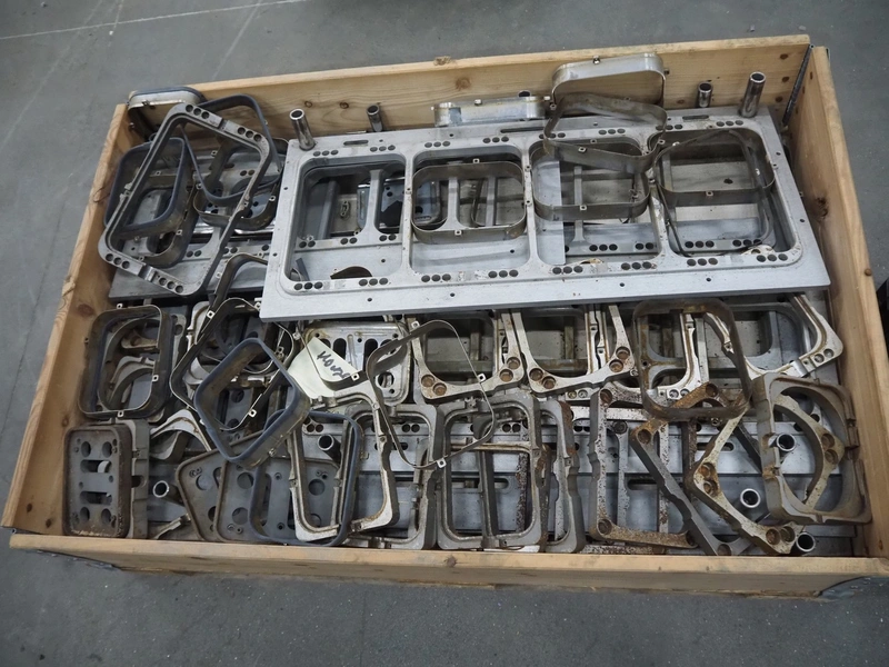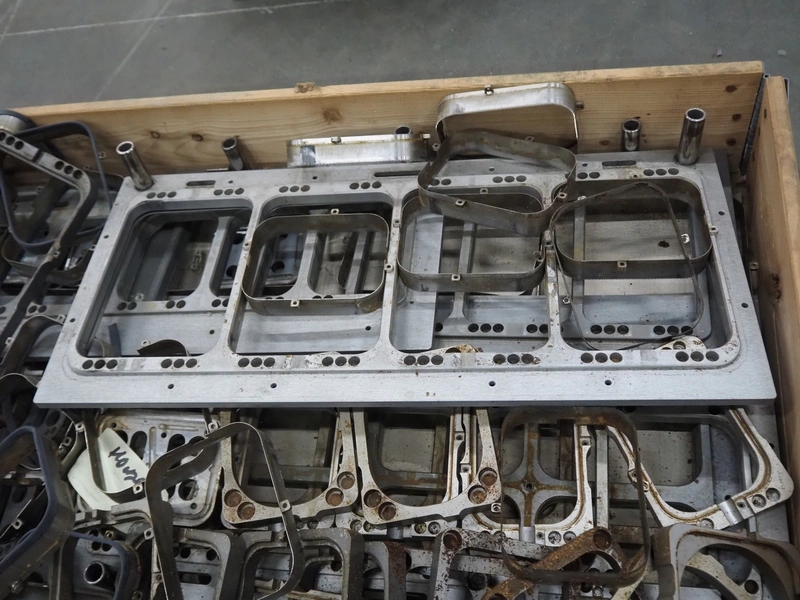 Pallet with large amount of forms for traysealer, dimensions dyes: 260 mm x 175 mm, 180 mm x 135 mm and 260 mm x 175 mm, total dimensions: 1200 mm x 800 mm x 500 mm.