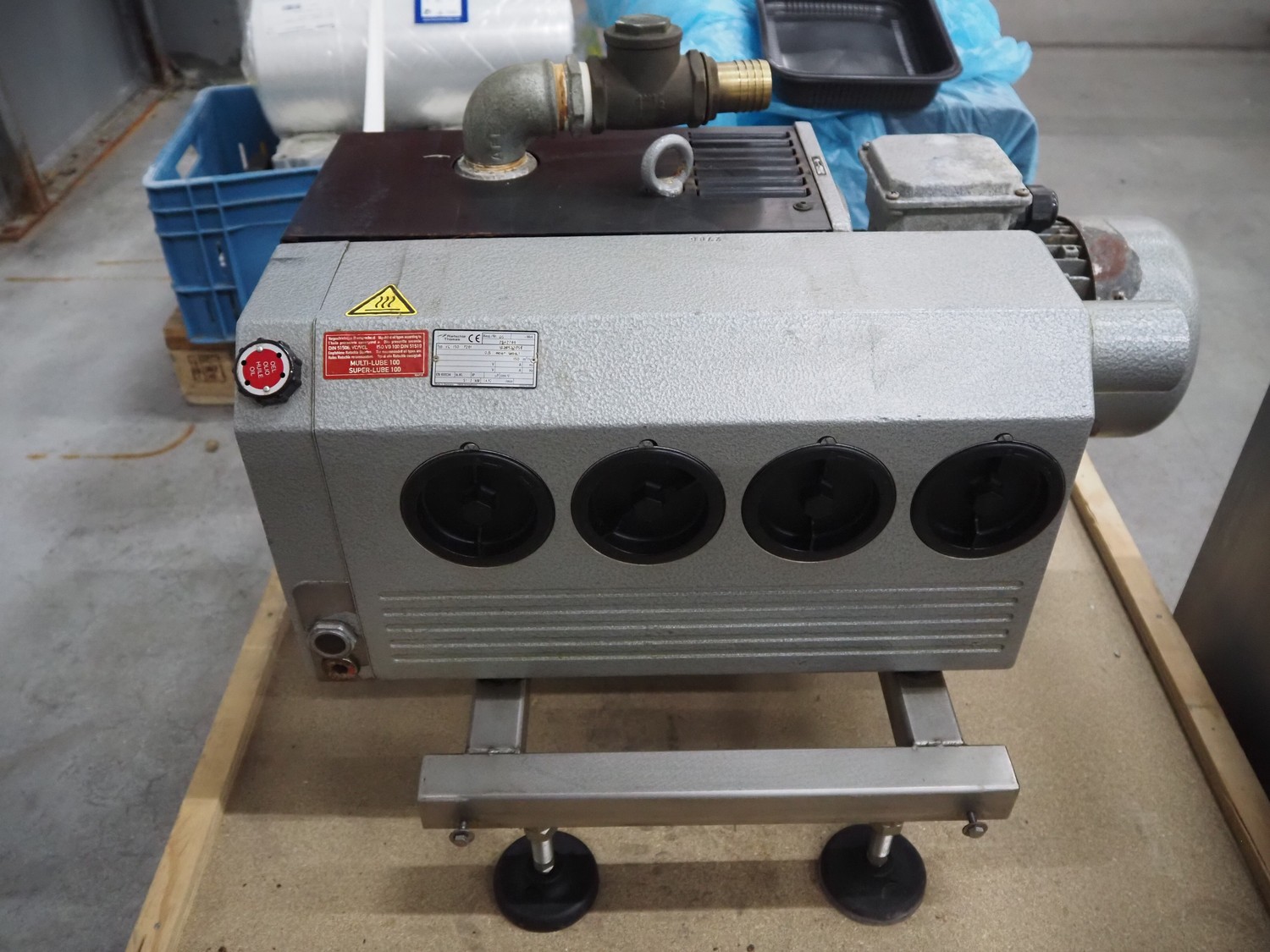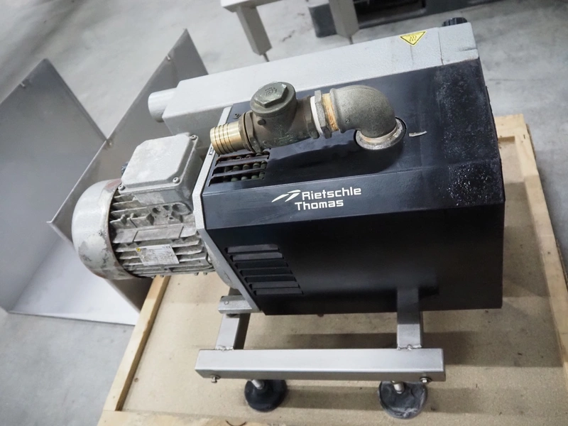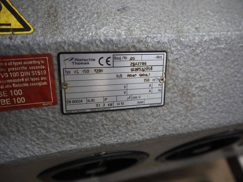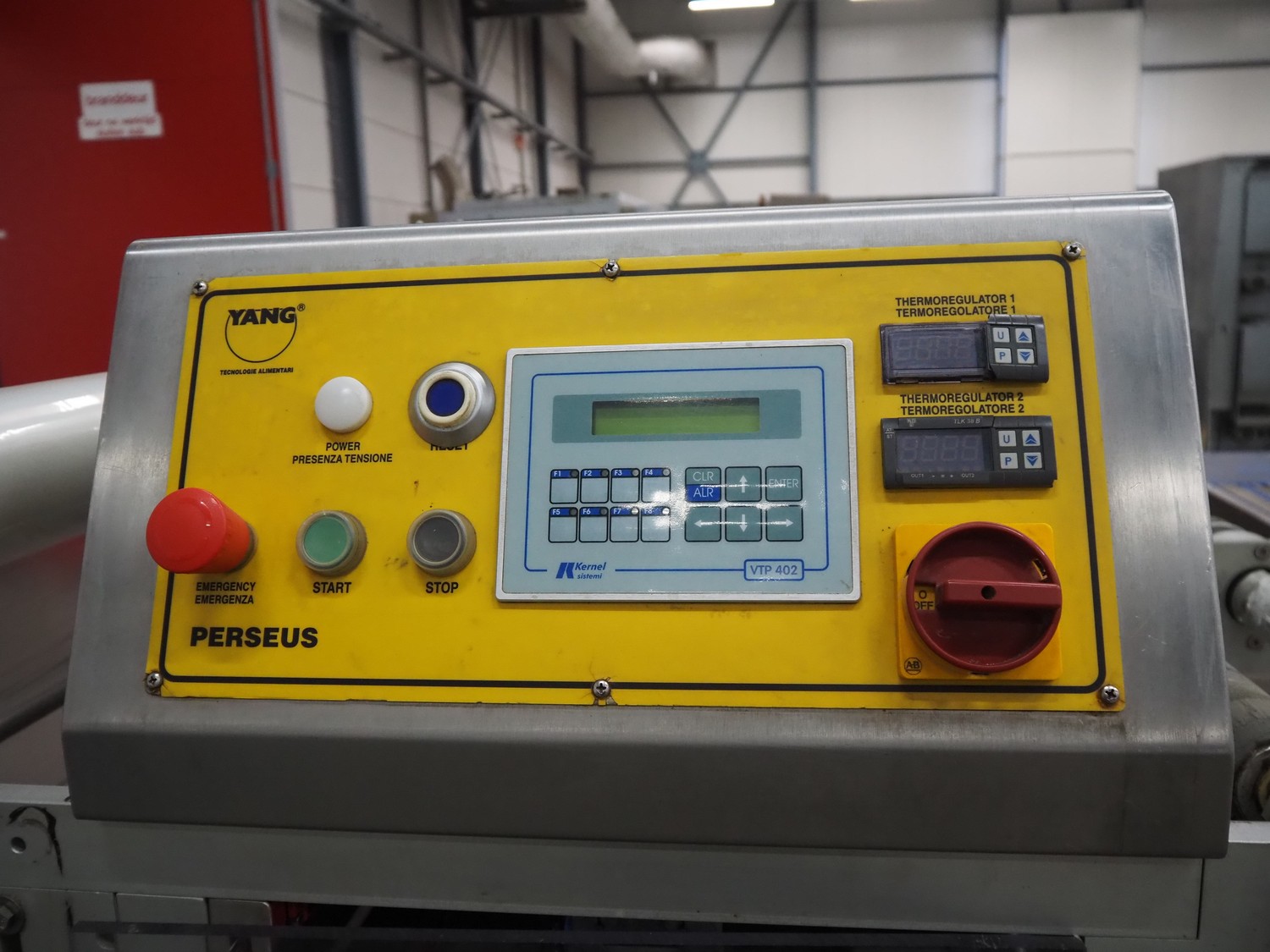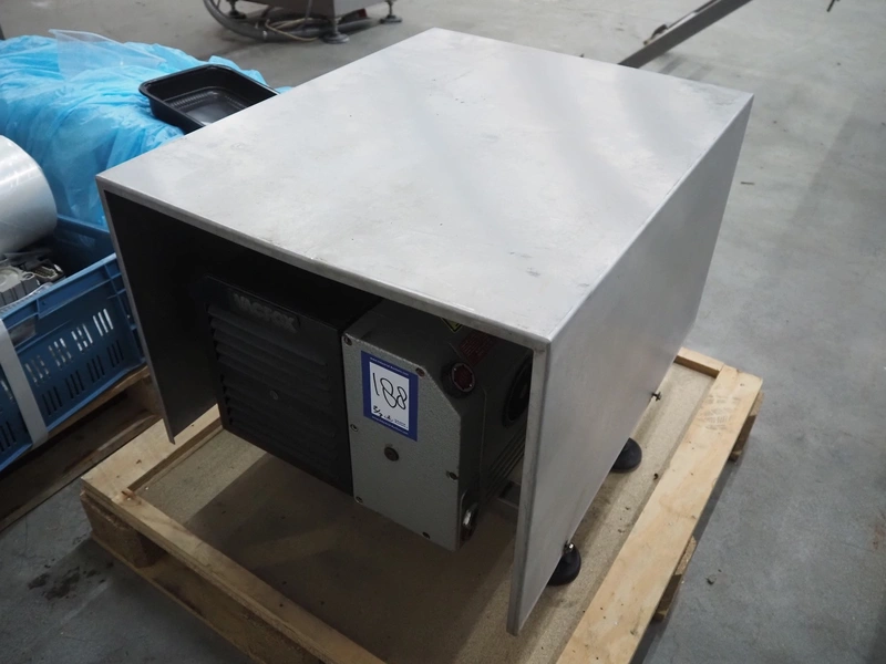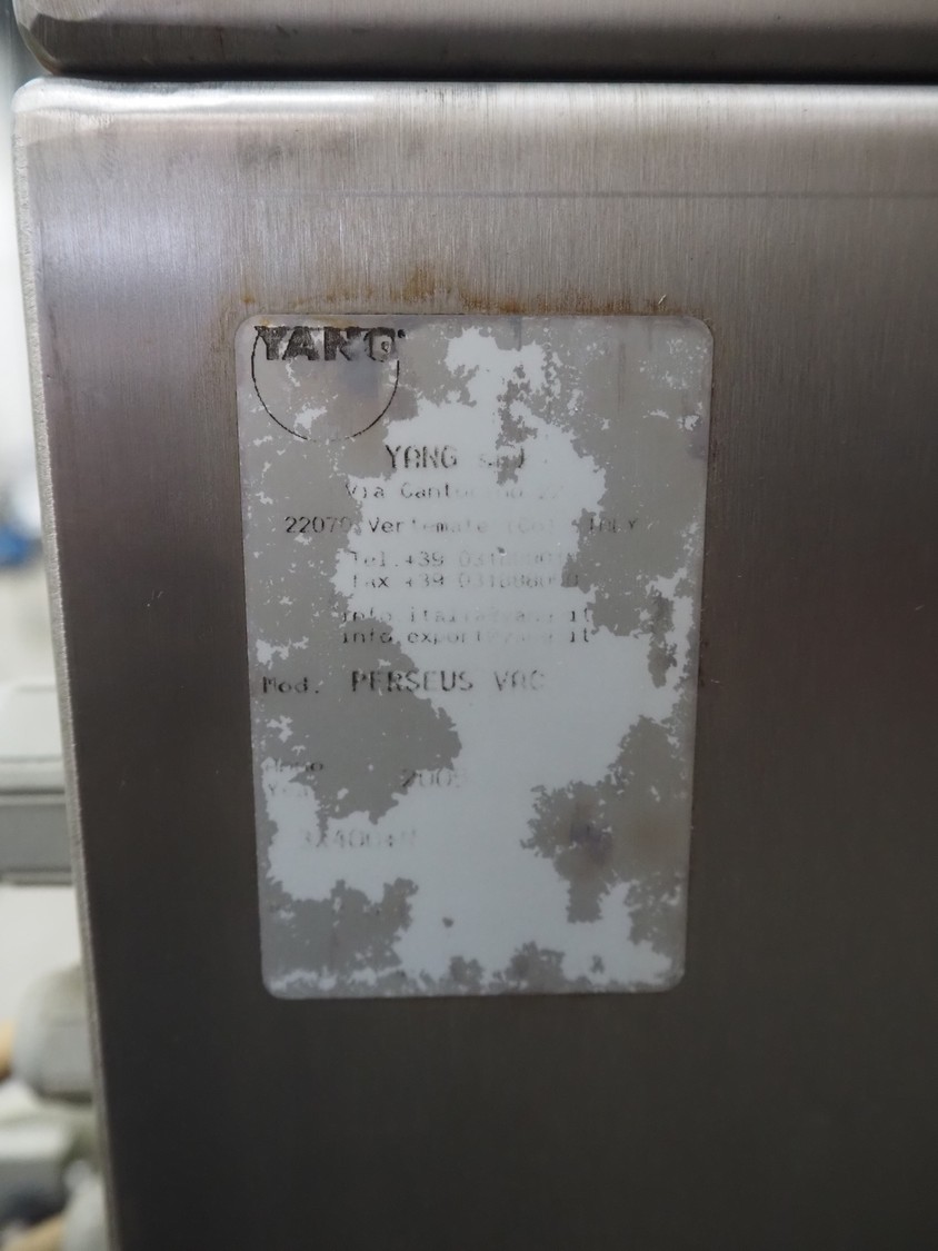 Yang traysealer, model: PERSEUS VAC, year of construction: 2005, 400 V, 3 Ph, dye: 290 mm x 225 mm, film width: 430 mm, total dimensions: 2850 mm x 900 mm x 1550 mm. Including Rietschle vacuum pump, type: VC 150 (20), year of construction: 2005, capacity: 150 m³ per hour, dimensions: 850 mm x 900 mm x 600 mm and pallet with dye sets and film roll.