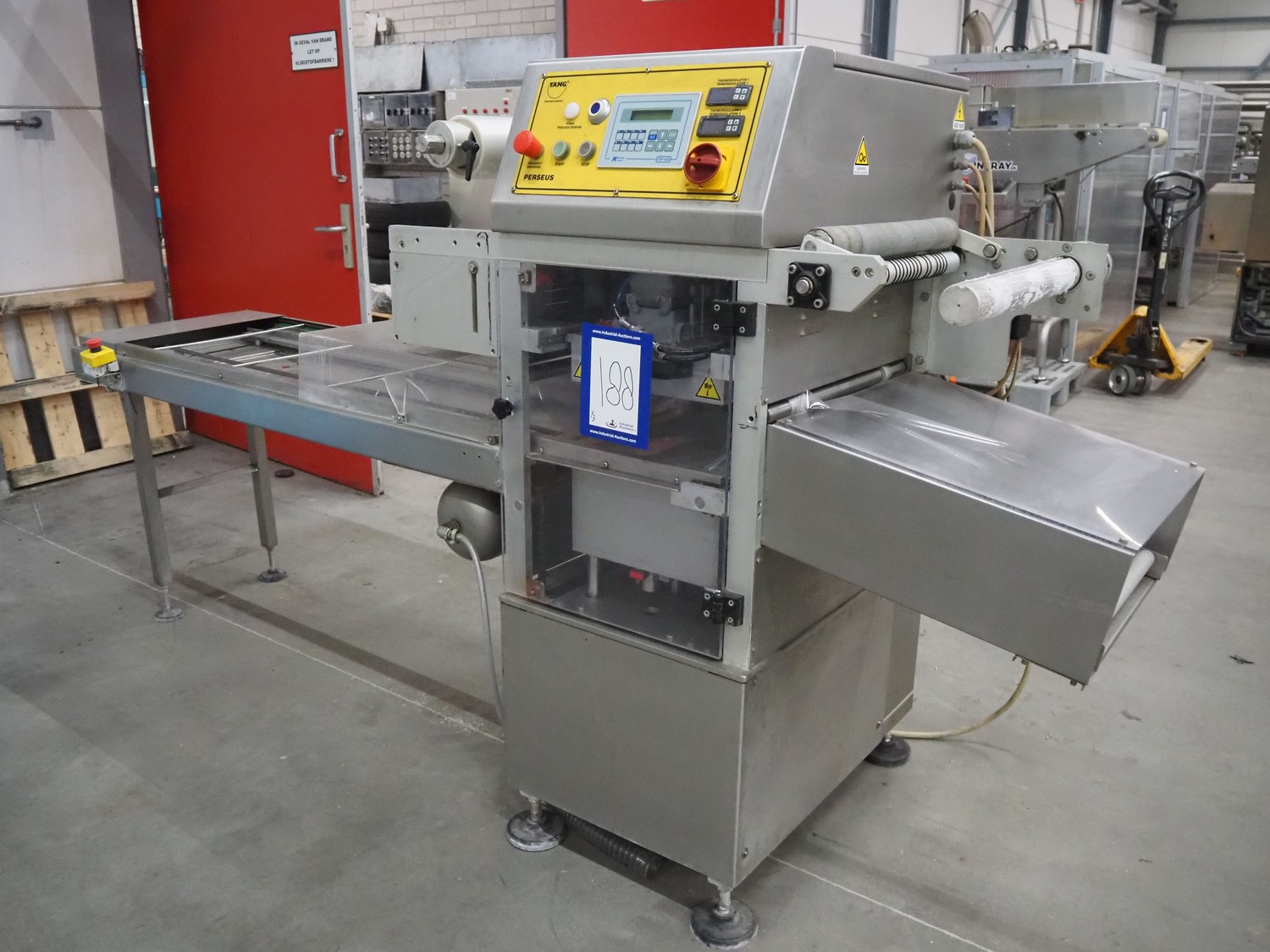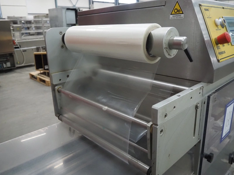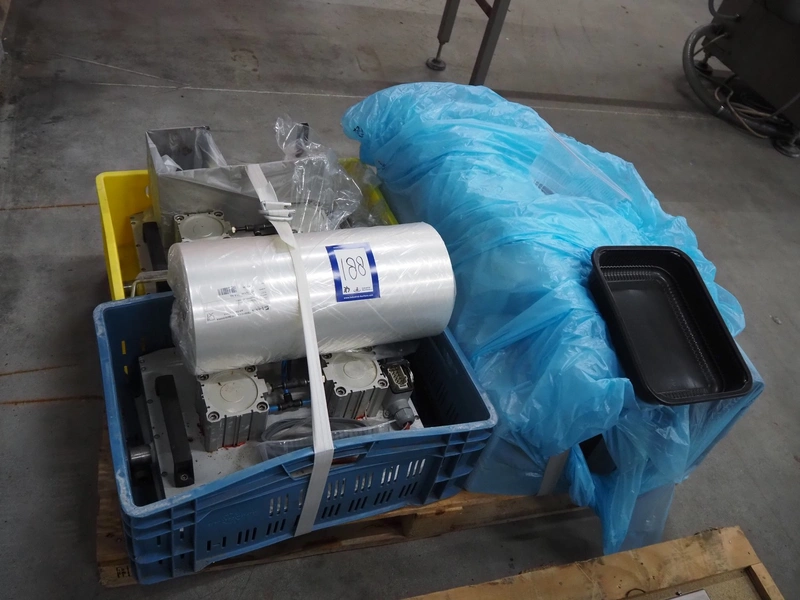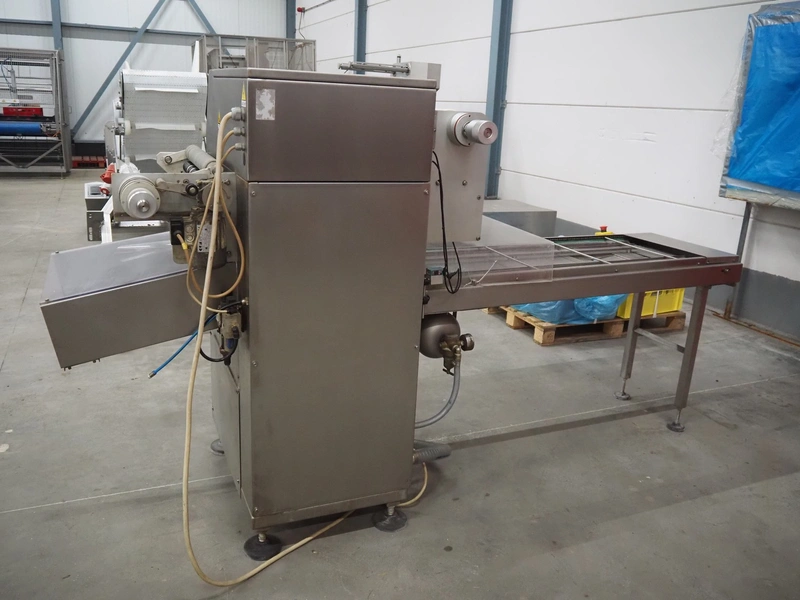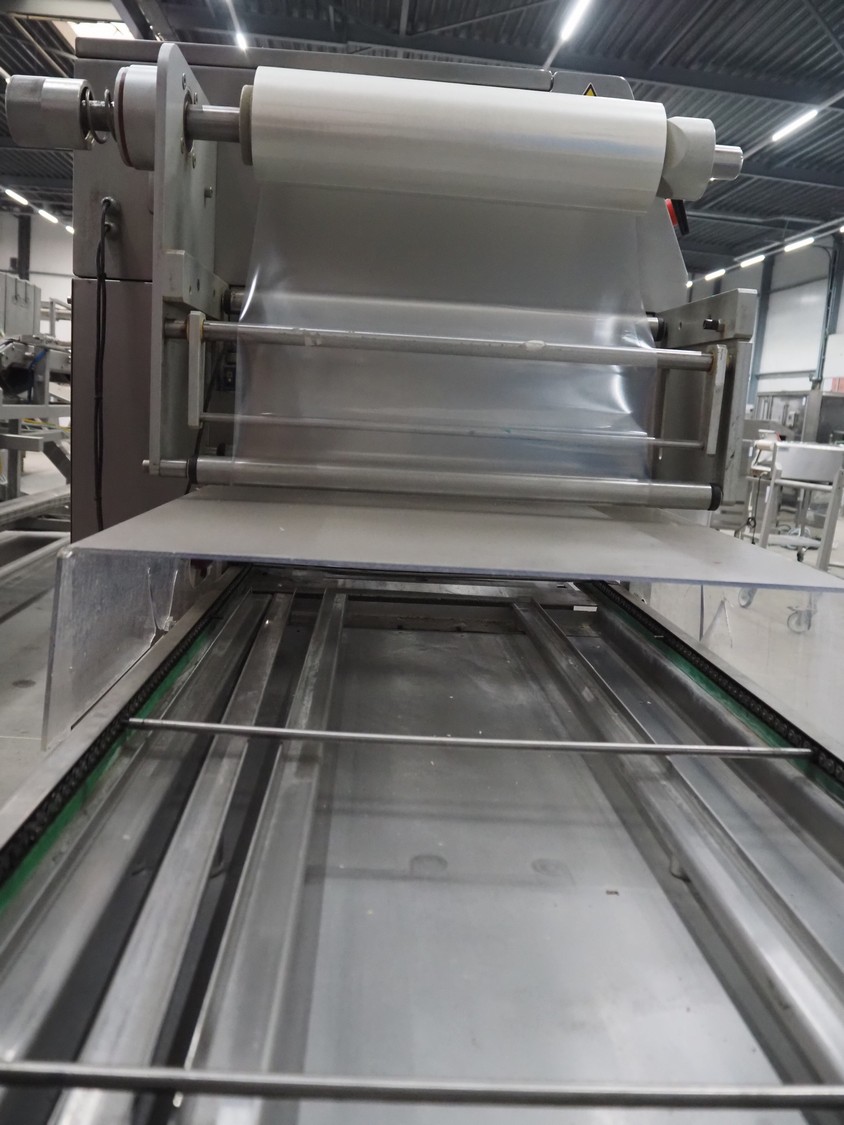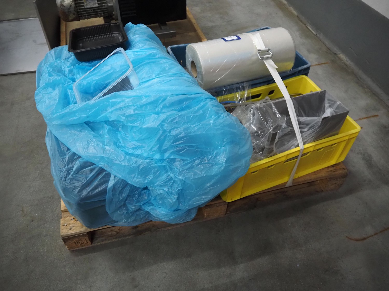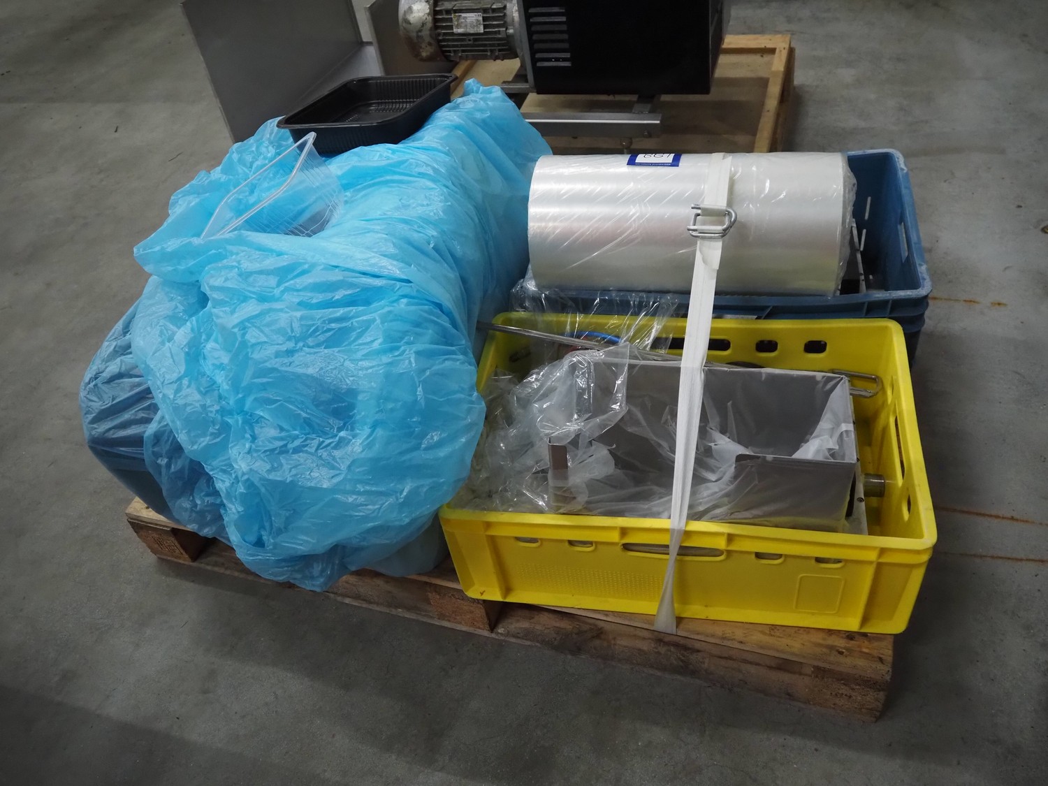 Yang traysealer, model: PERSEUS VAC, year of construction: 2005, 400 V, 3 Ph, dye: 290 mm x 225 mm, film width: 430 mm, total dimensions: 2850 mm x 900 mm x 1550 mm. Including Rietschle vacuum pump, type: VC 150 (20), year of construction: 2005, capacity: 150 m³ per hour, dimensions: 850 mm x 900 mm x 600 mm and pallet with dye sets and film roll.