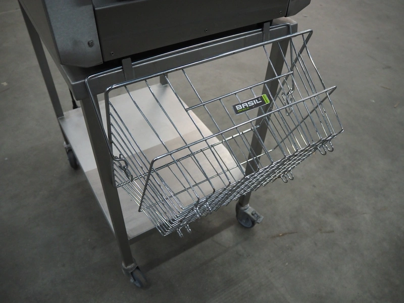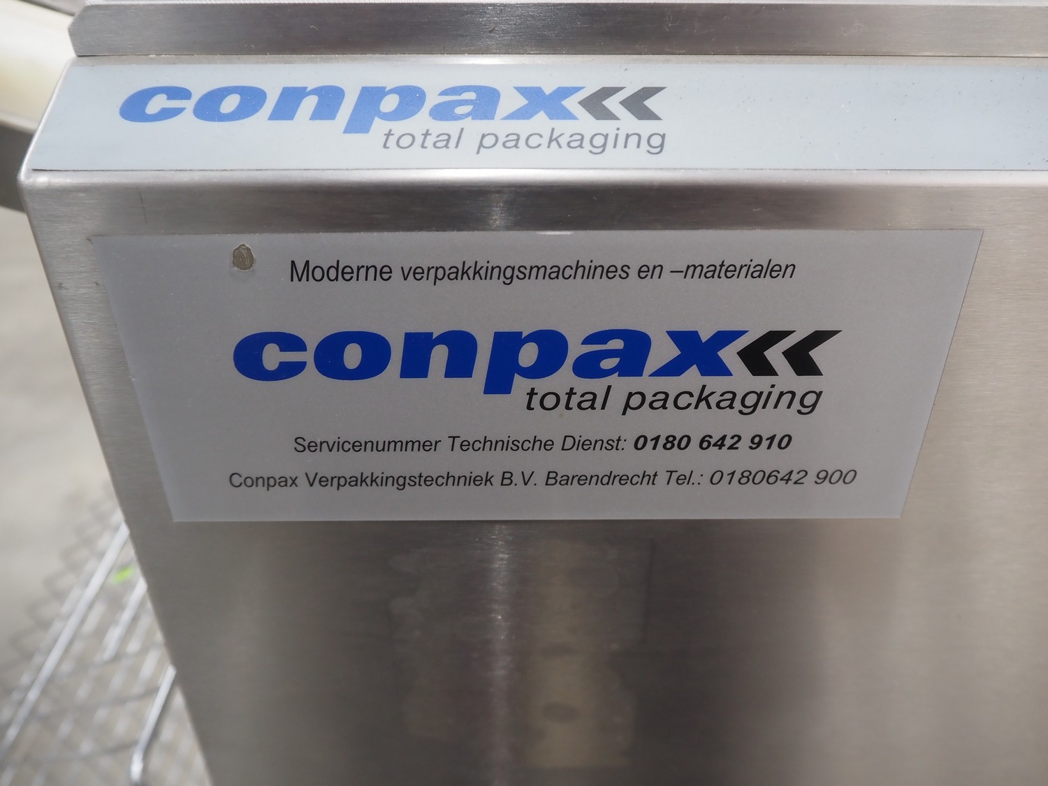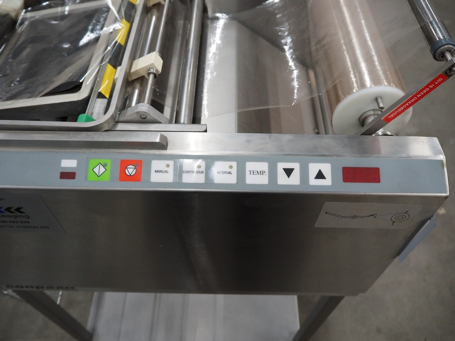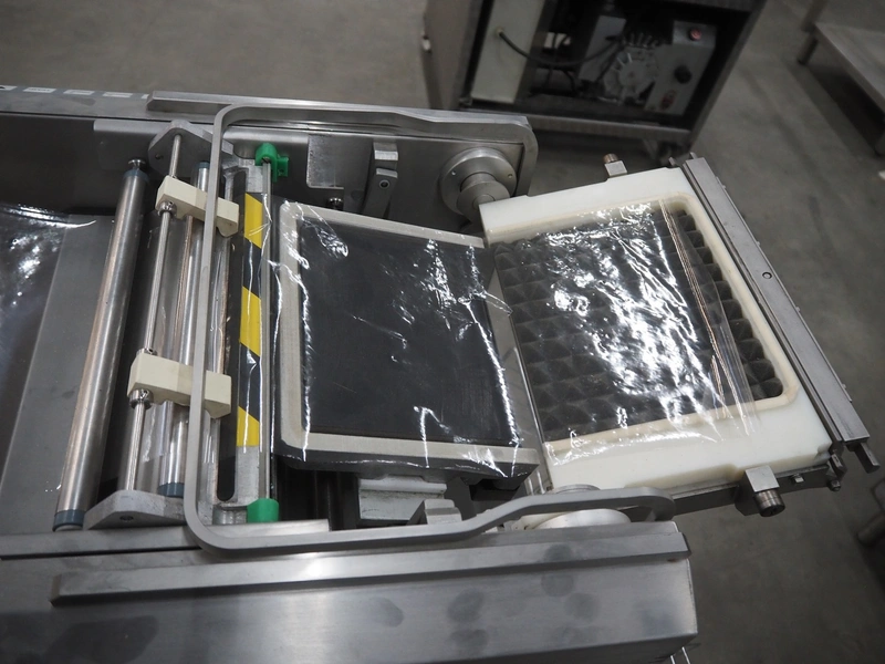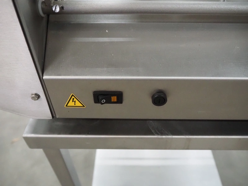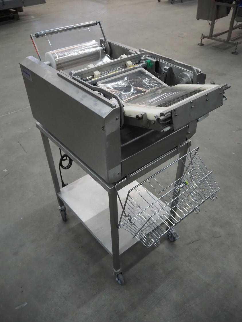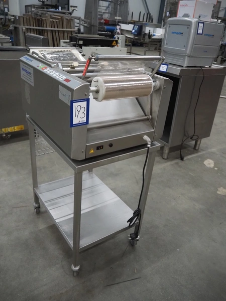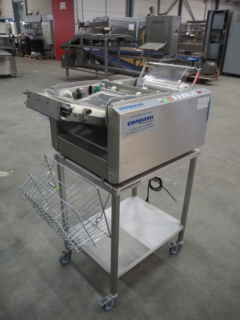 Conpax traysealer on s/s trolley, film width: 230 mm, dye: 220 mm x 170 mm, total dimensions: 780 mm x 480 mm x 1150 mm.