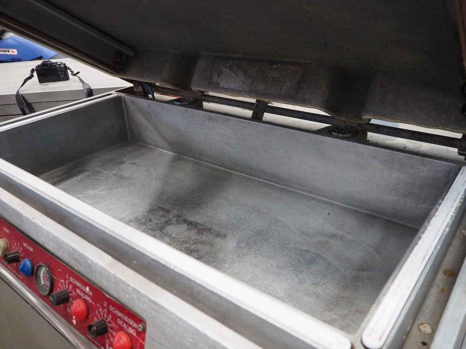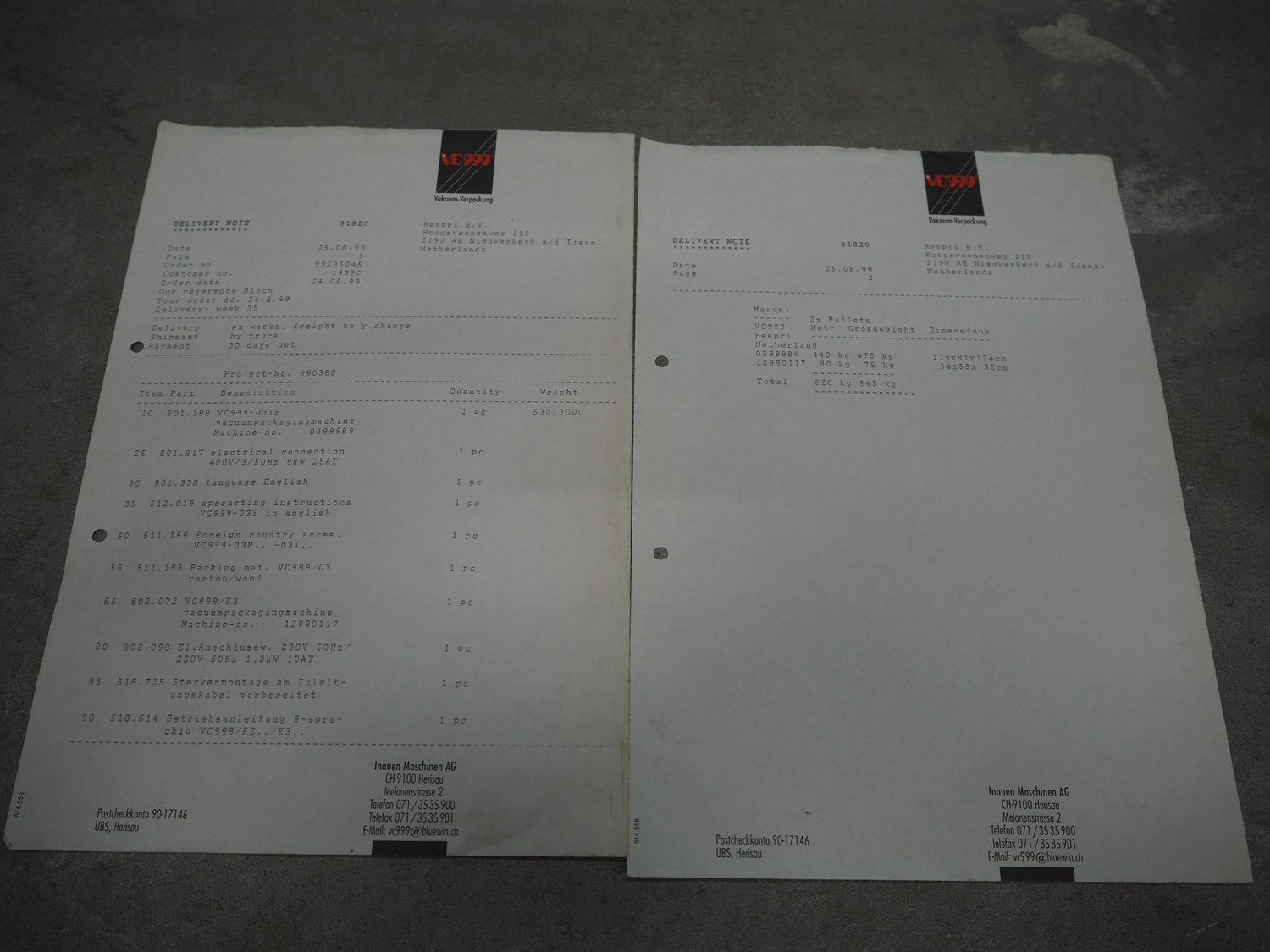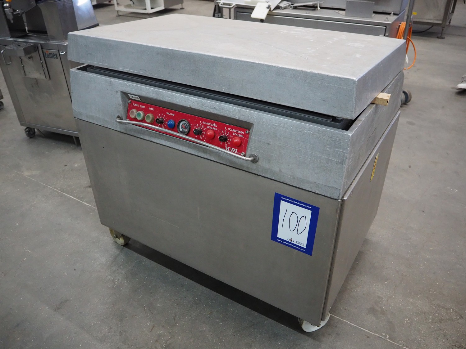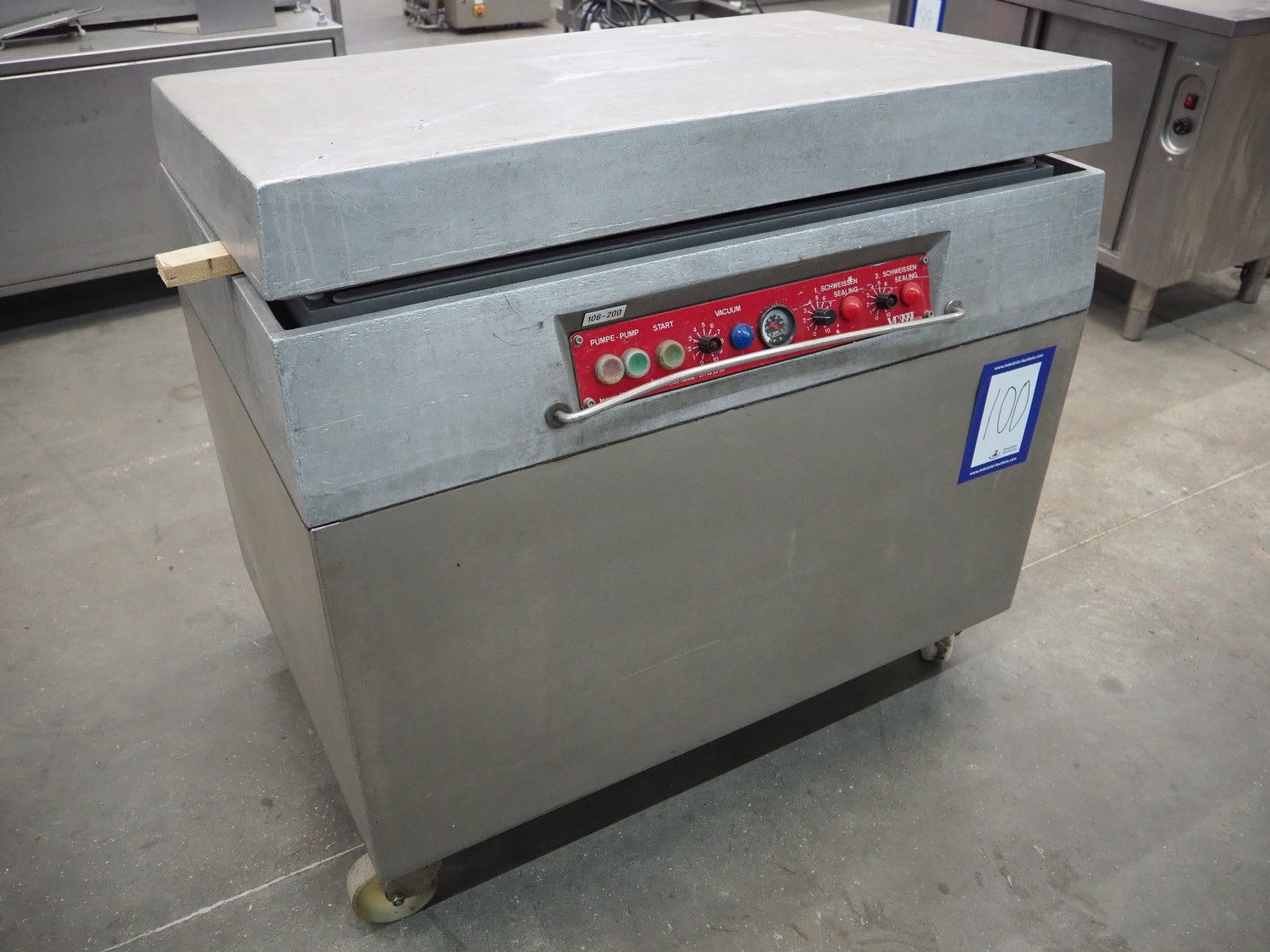 Inauen Maschinen AG mobile vacuum machine, type: VC999/03DK, machine number: 0384457, 380 V, 3 Ph, 50 Hz, 9 kW, dimensions chamber: 950 mm x 430 mm x 150 mm, seal length: 950 mm x (2x) 450 mm, Rietschle vacuum pump, type: CLFH 220 V 1011, capacity: 220 m³ per hour, total dimensions: 1150 mm x 800 mm x 1050 mm.