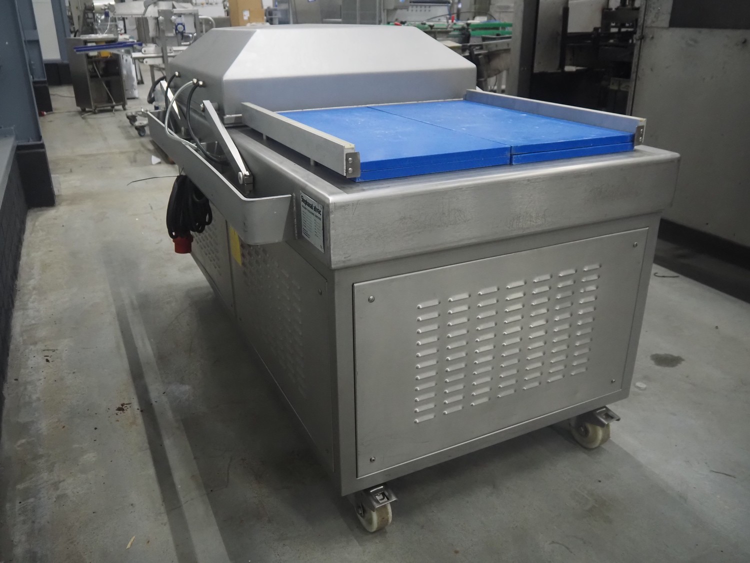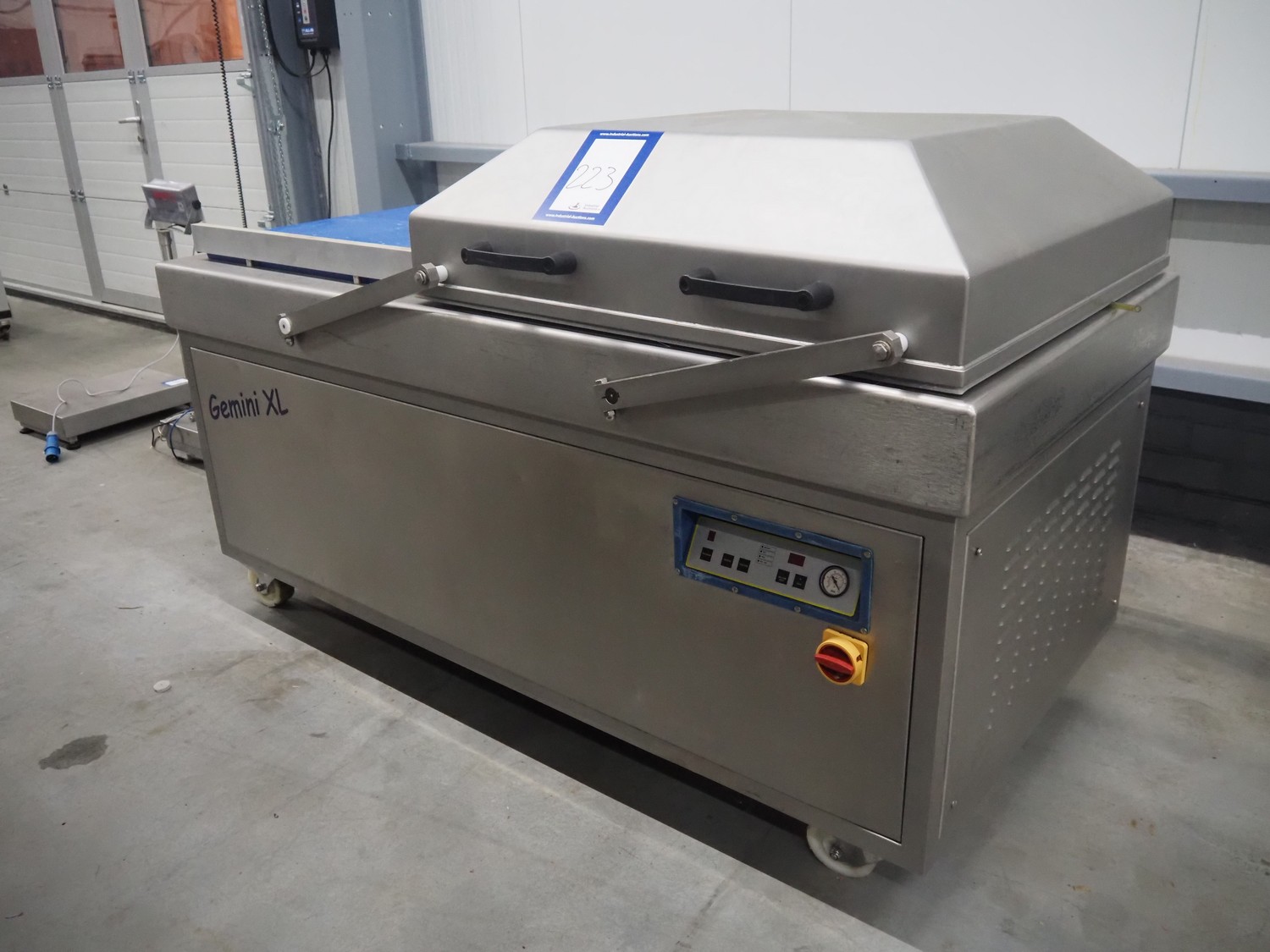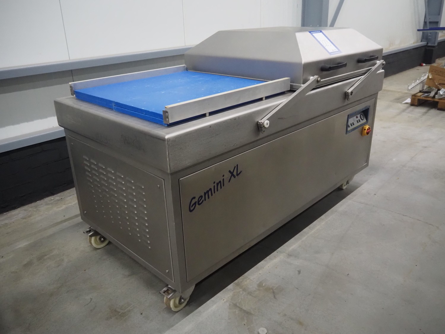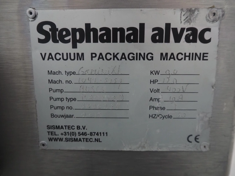 Stephanal alvac mobile double chamber vacuum machine, type: GeminiXL, machine number: 1042-5357, year of construction: 2012, 400 V, 3 Ph, 50 Hz, 19 A, 9 kW, seal length: (4x) 770 mm, chamber dimensions: (2x) 770 mm x 760 mm, Busch vacuum pump, type: RA 0302 D 5Z3 DIXX, capacity: 300 m³ per hour, total dimensions: 1910 mm x 1160 mm x 1200 mm.