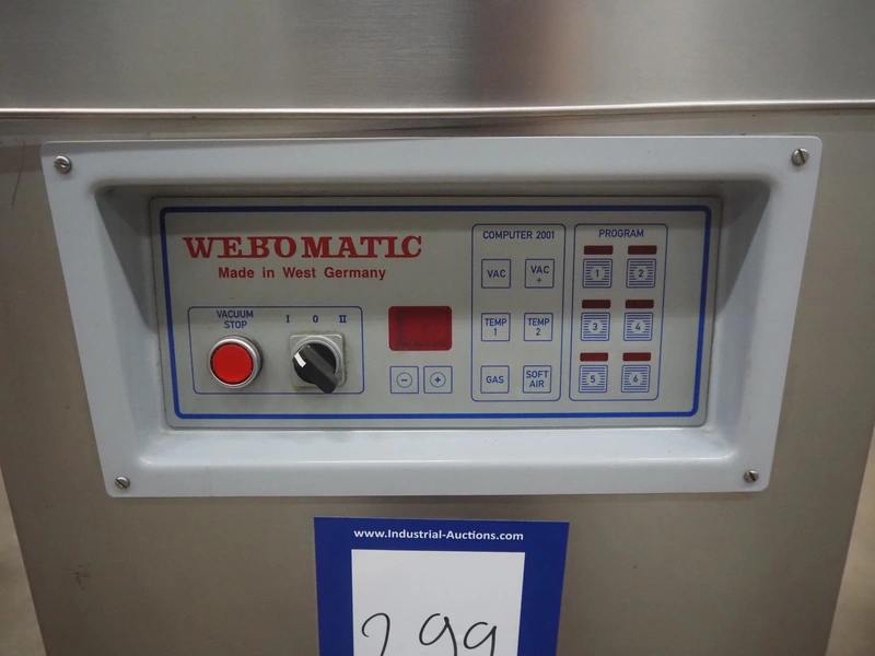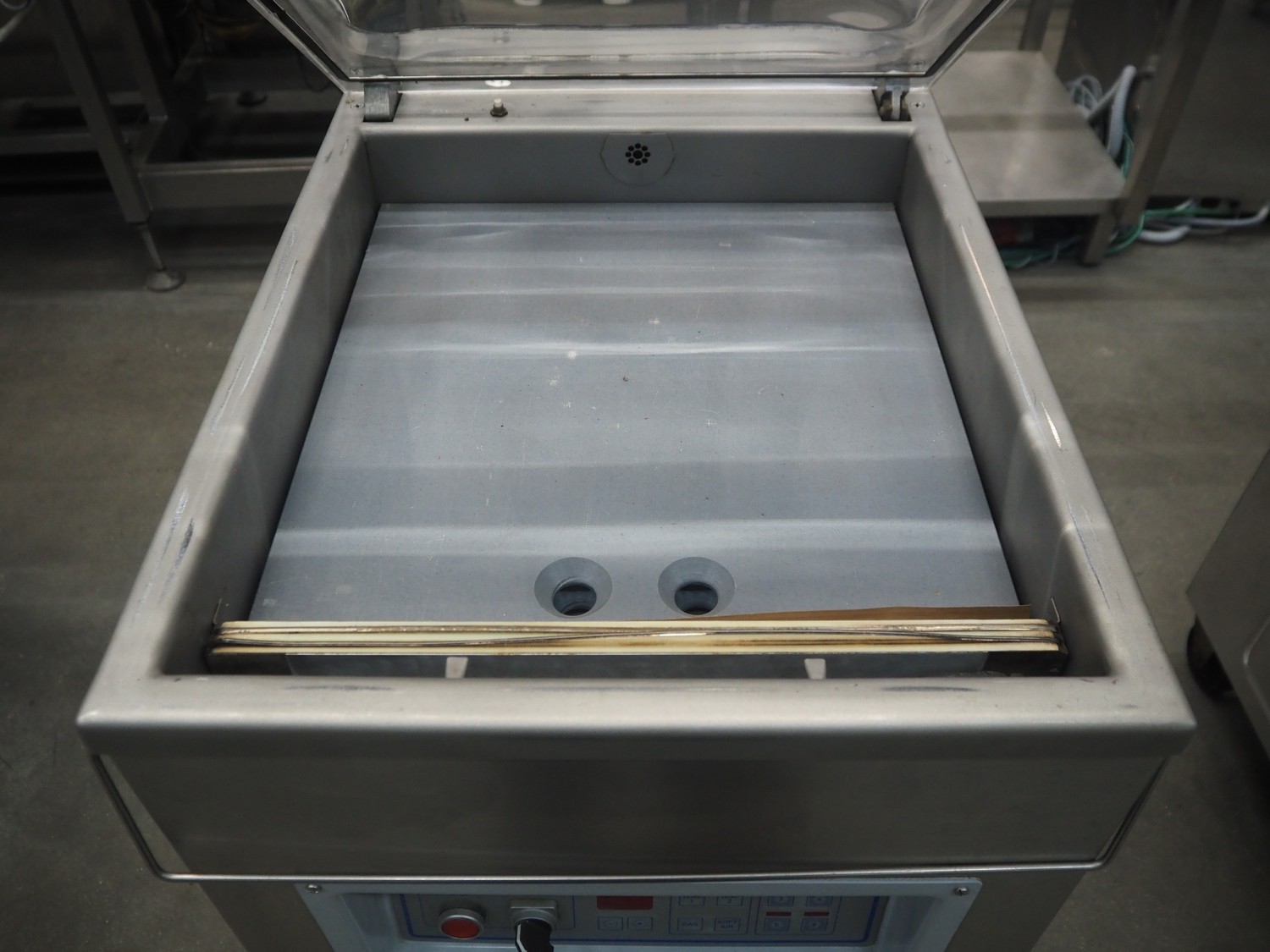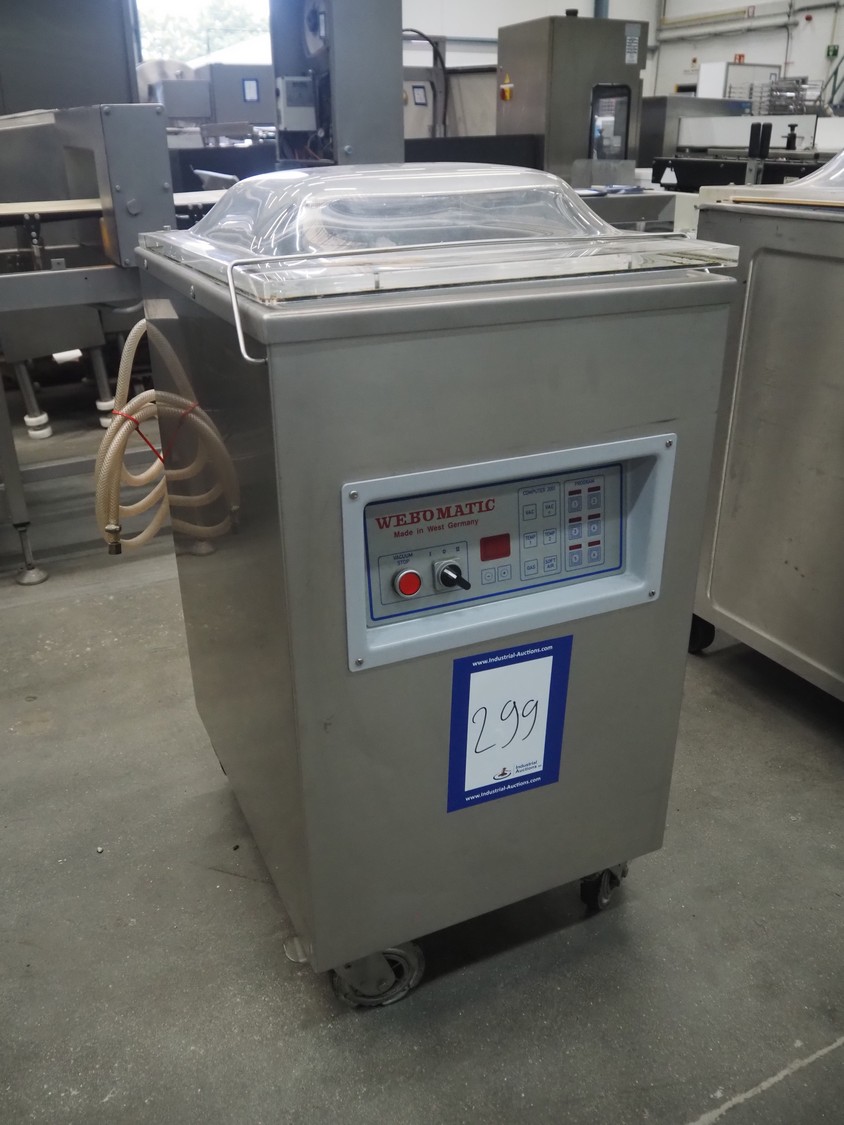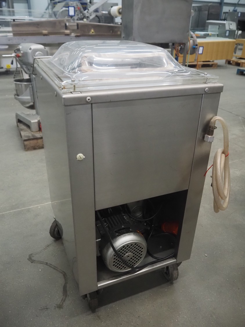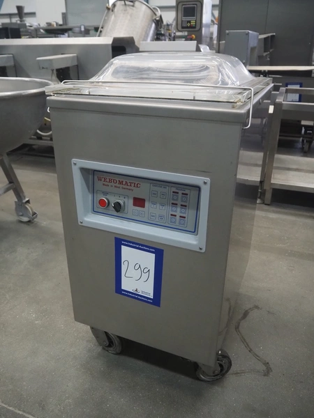 Webomatic mobile vacuum machine, seal length: 420 mm, chamber dimensions: 420 mm x 450 mm, total dimensions: 500 mm x 620 mm x 950 mm. Seal damaged.