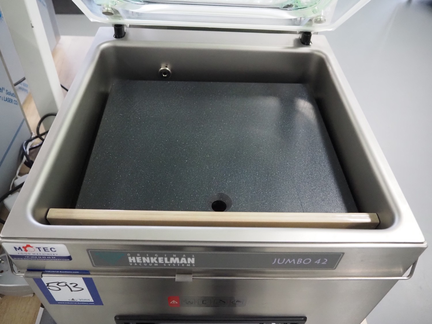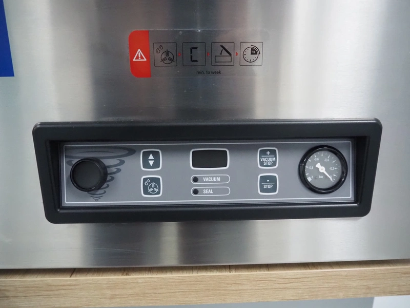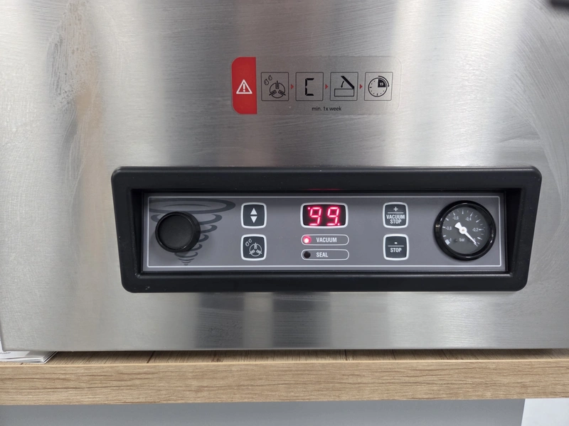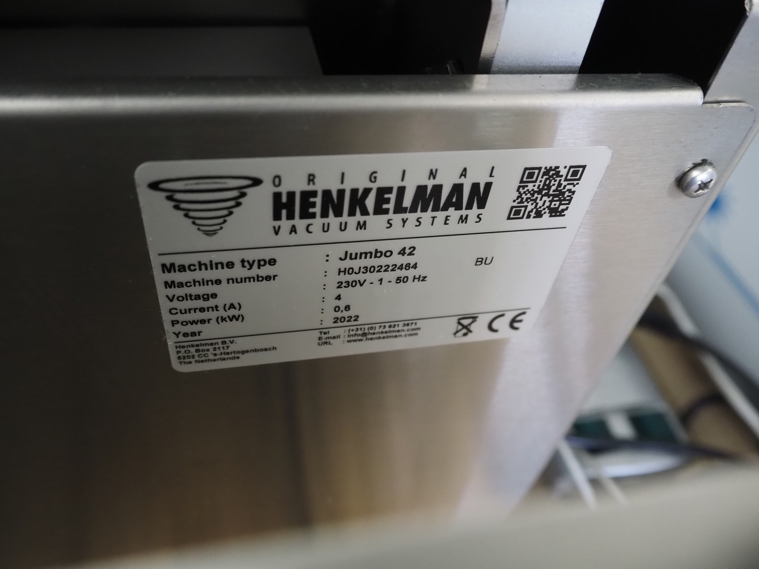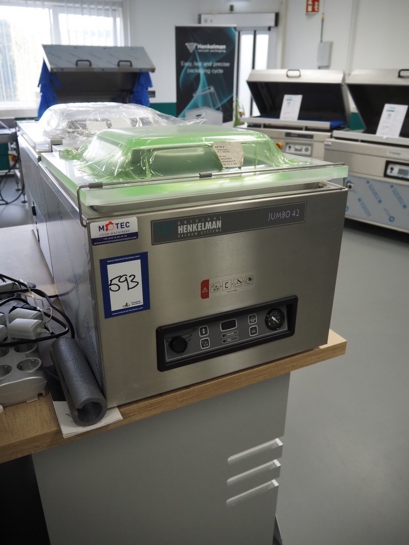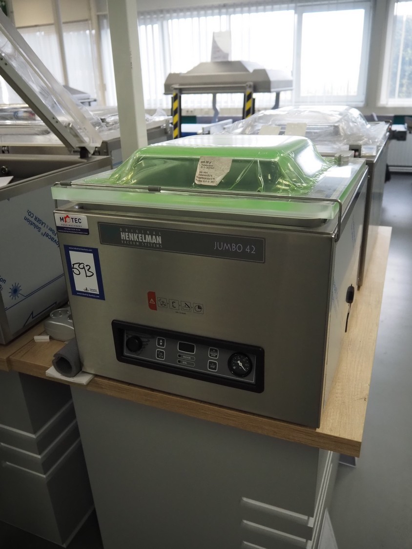 Henkelman vacuum machine, type: Jumbo 42, machine number: H0J30222464, year of construction: 2022, 230 V, 1 Ph, 50 Hz, 4 A, 0.6 kW, seal length: 430 mm, chamber dimensions: 430 mm x 370 mm, total dimensions: 520 mm x 500 mm x 450 mm. Never used.