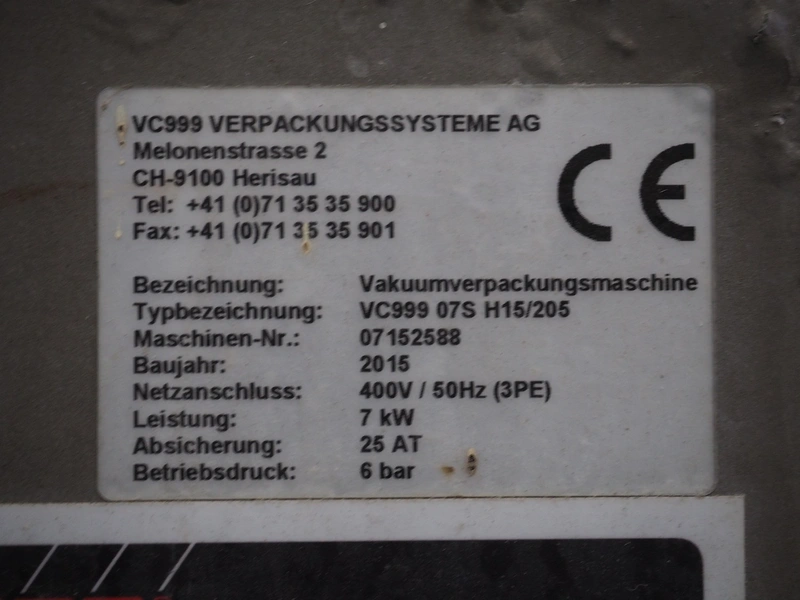 VC999 Verpackungssysteme AG vacuum machine, type: VC999 07S H15/205, machine number: 07152588, year of construction: 2015, 400 V, 3 Ph, 50 Hz, 7 kW, seal length: (2x) 450 mm and (1x) 1000 mm, dimensions chamber: 1050 mm x 530 mm, total dimensions: 1350 mm x 850 mm x 1100 mm.