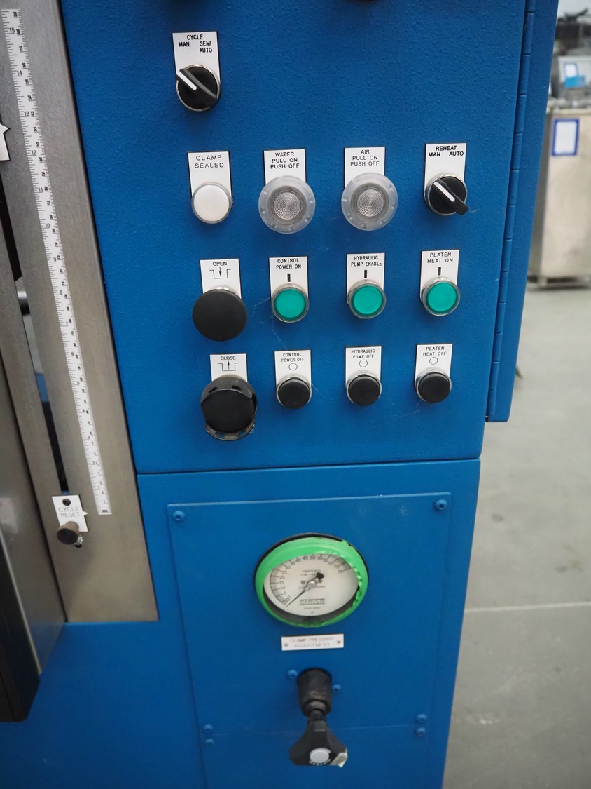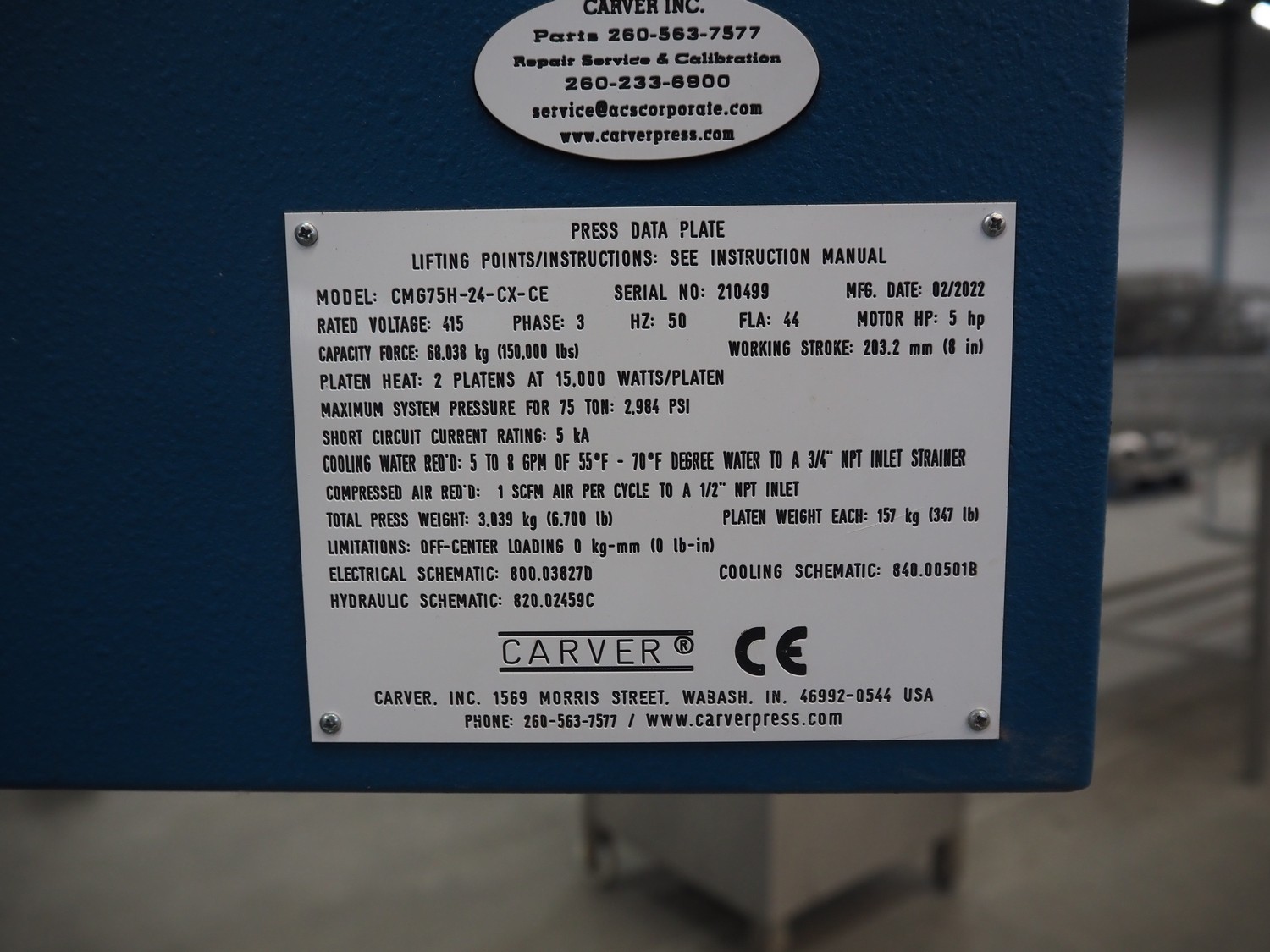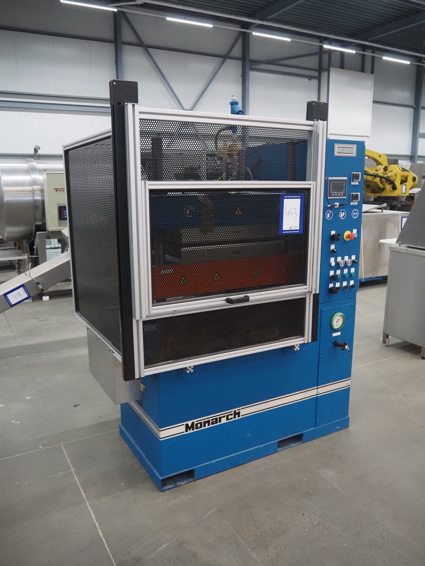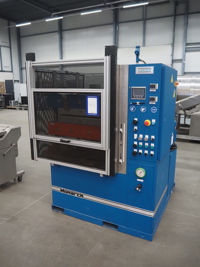 Carver compression molding press, model: CMG75H-24-CX-CE, serial number: 210499, year of construction: 02-2022, 415 V, 3 Ph, 50 Hz, 15000 Watt per plate, weight: 3036 kg, dimensions: 1550 mm x 1550 mm x 2000 mm.
