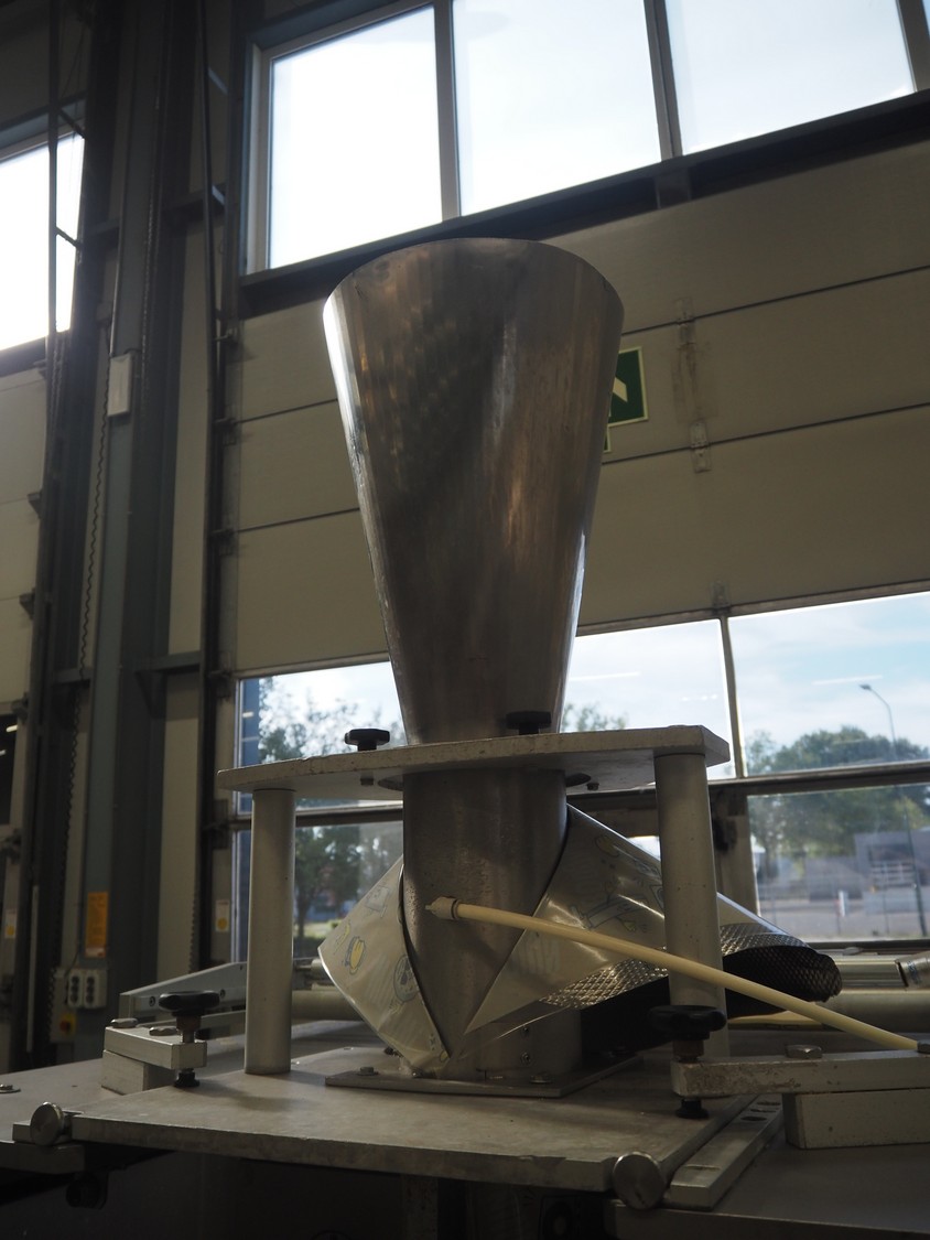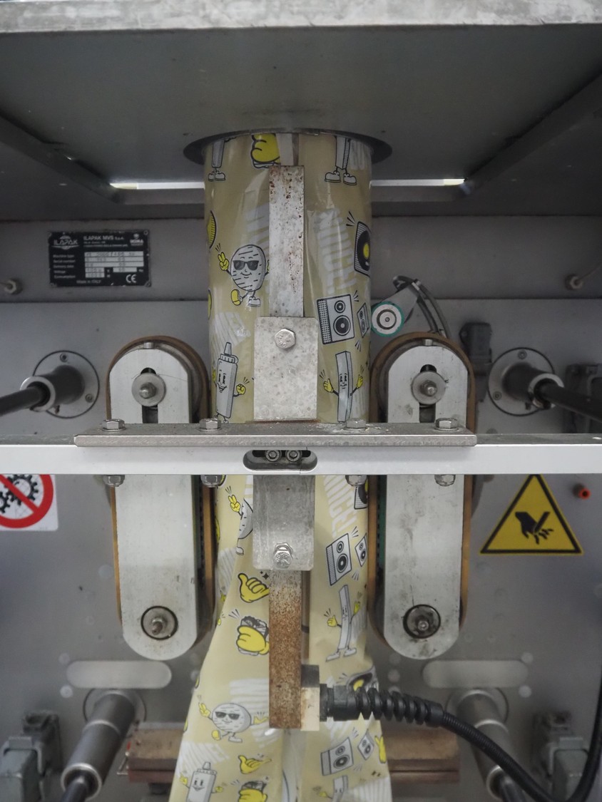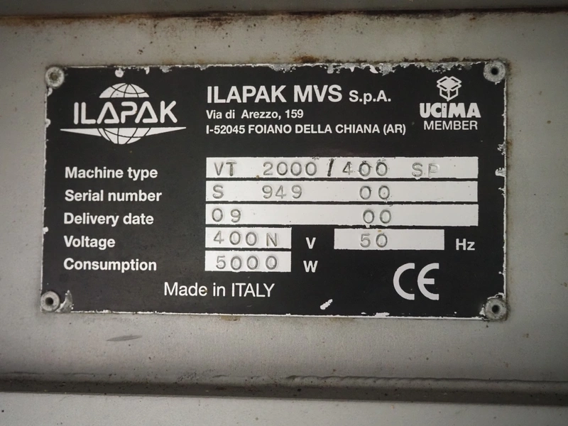 Ilapak MVS S.p.A. vertical bag form-, fill-, and seal machine, type: VT 2000/400 SP, serial number: S 949 00, year of construction: 09-00, 400 V, 50 Hz, 5000 W, diameter pipe: 300 mm, film width: 500 mm, seal width: 400 mm, film width: 400 mm, total dimensions: 2000 mm x 1700 mm x 2300 mm. Including extra filling pipe, diameter pipe: 220 mm.