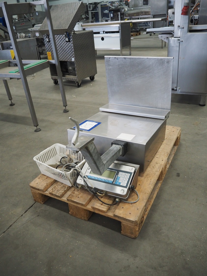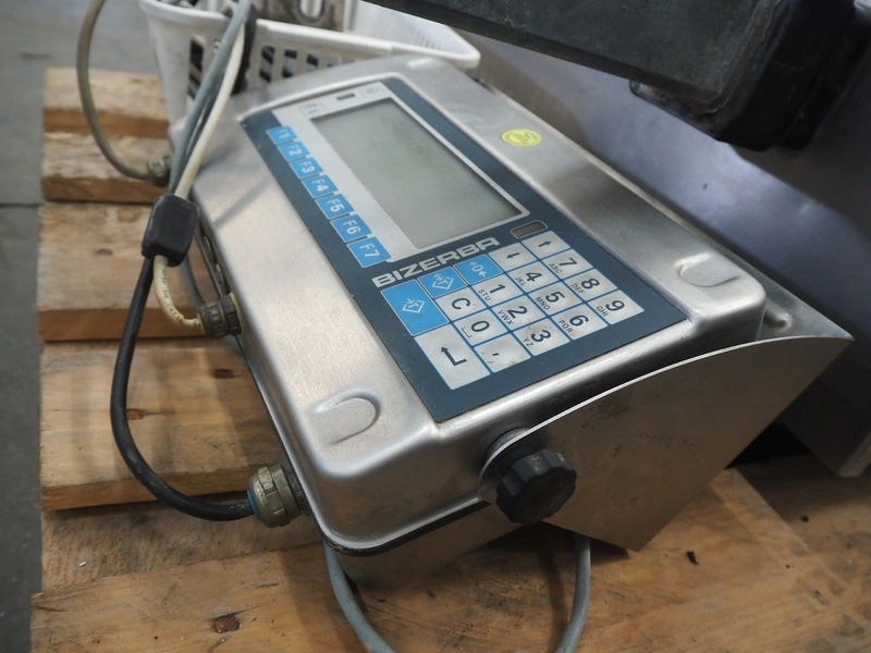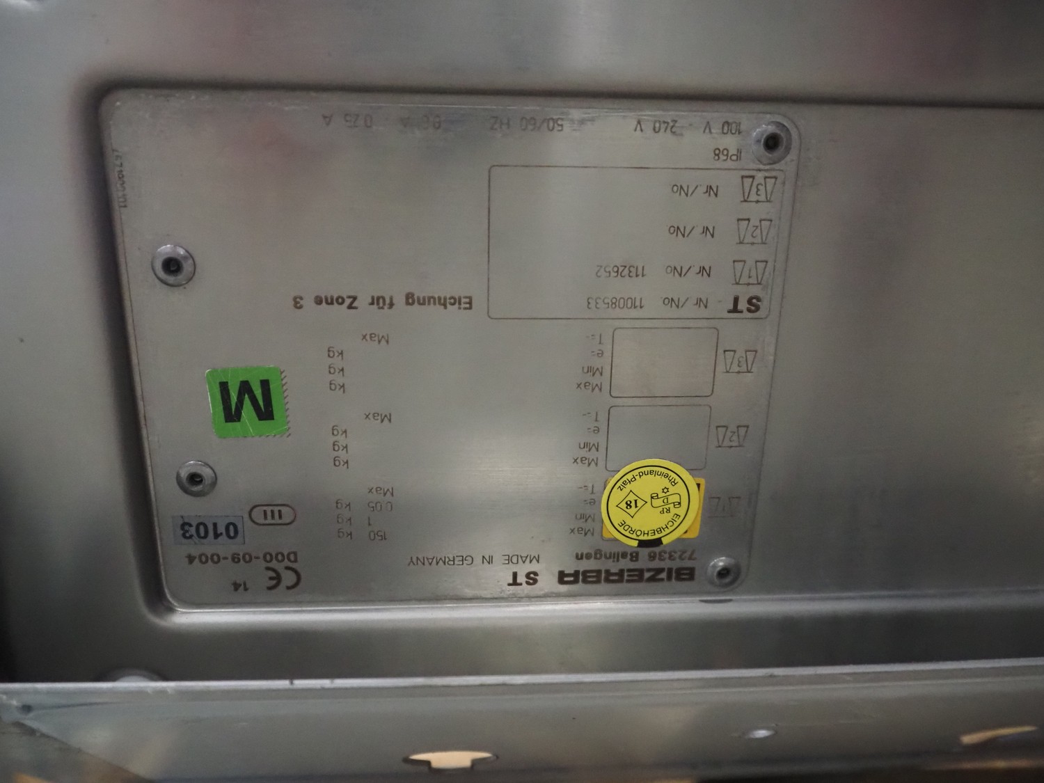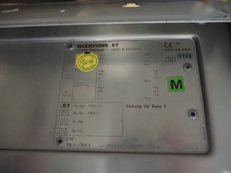 Bizerba hook weighing scale, type: ST, number: 11008533, 240 V, 50/60 Hz, 0.25 A, maximum weight: 150 kg, minimum weight: 1 kg, e= 0.05 kg, dimensions: 600 mm x 700 mm x 1300 mm.