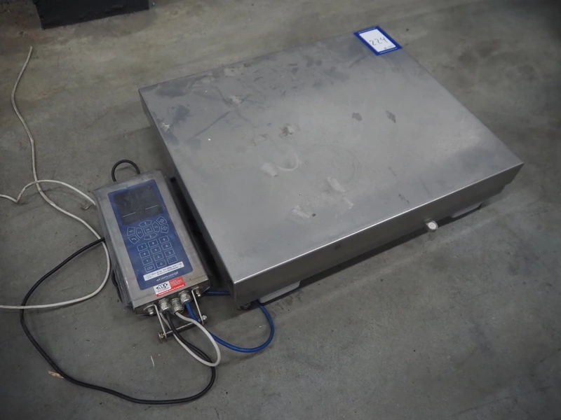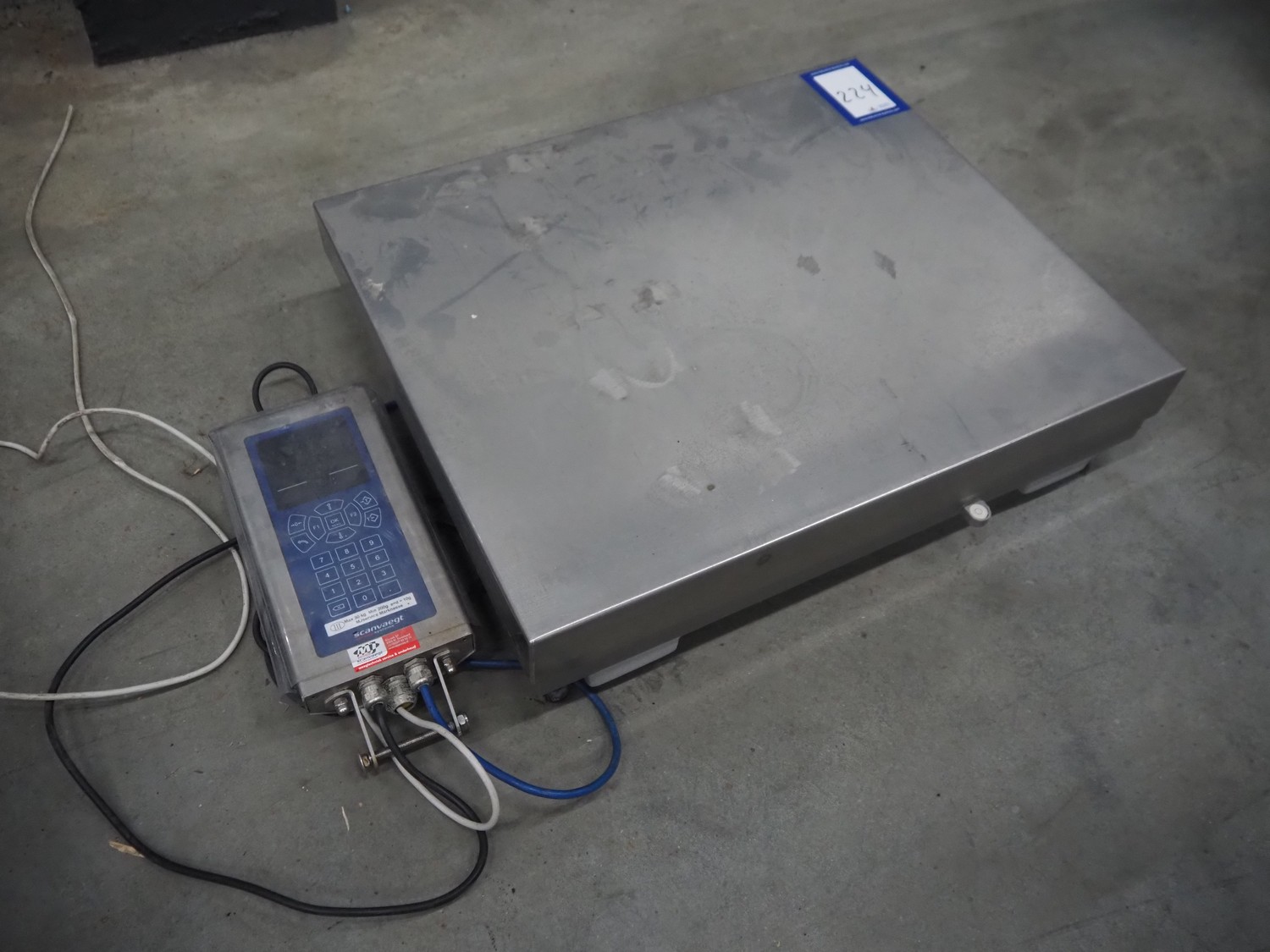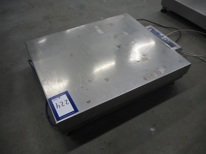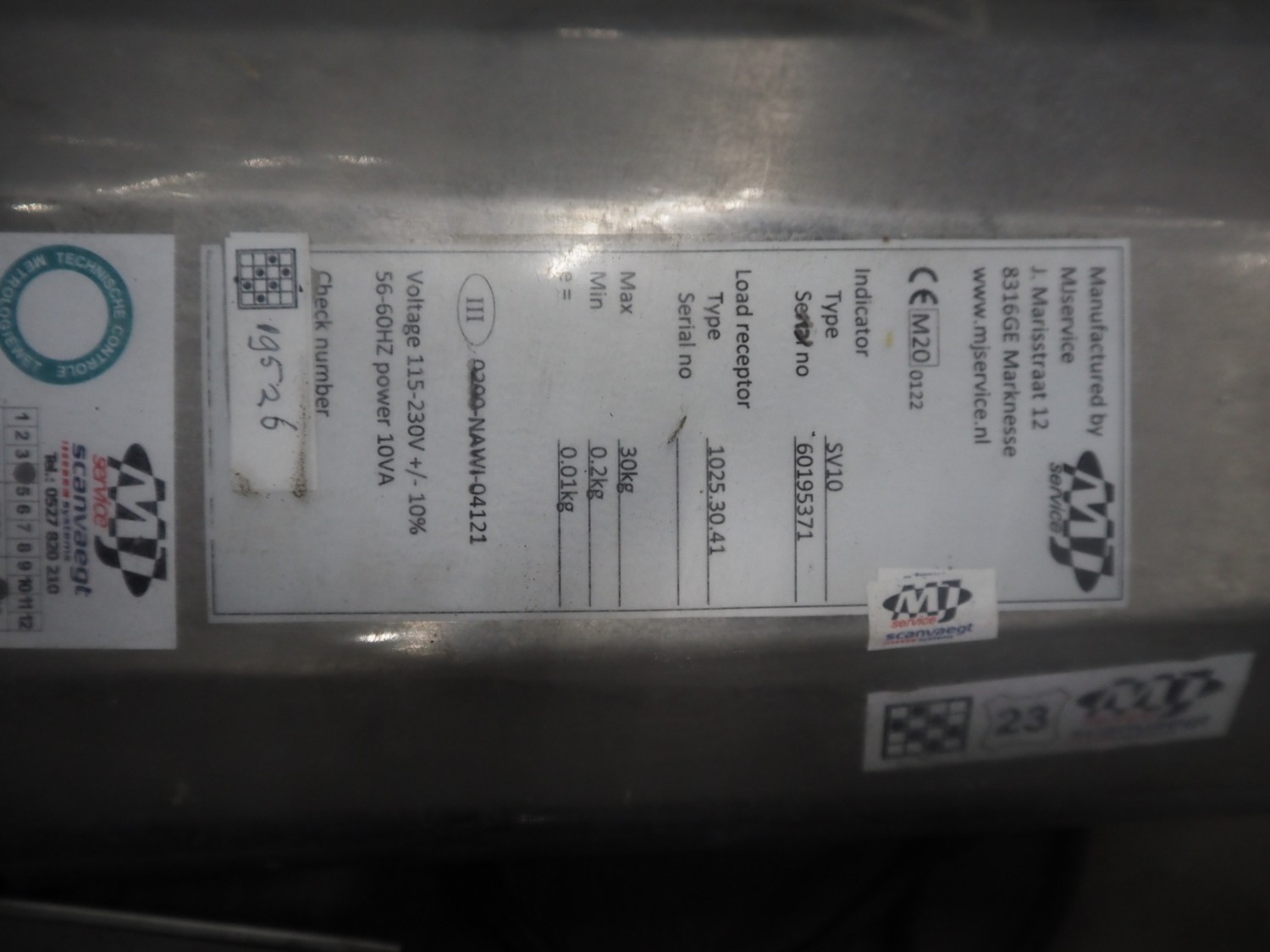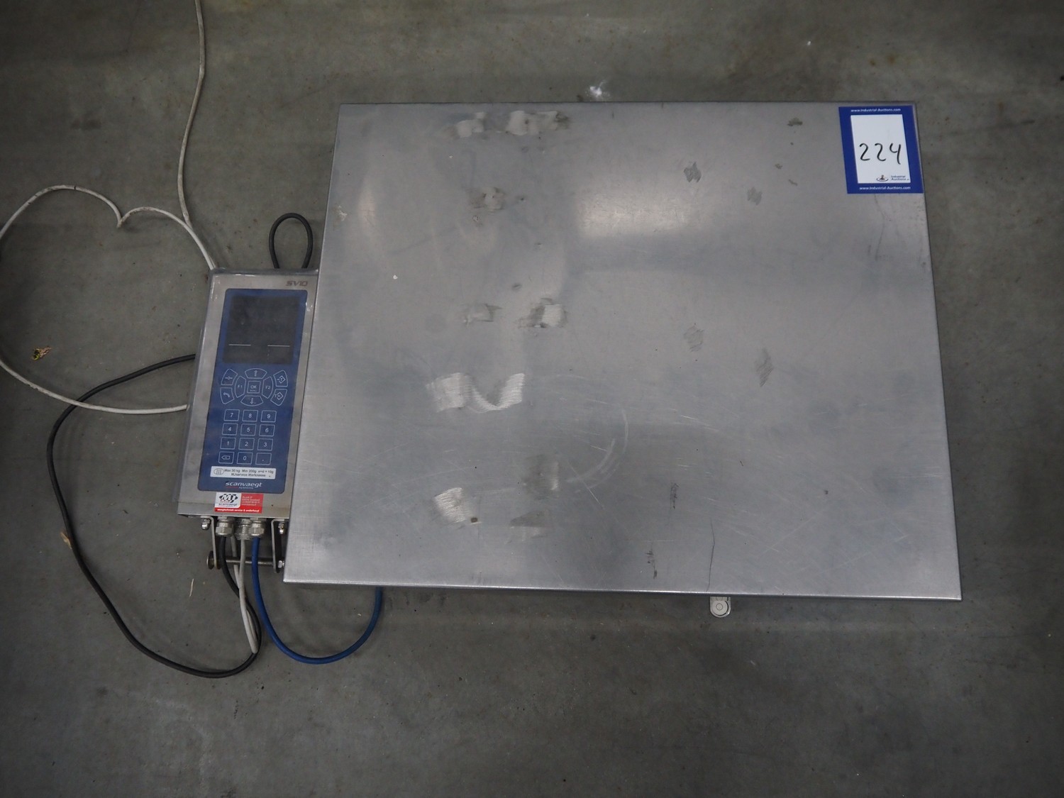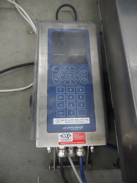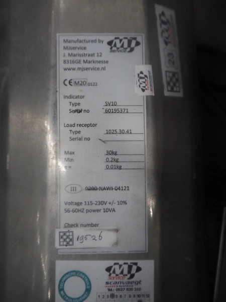 Scanveagt weighing scale with indicator, type: SV10, serial number: 60195371, 230 V, 50/60 Hz, maximum weight: 30 kg, minimum weight: 0.2kg, e= 0.01 kg, dimensions: 600 mm x 500 mm x 150 mm.