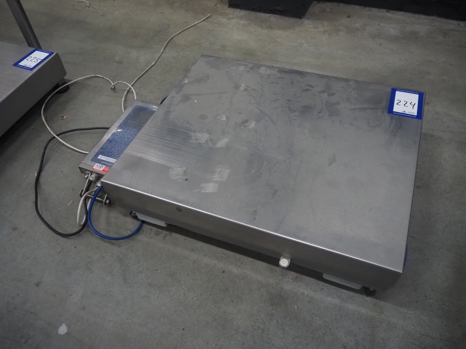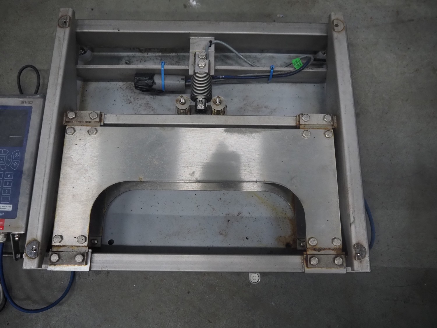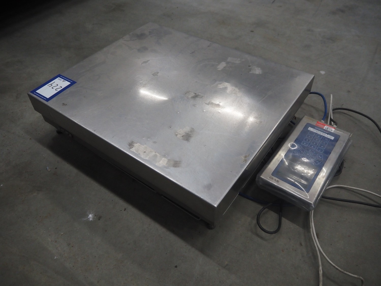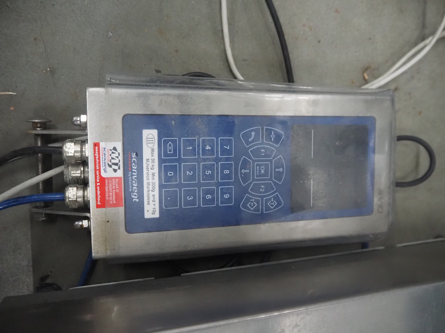 Scanveagt weighing scale with indicator, type: SV10, serial number: 60195371, 230 V, 50/60 Hz, maximum weight: 30 kg, minimum weight: 0.2kg, e= 0.01 kg, dimensions: 600 mm x 500 mm x 150 mm.