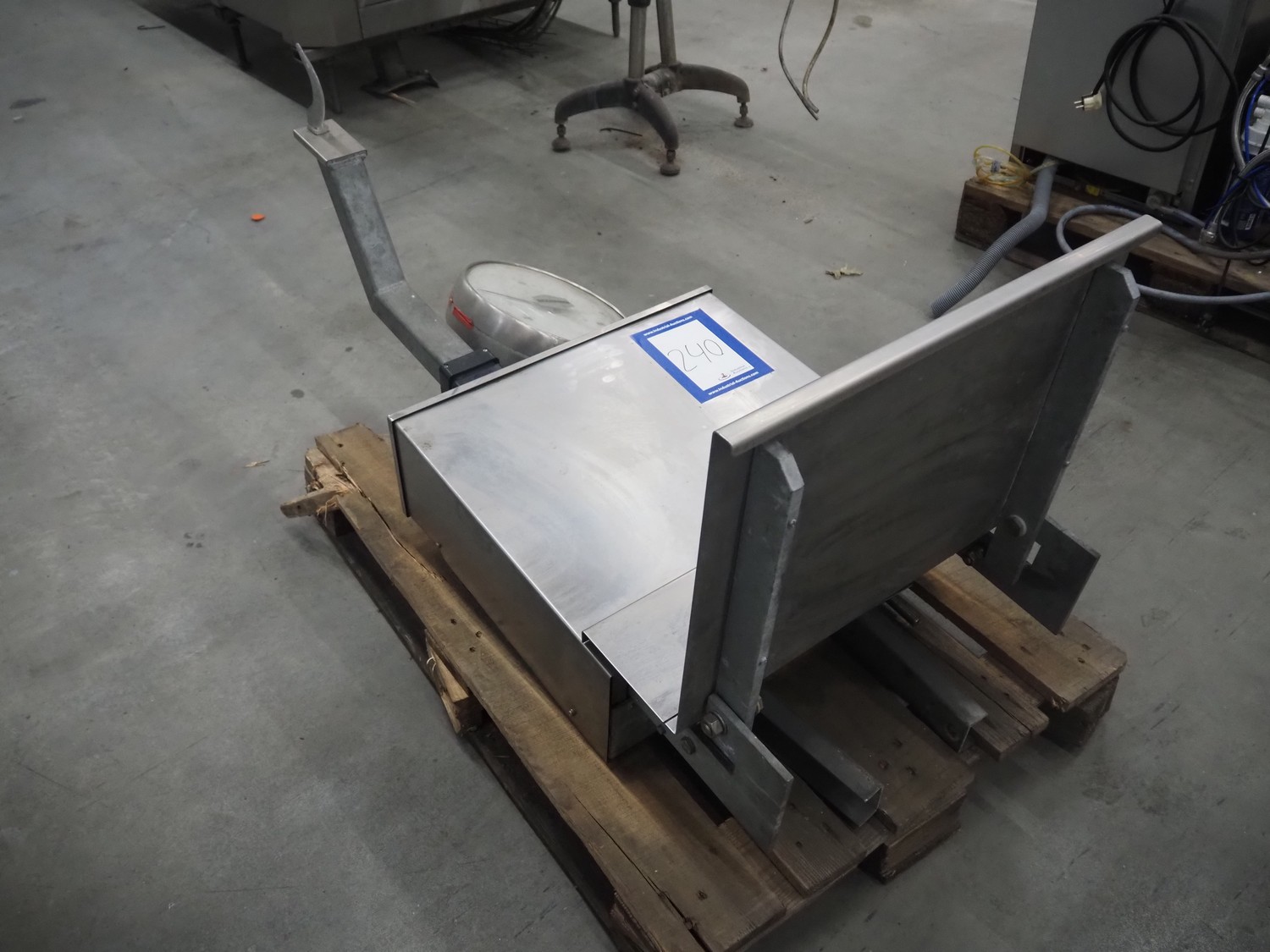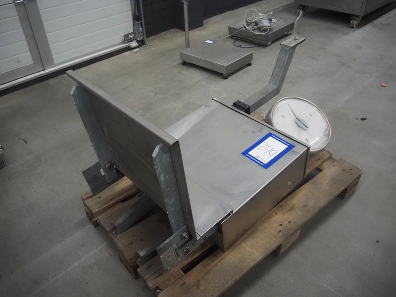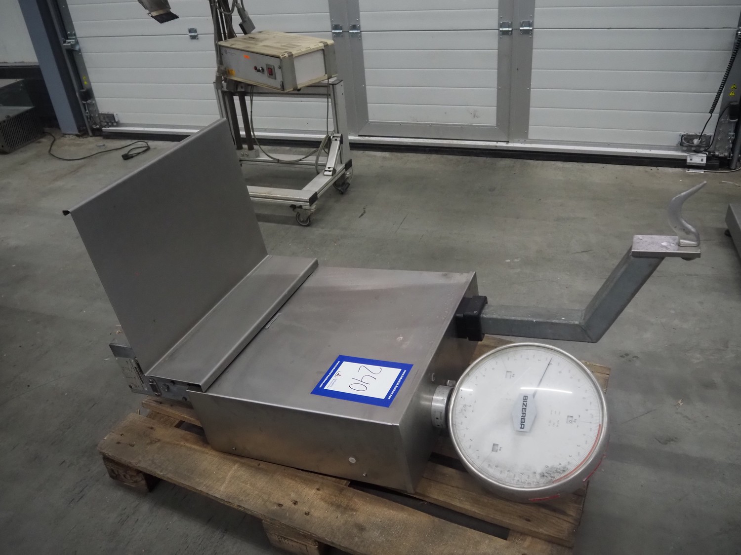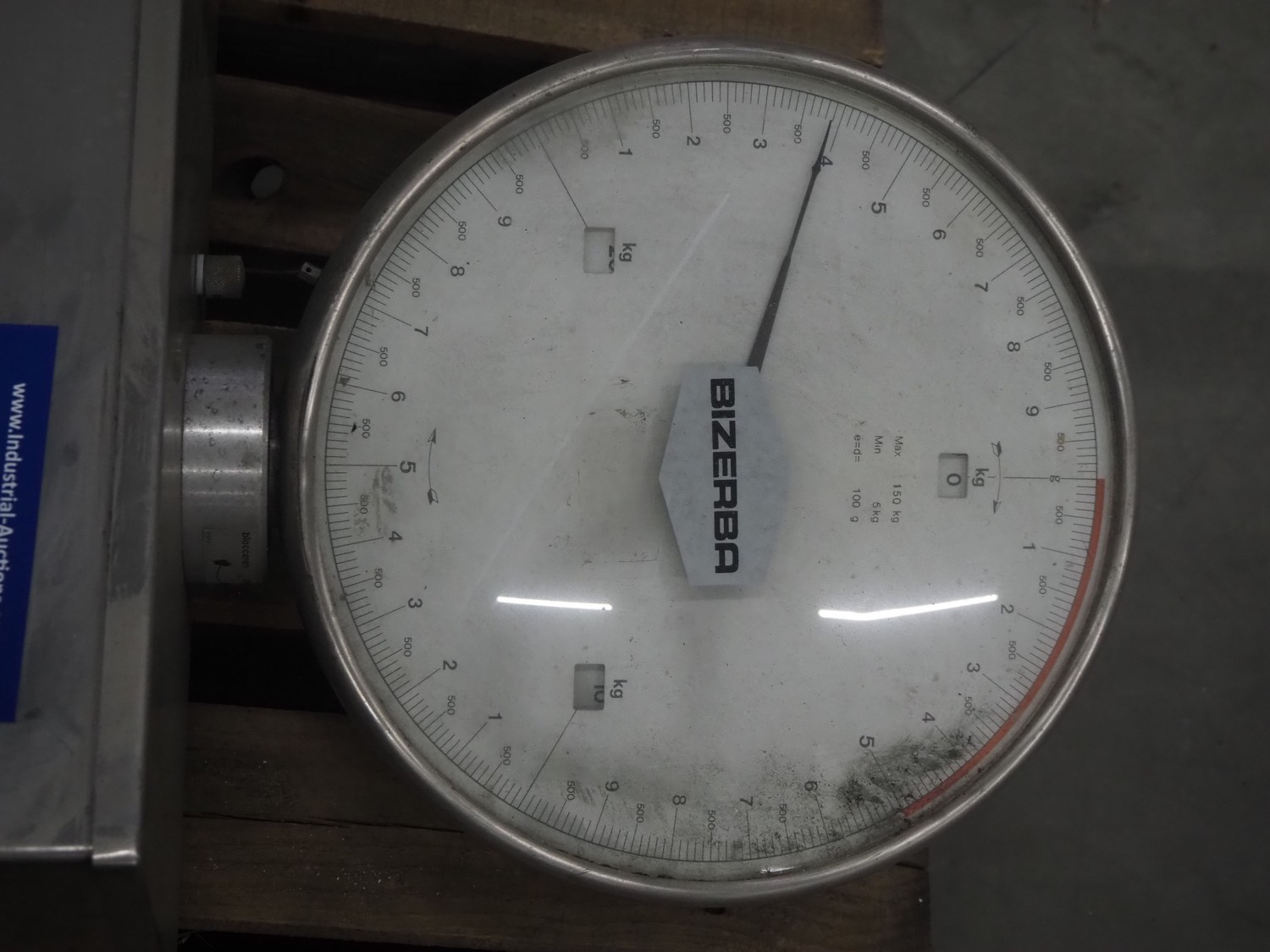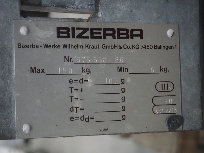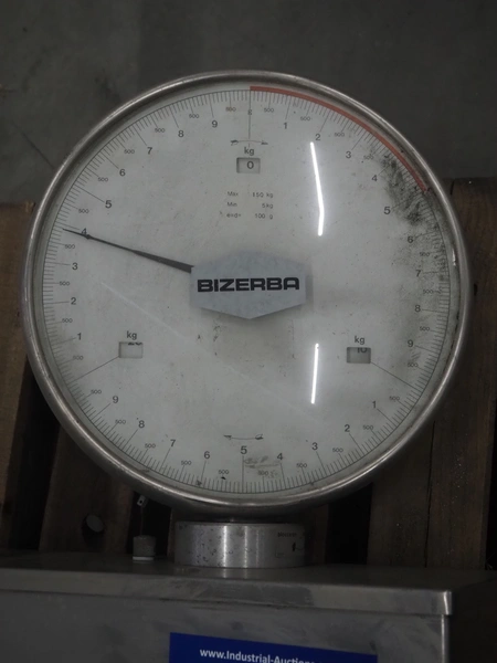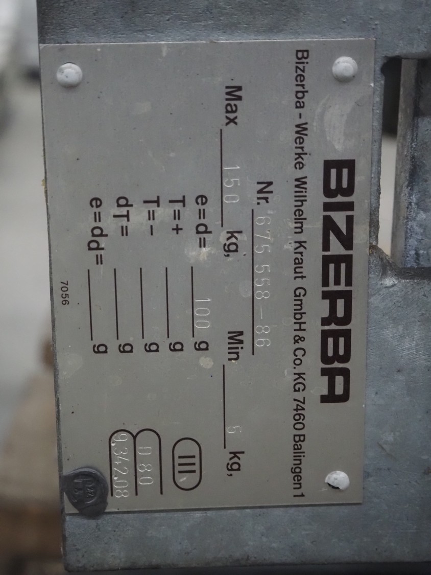 Bizerba hook weighing scale, number: 675 558-86, maximum weight: 150 kg, minimum weight: 5 kg, e=d= 100 gram, dimensions: 1200 mm x 600 mm x 600 mm.