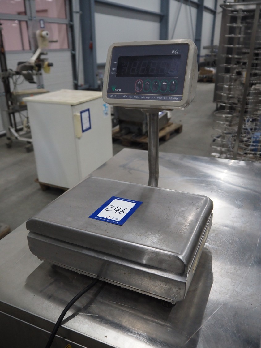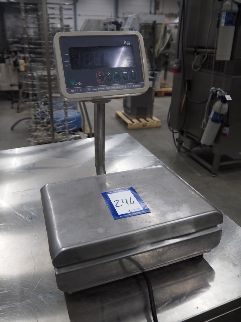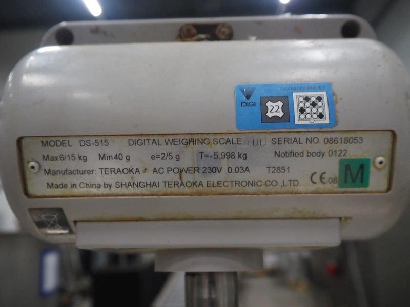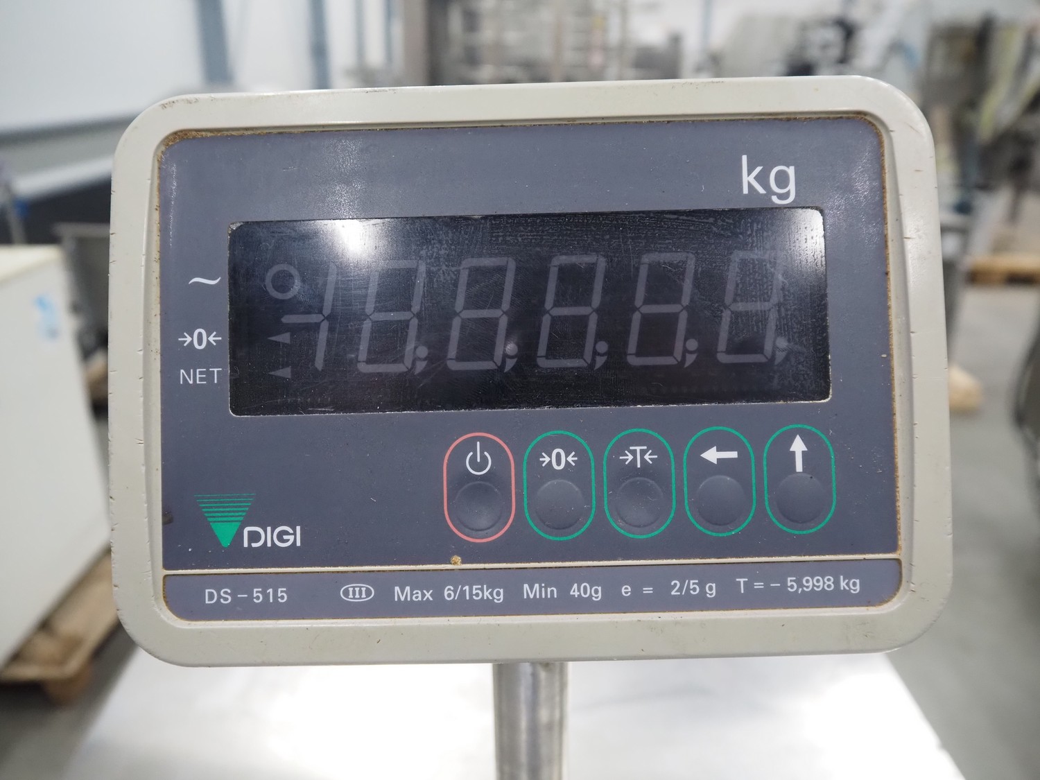 Digi Europe Ltd weighing scale, model: DS-515, maximum weight: 6/15 kg, minimum weight: 40 gram, e = 2/5 gram, T= -5.998 kg, dimensions: 340 mm x 320 mm x 450 mm.