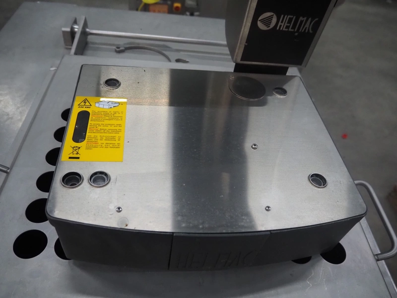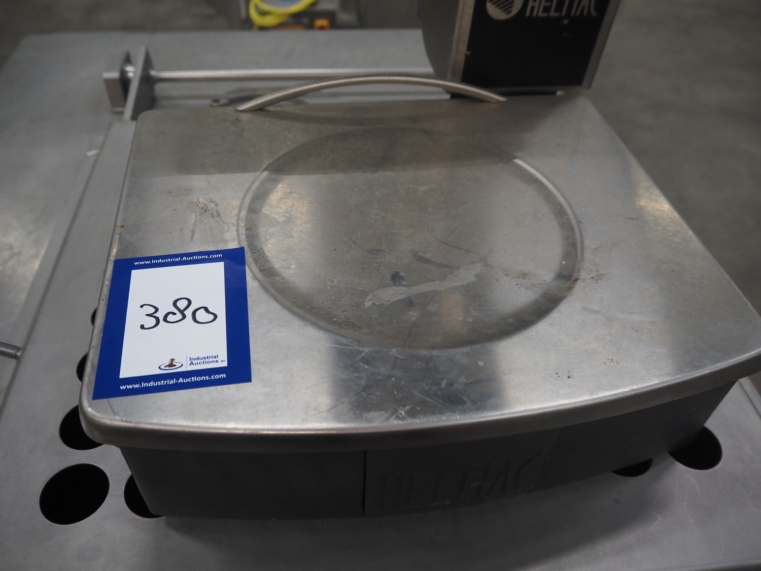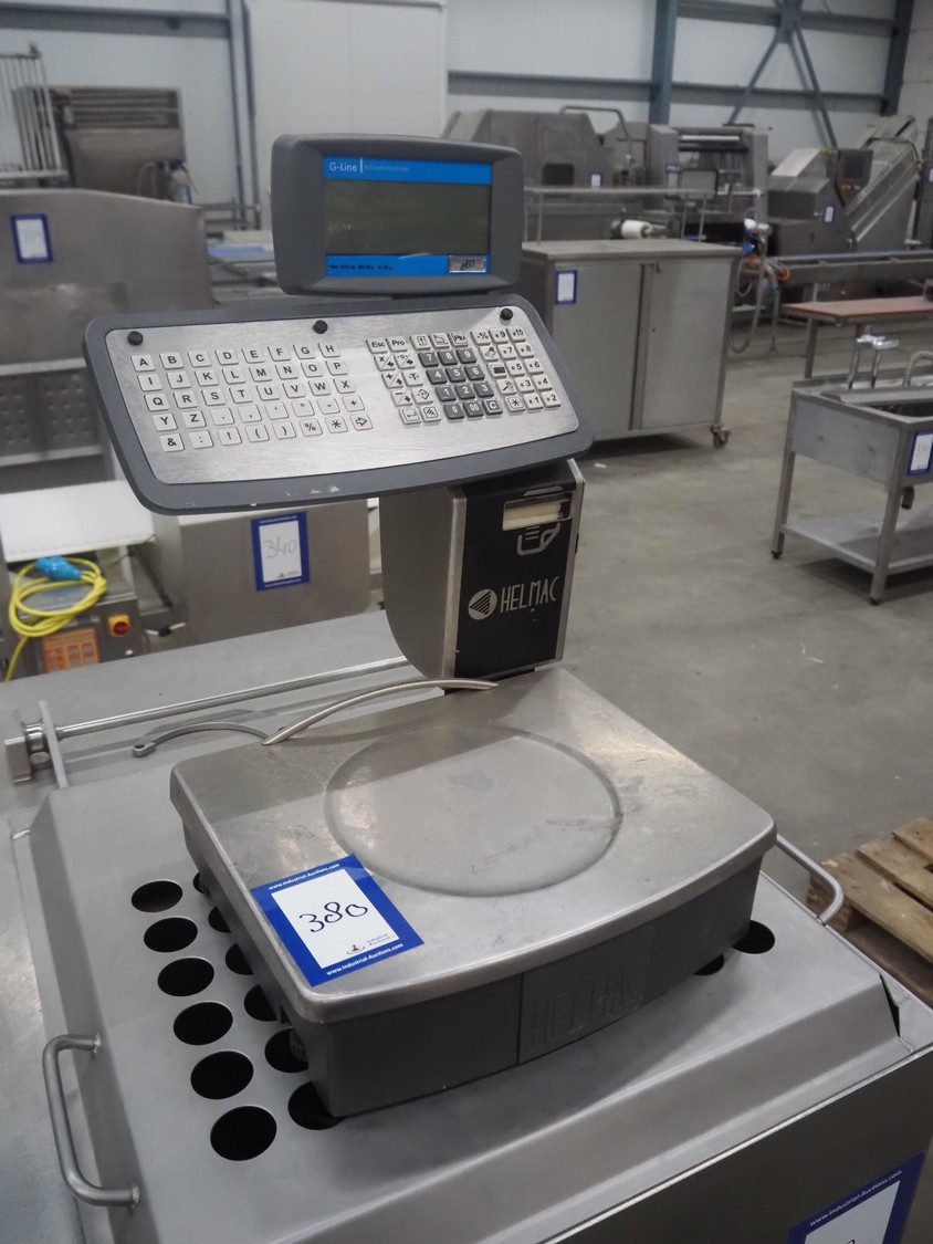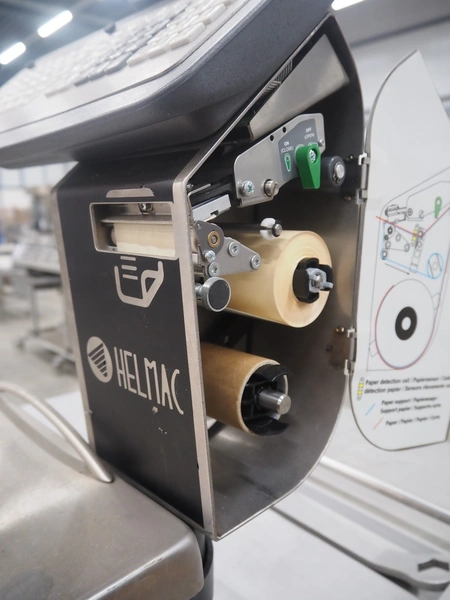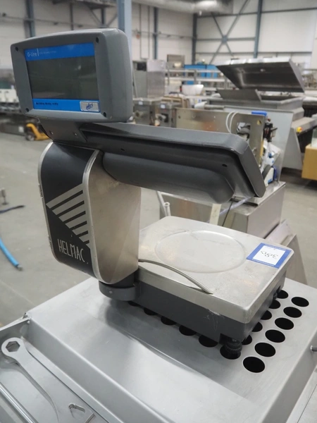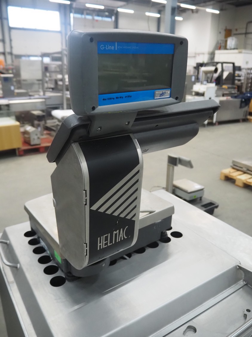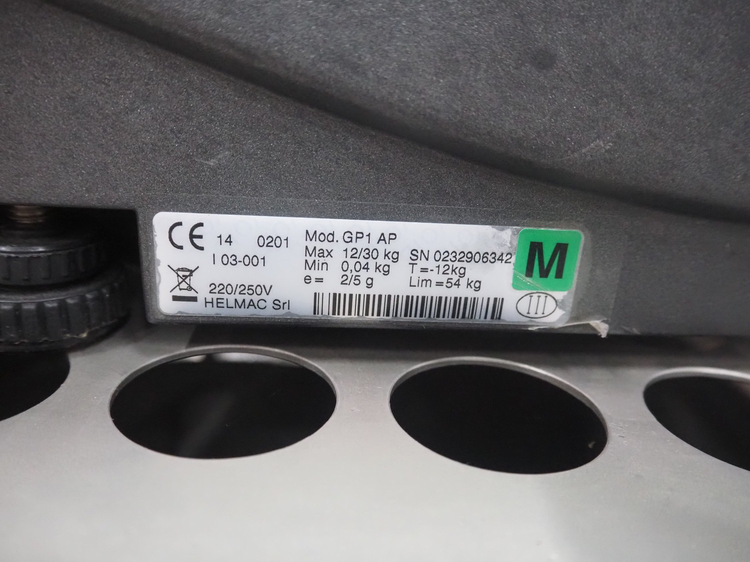 Helmac Srl weighing scale with label printer, model: GP1 AP, serial number: 0232906342, 220/250 V, maximum weight: 12/30 kg, minimum weight: 0.04 kg, e= 2/5 kg, T= -12 kg, Lim: 54 kg, dimensions: 440 mm x 370 mm x 560 mm.