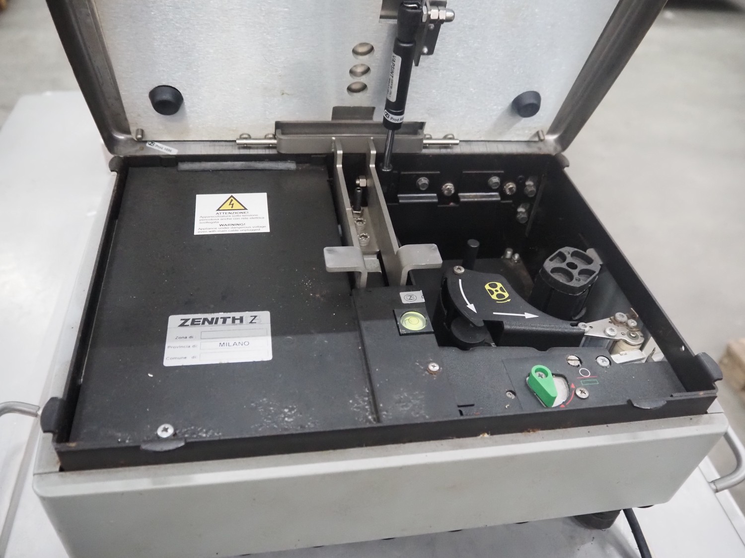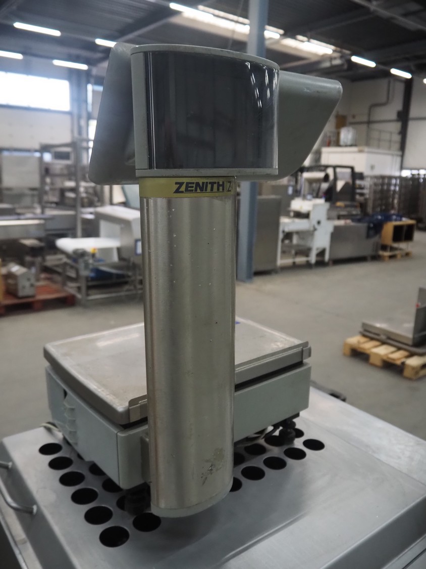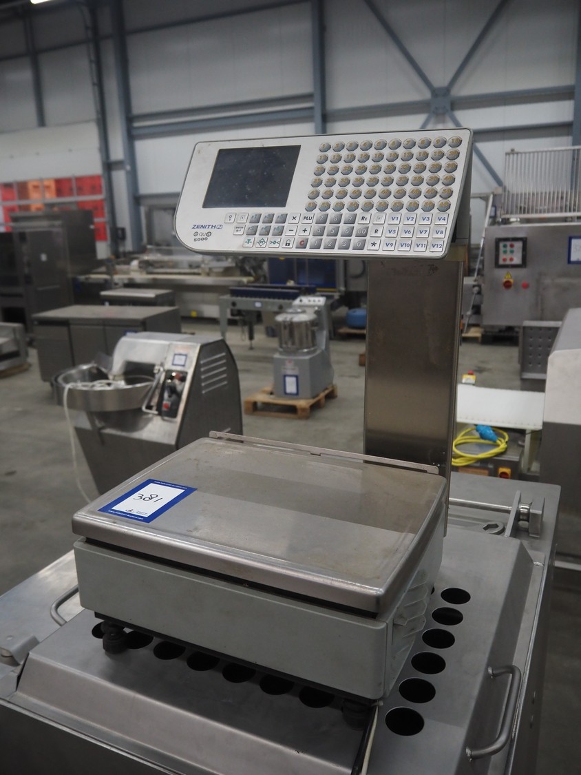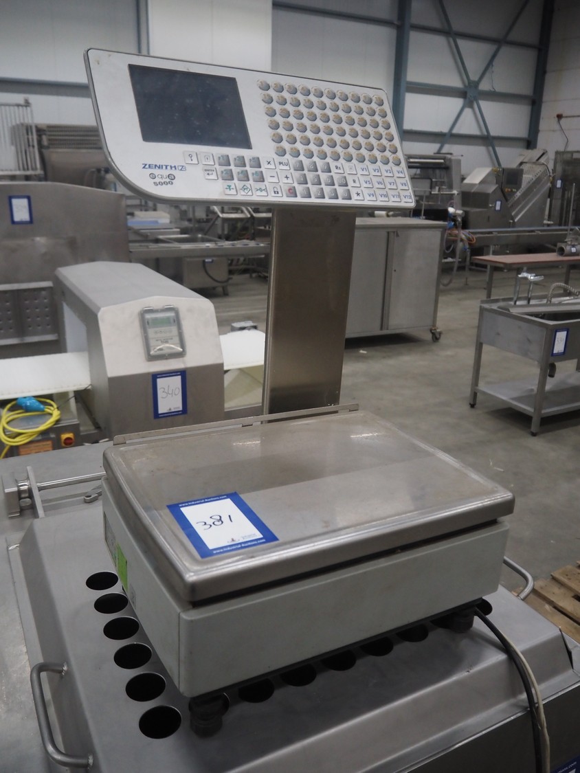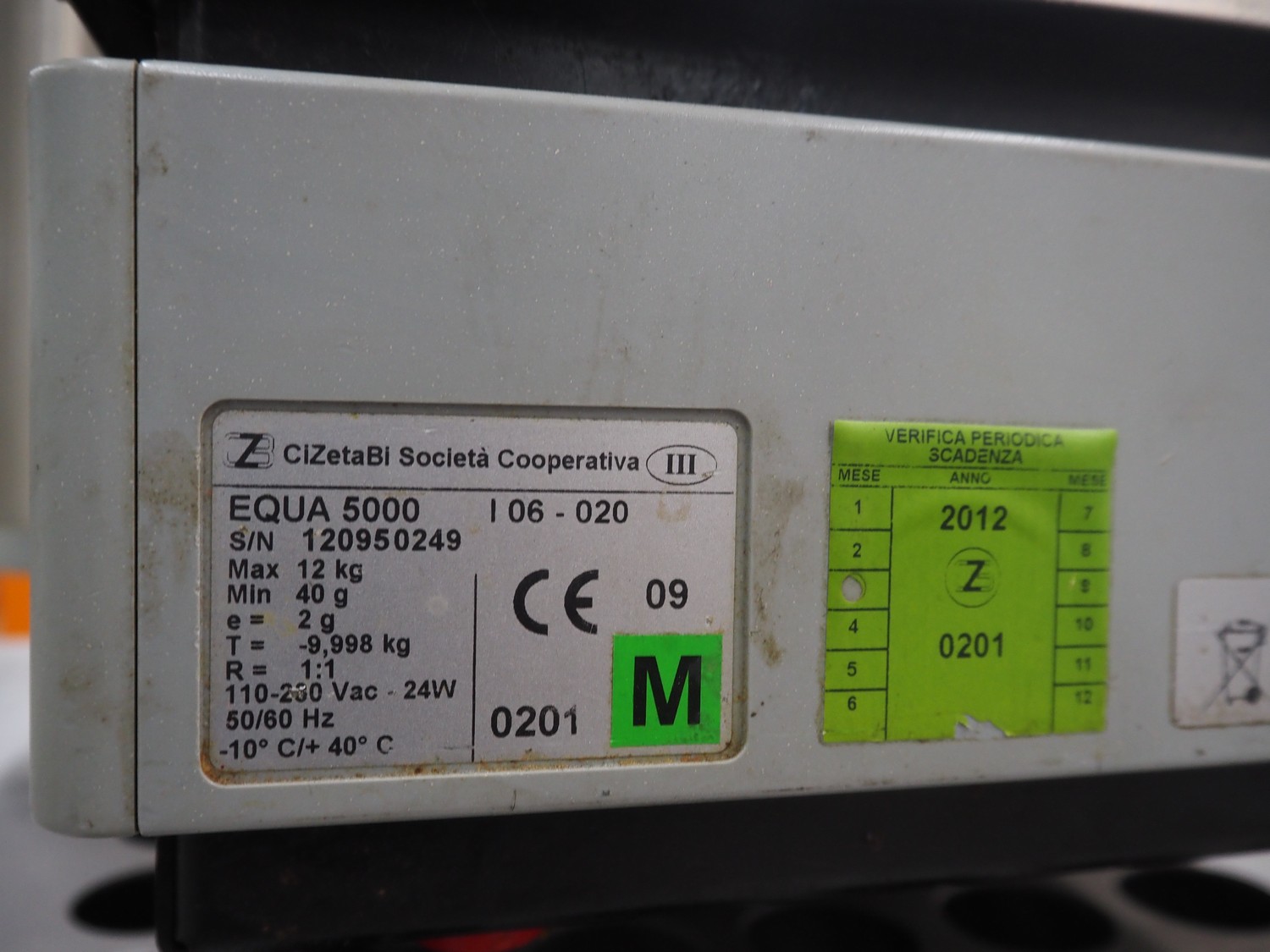 CZB weighing scale with label printer, model: EQUA 5000, serial number: 120950249, 110/230 V, 50/60 Hz, 24 W, maximum capacity: 12 kg, minimum capacity: 40 g, e= 2 g, T = -9.998 kg, dimensions: 500 mm x 360 mm x 480 mm.