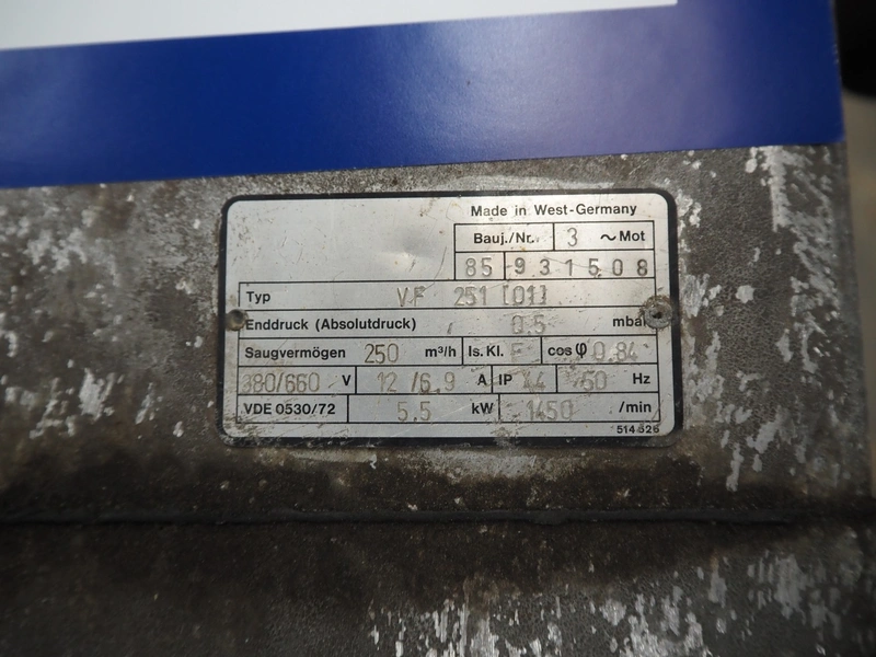 Rietschle vacuum pump, type: VF 251 01, number: 931508, year of construction: 1985, capacity: 250 m³ per hour, dimensions: 850 mm x 650 mm x 1130 mm.
