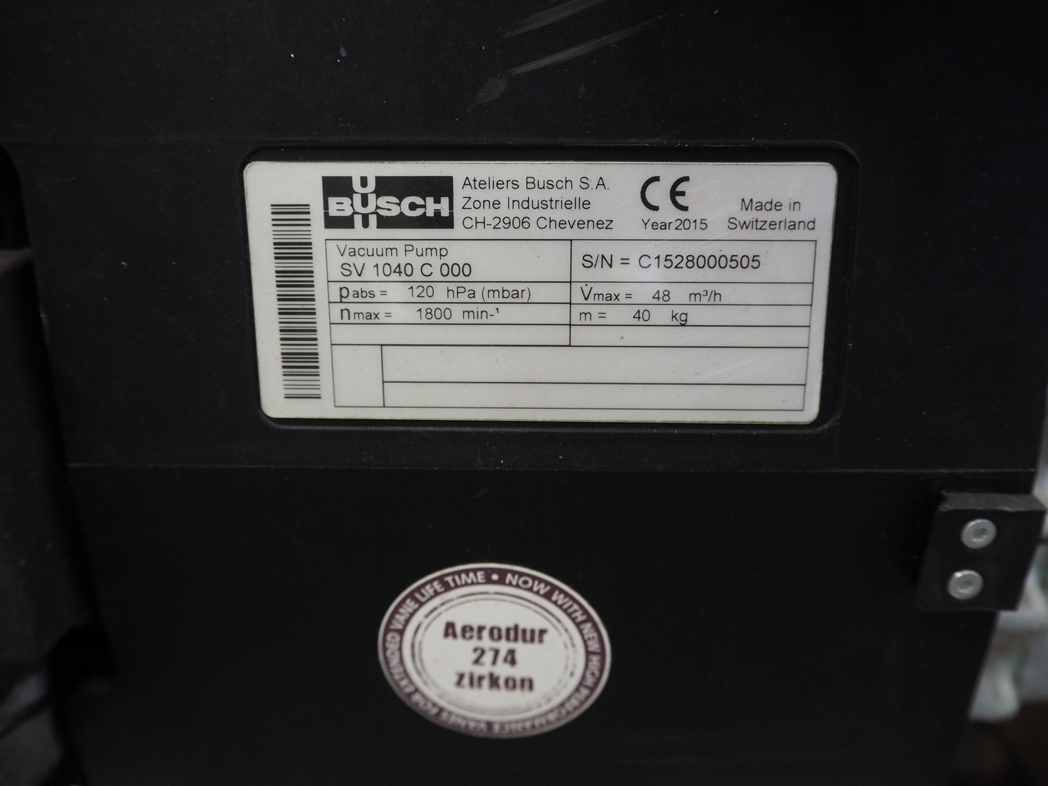 Busch vacuum pump, type: SV 1040 C 000, serial number: C1528000505, weight: 40 kg, capacity: 48 m³ per hour, dimensions: 600 mm x 500 mm x 550 mm.