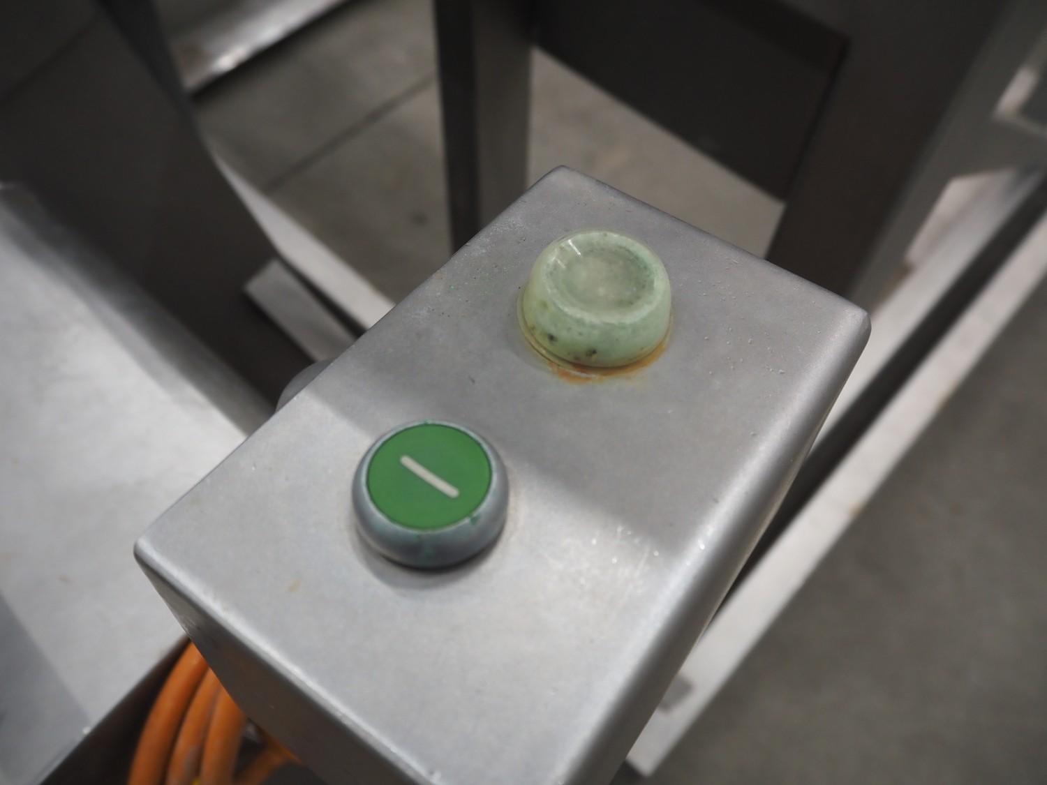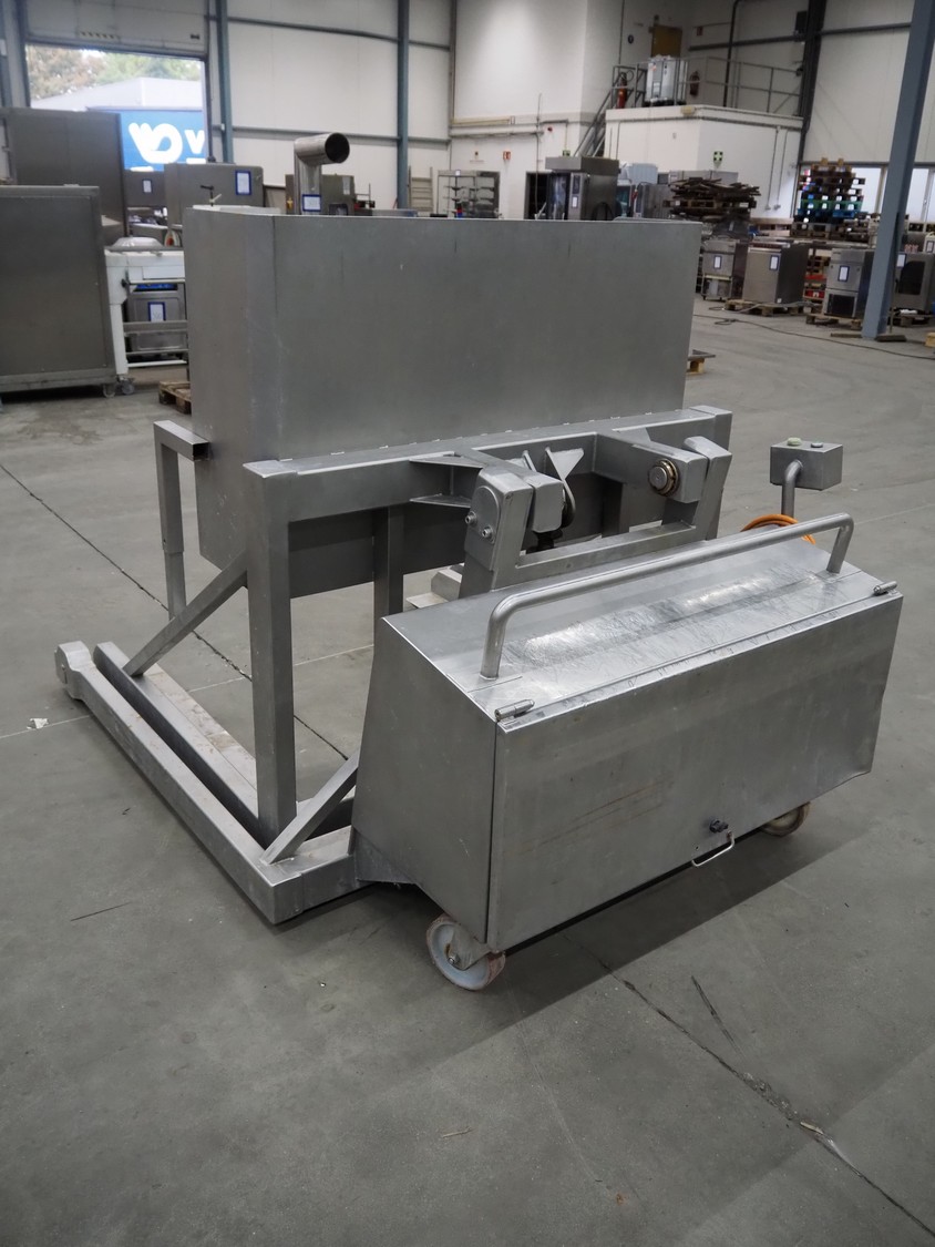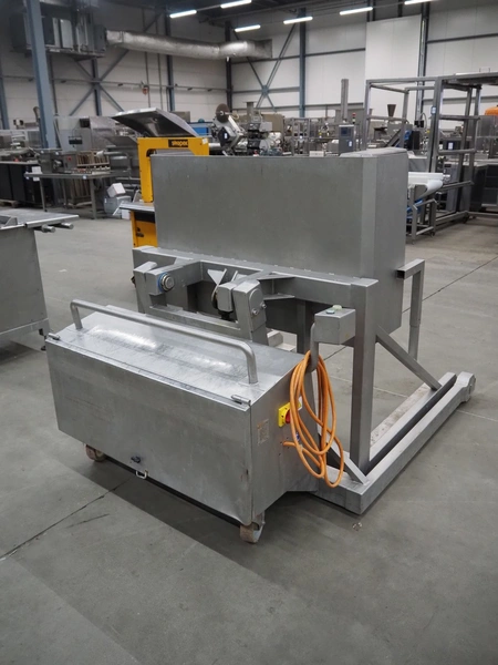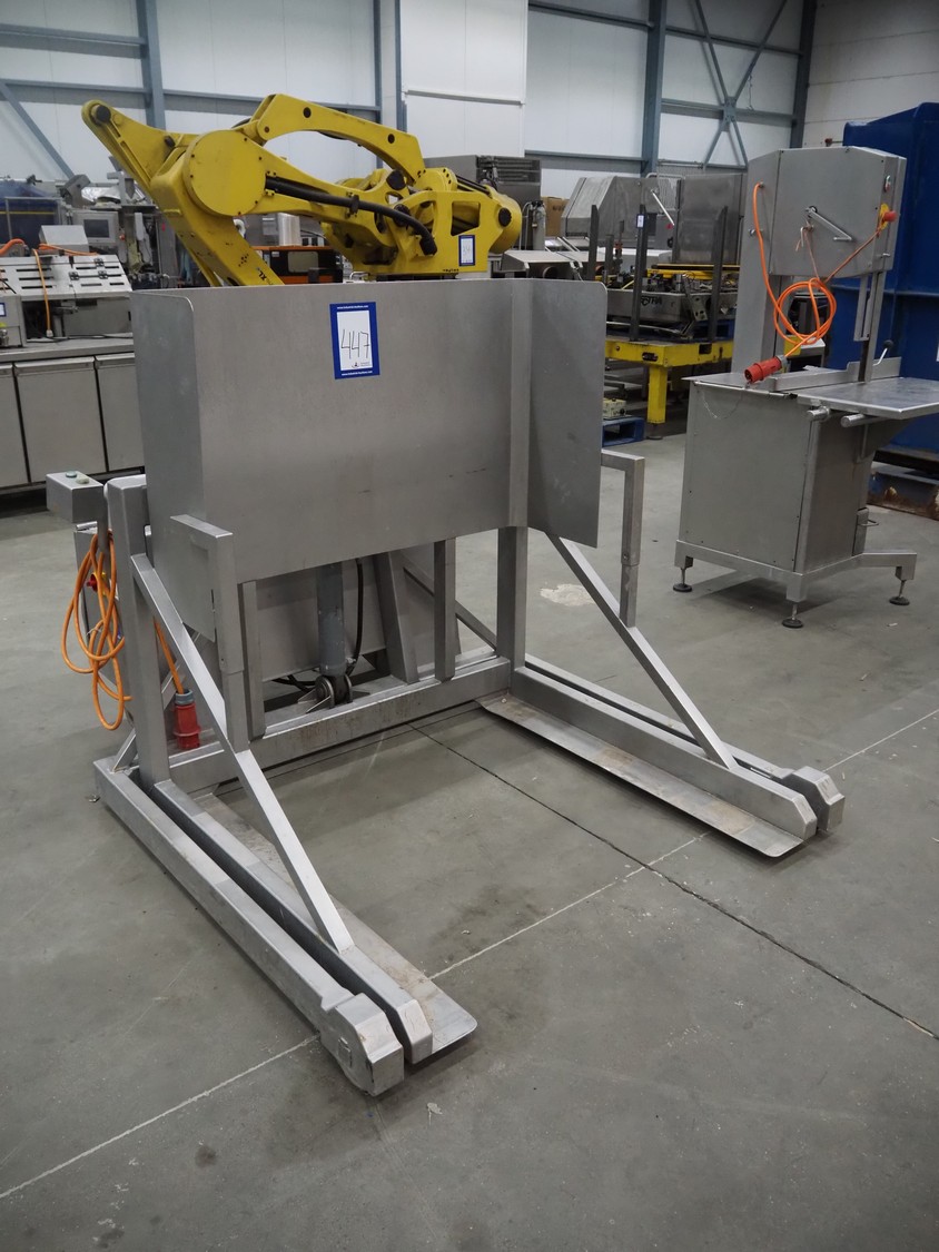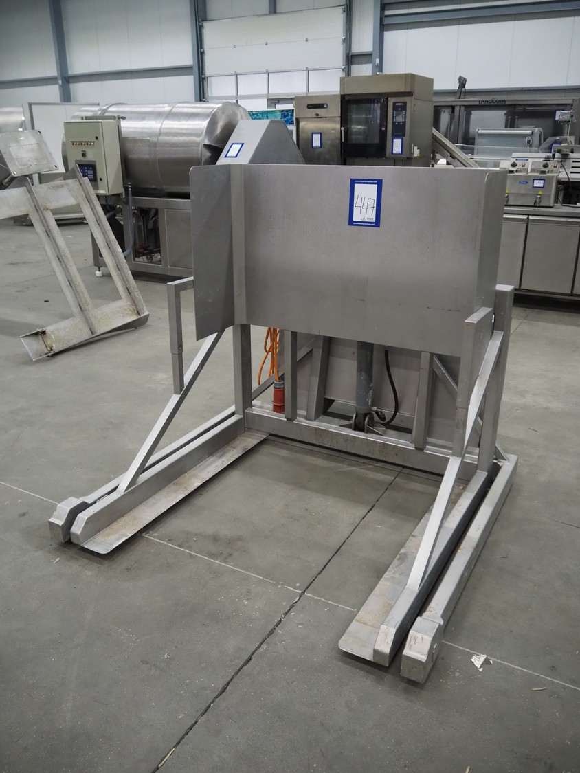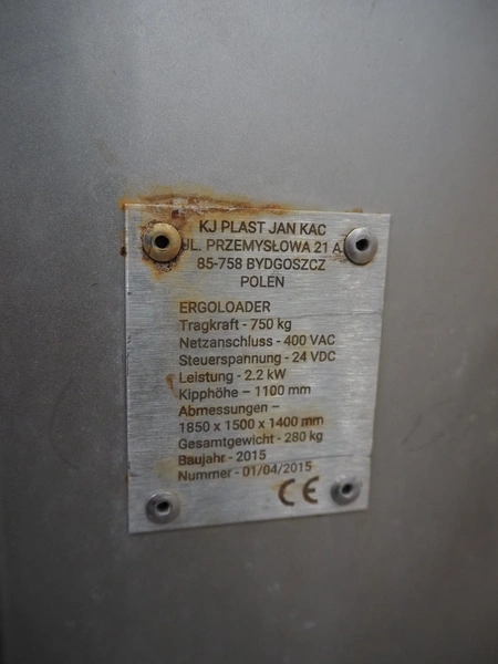 KJ Plast JAN KAC tilting device for pallet boxes, model: Eroloader, number: 01/04/2015, year of construction: 2015, 400 V, 2.2 kW, weight: 280 kg, loading capacity: 750 kg, lifting height: 1100 mm, total dimensions: 1850 mm x 1500 mm x 1400 mm.