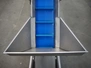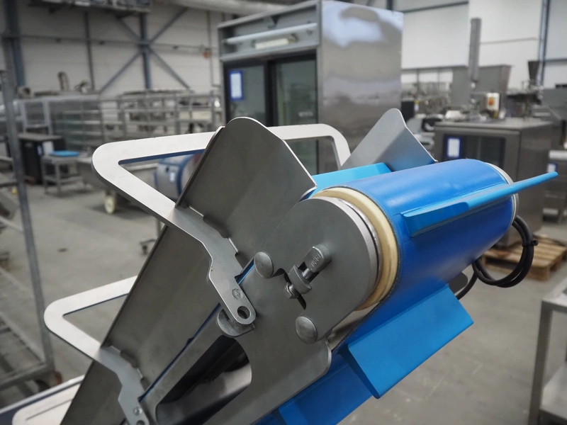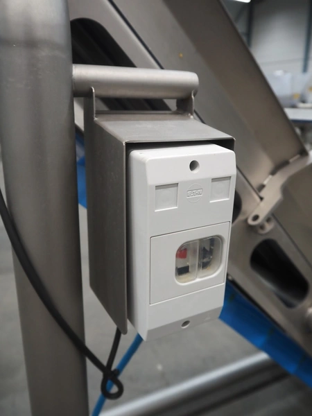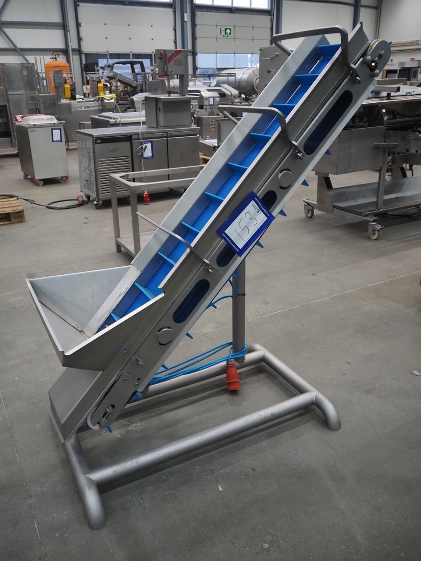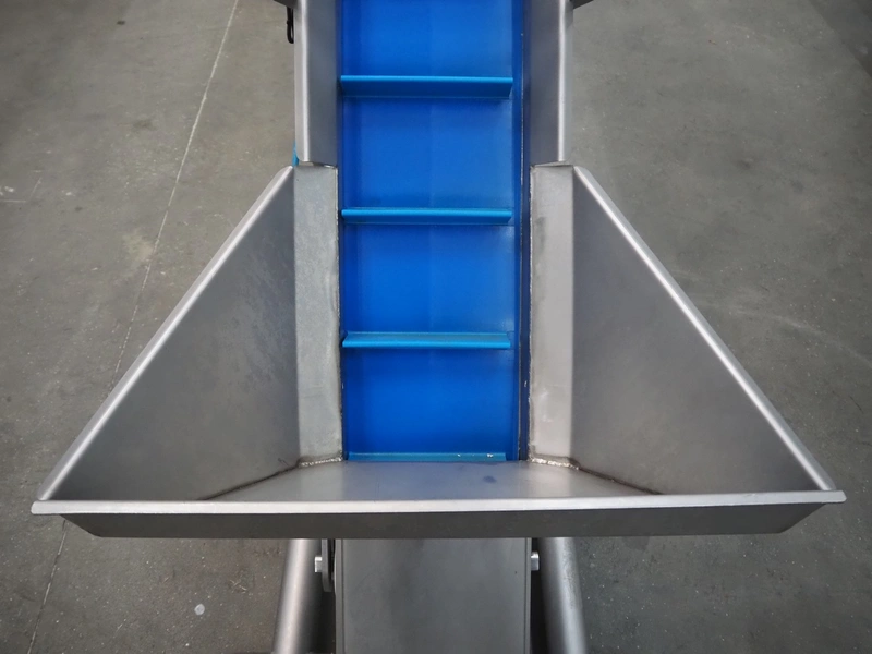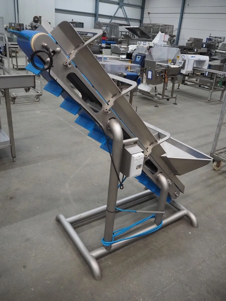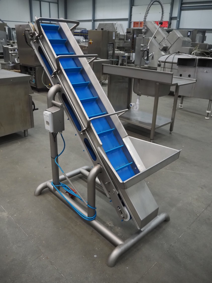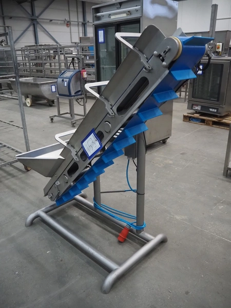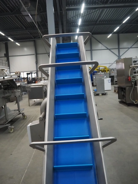 Elevating belt with dividers, s/s frame, plastic belt, belt width: 210 mm, elevating height: 1400 mm, distance between dividers: 140 mm, divider height: 50 mm, total dimensions: 1500 mm x 700 mm x 1550 mm.