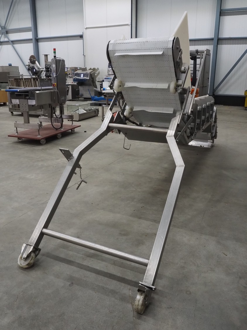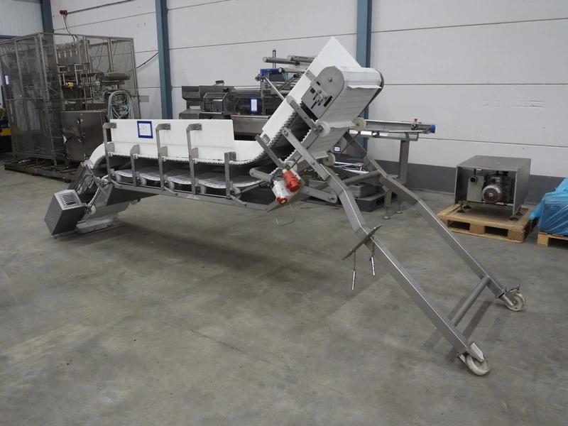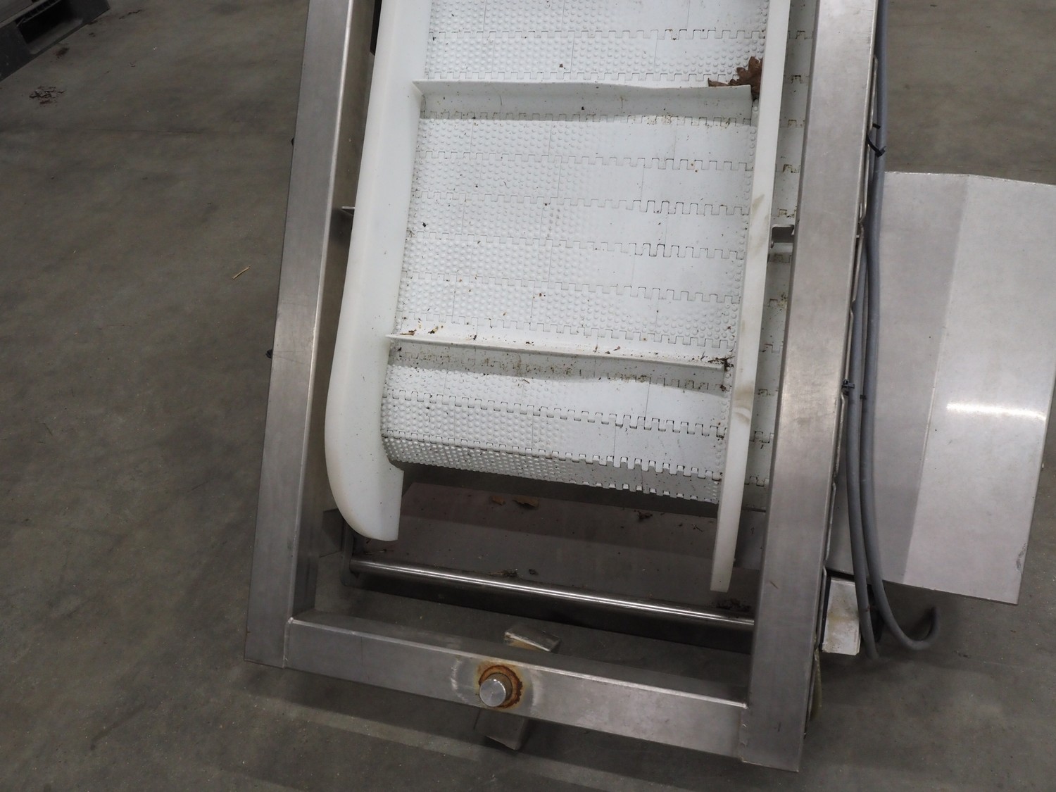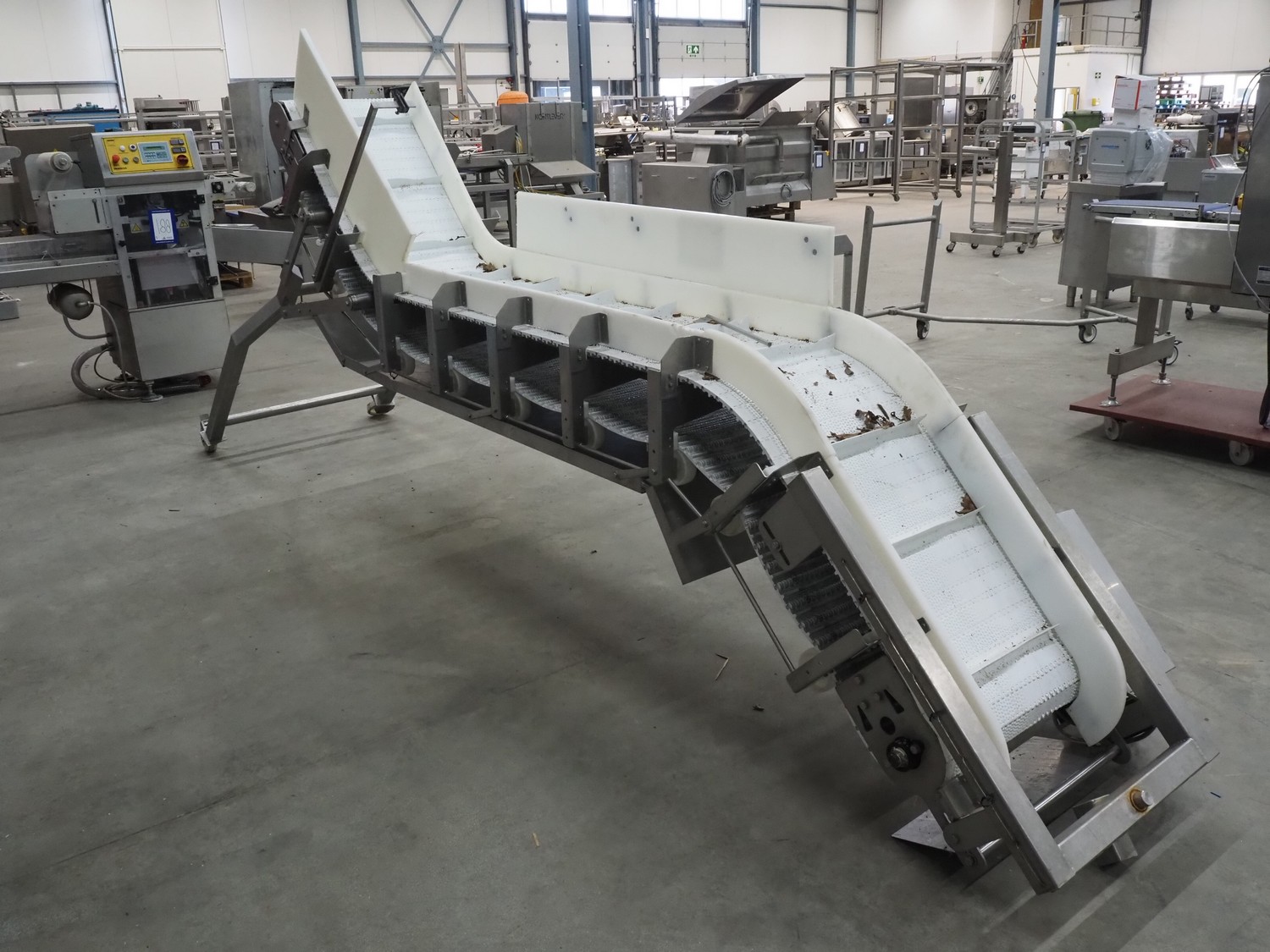 Mobile elevating belt with dividers, s/s frame, plastic belt, belt width: 550 mm, divider height: 50 mm, distance between dividers: 300 mm, total dimensions: 4500 mm x 950 mm x 1800 mm. Missing frame.