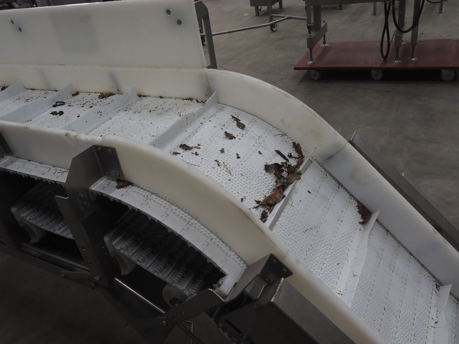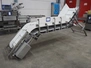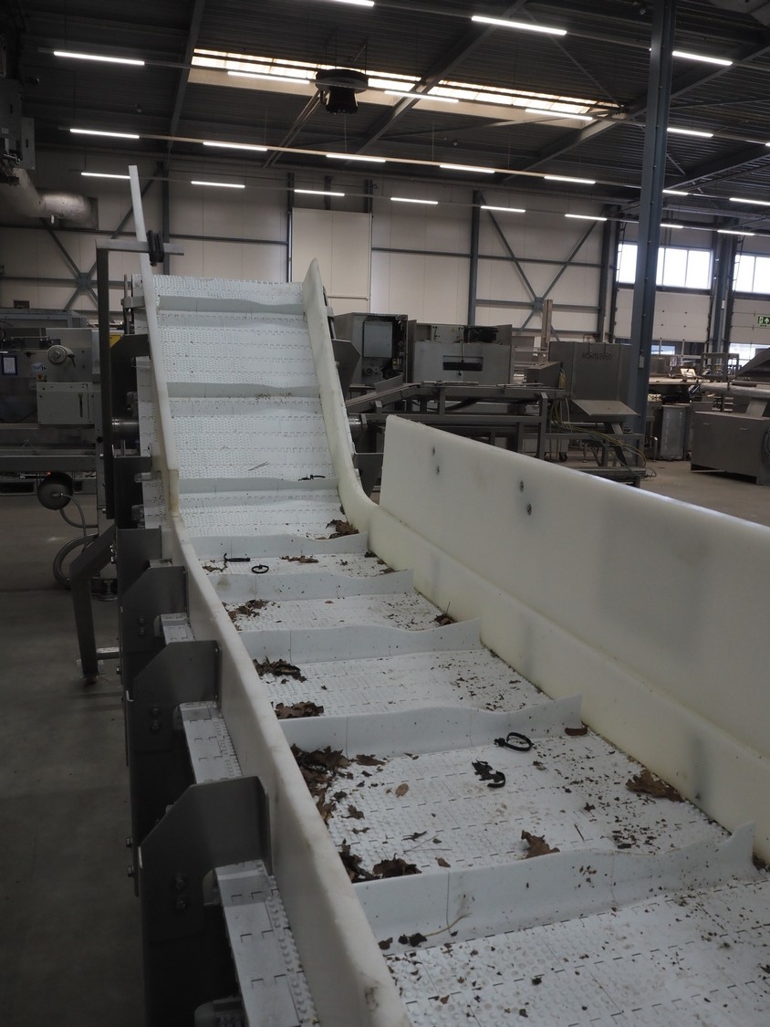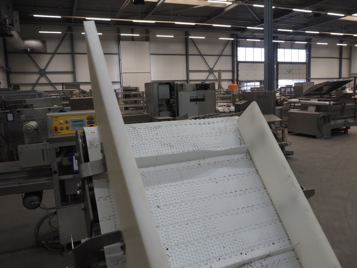 Mobile elevating belt with dividers, s/s frame, plastic belt, belt width: 550 mm, divider height: 50 mm, distance between dividers: 300 mm, total dimensions: 4500 mm x 950 mm x 1800 mm. Missing frame.